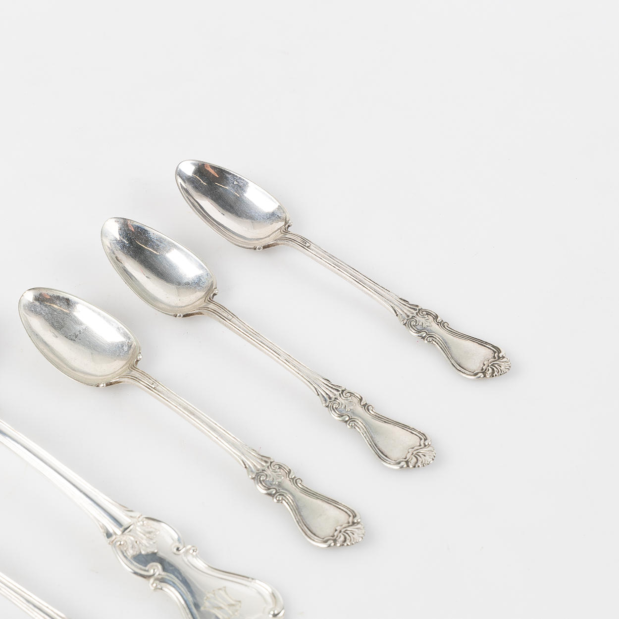 5 st små skedar, längd 14 cm. Märkta A5, 1855, importstämpel, namnstämpel GD.