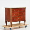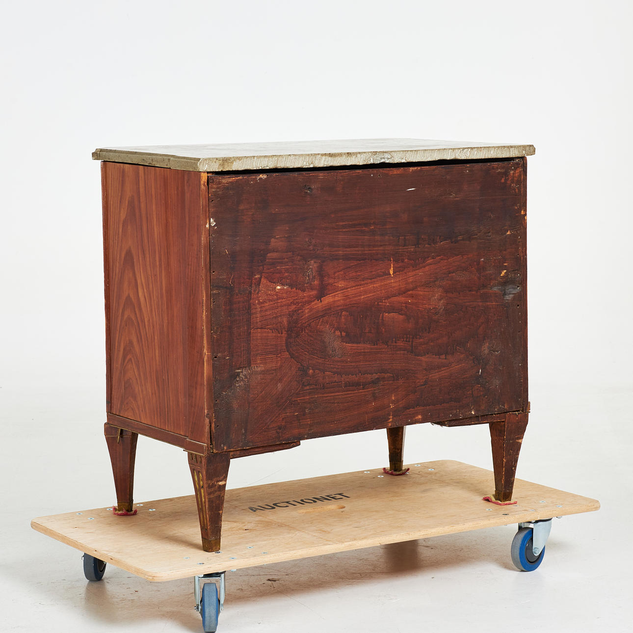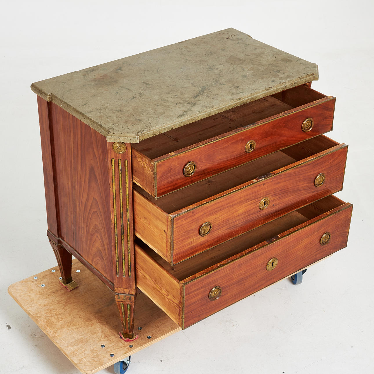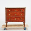 Fanérad med mahogny, beslag och lister i mässing, kannelerad dekor, kalkstensskiva