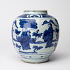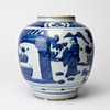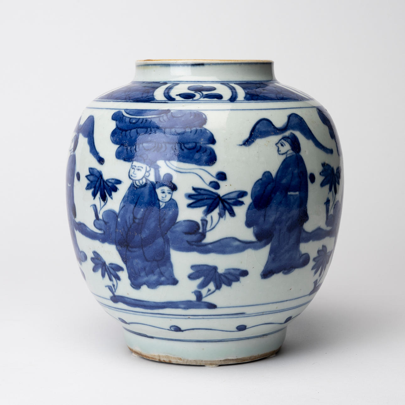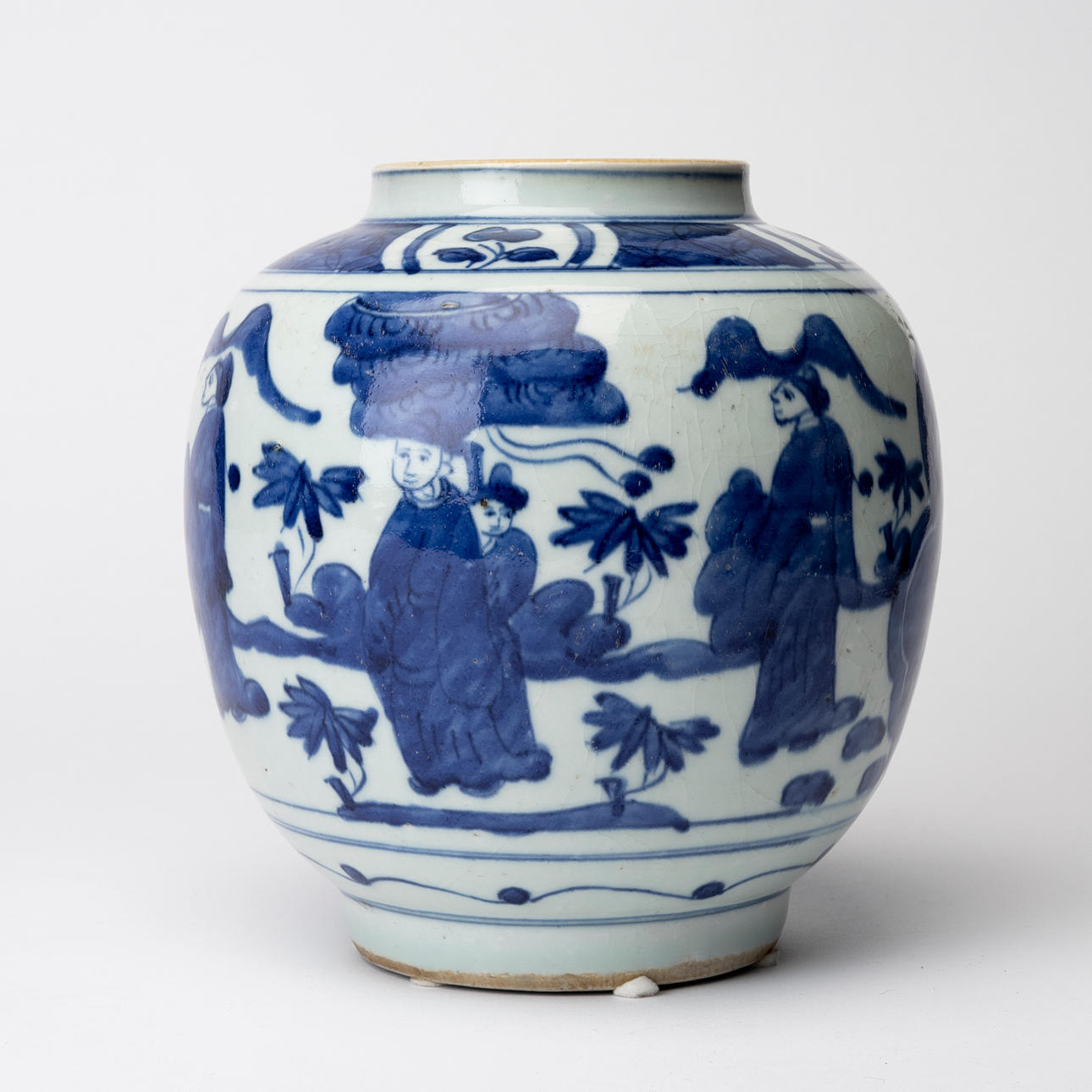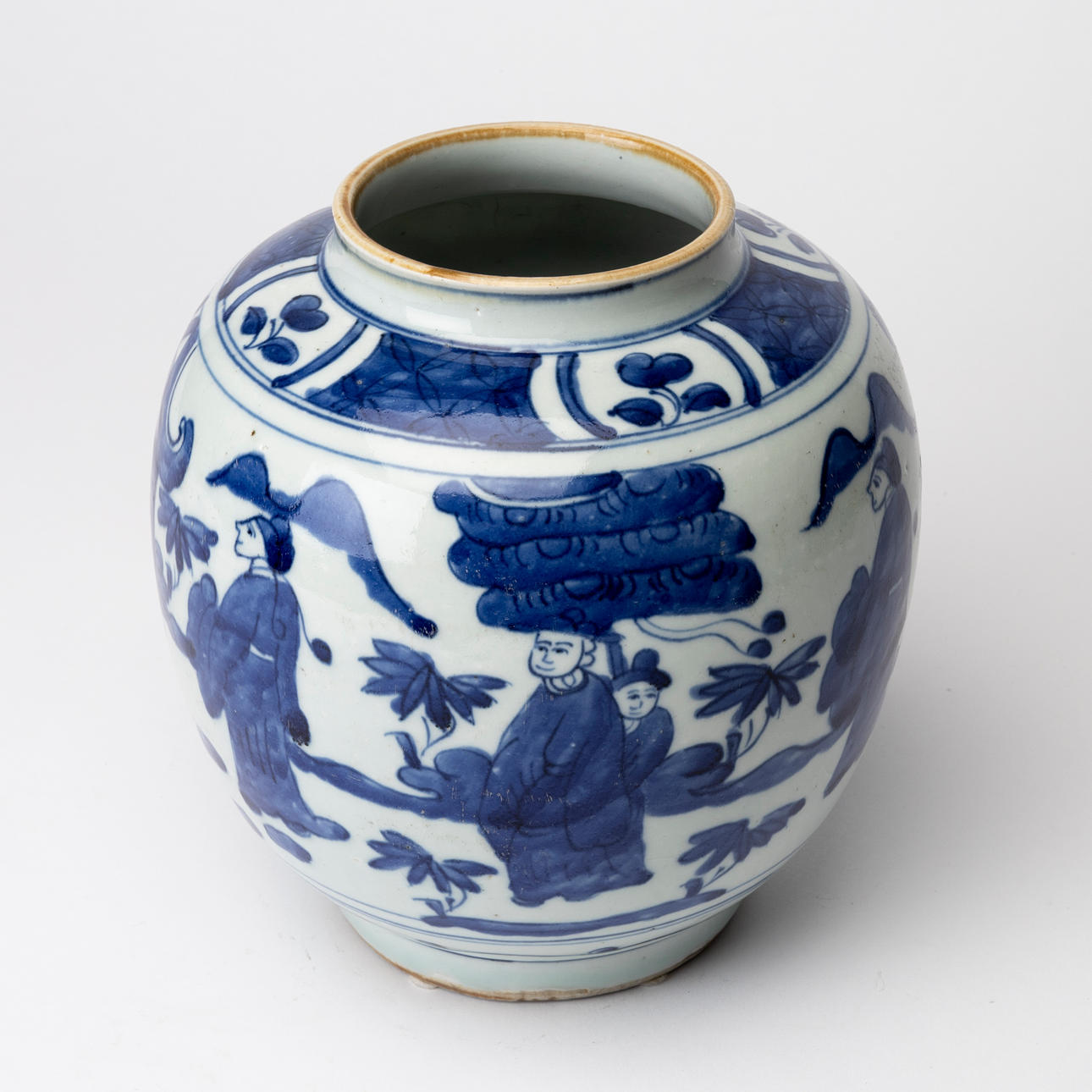 Underglasyrsblått måleri med dekor av figurscener. Höjd ca 20 cm.