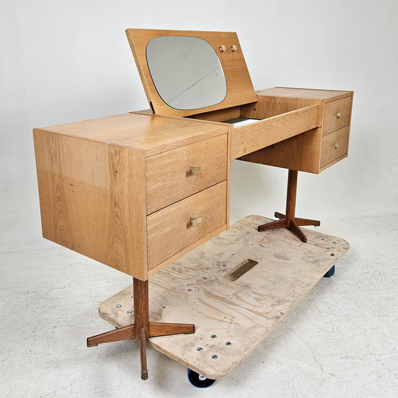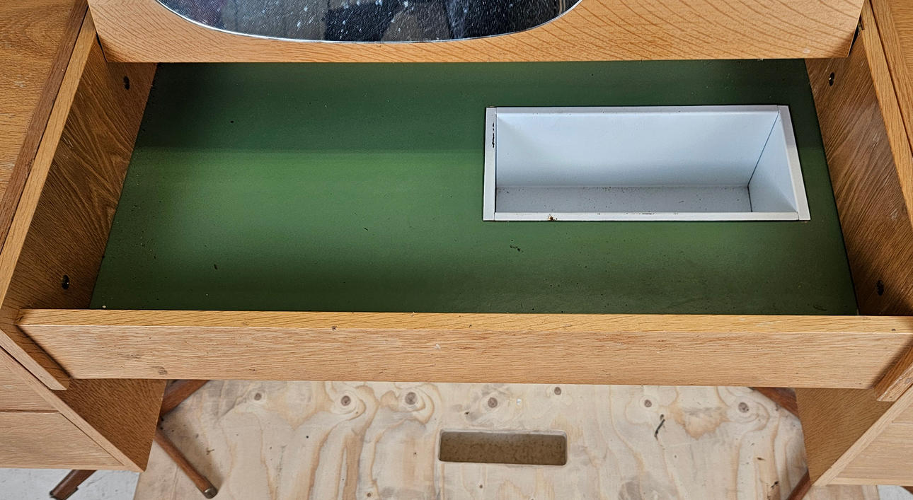 Ek, med lådor, uppfällbar spegel.