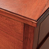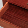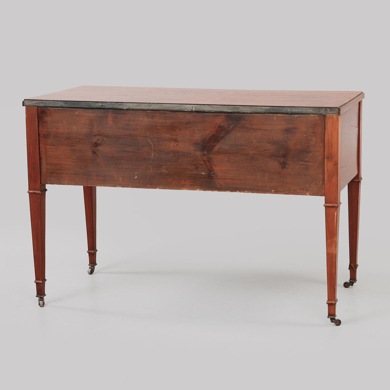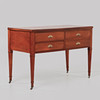 Fanerat med mahogny. Fyra utdragdslådor i två varv. På trissor. Bredd 111 cm, djup 52 cm, höjd ca 74 cm.