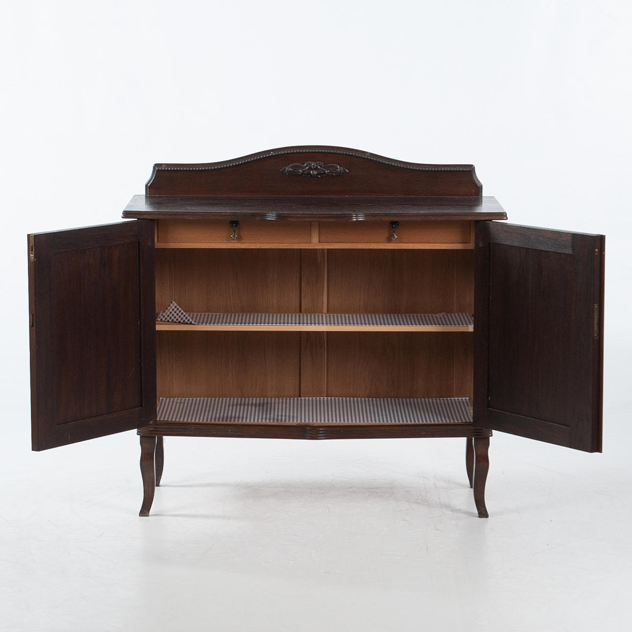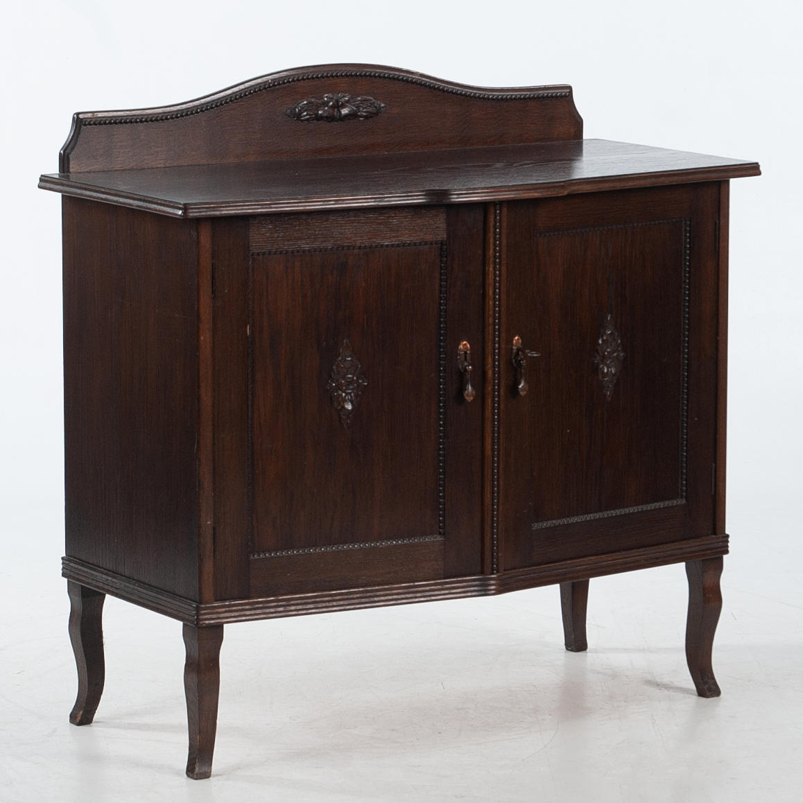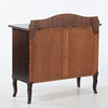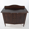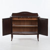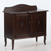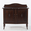 Fanerad stomme. Svängd front med två skåpdörrar, invändigt hyllplan. Dekor av pärlstav, snidad blomornamentik samt svängd krönlist. Stående på svängda ben.