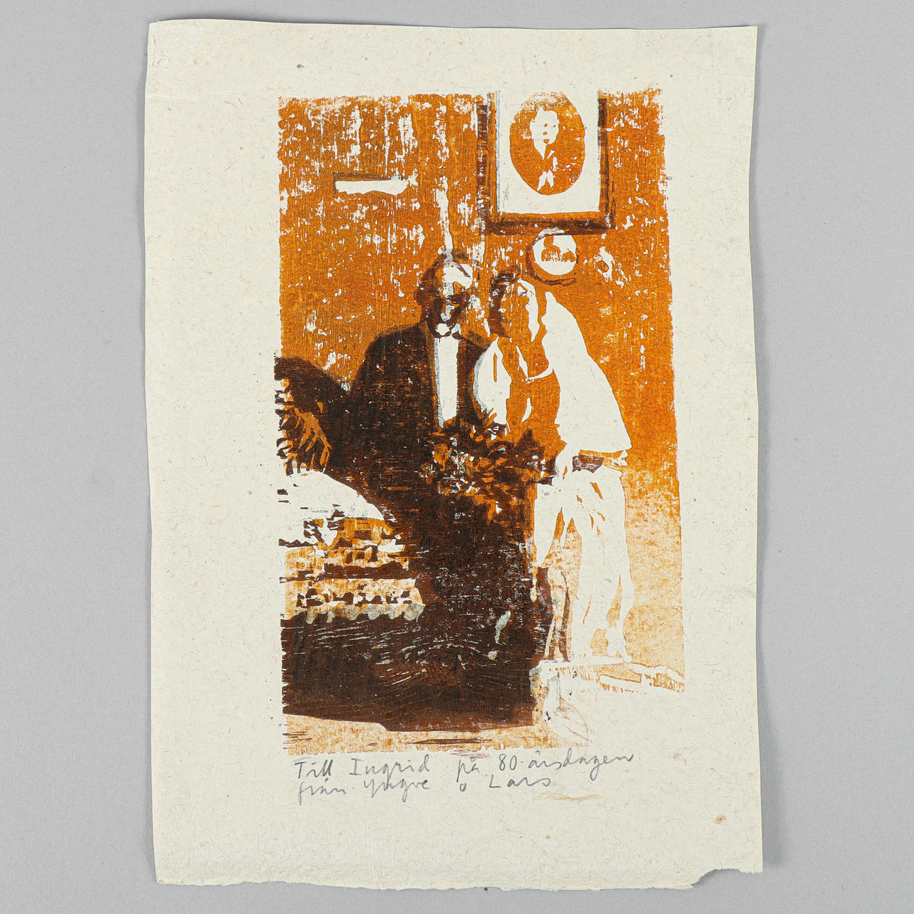 Träsnitt i färger. Signerad med dedikation "Till Ingrid på 80-årsdagen från Yngve o Lars".
