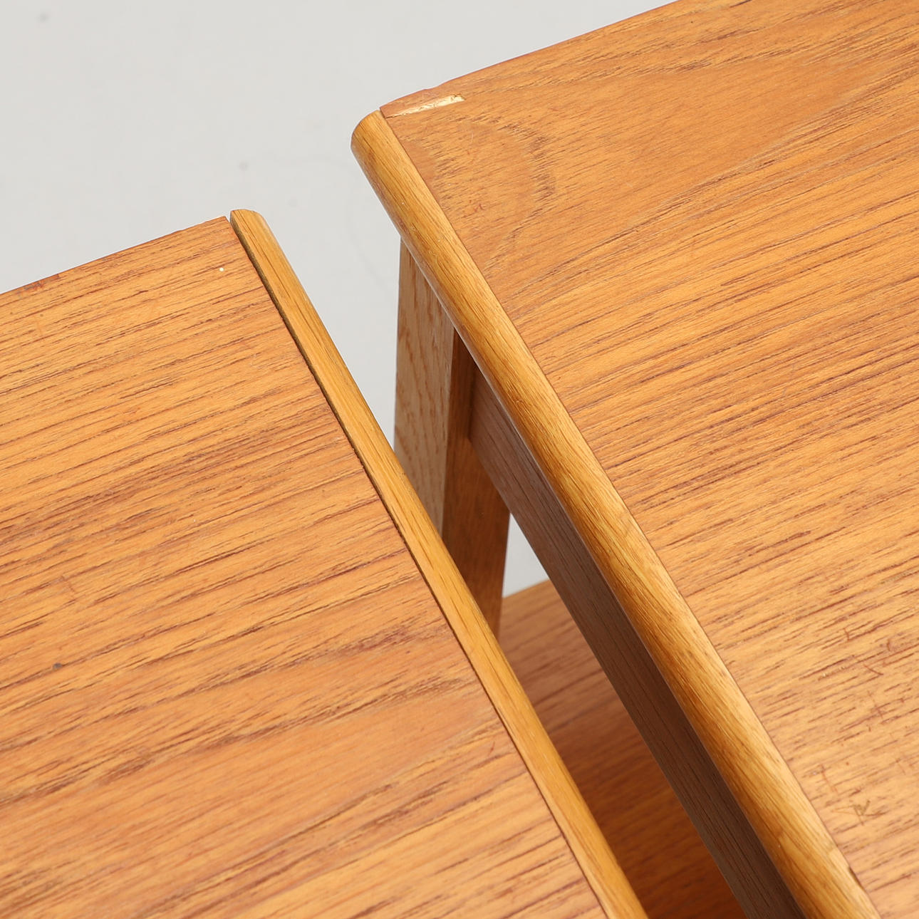 Bruksslitage. En av listerna på den övre bordsskivan något lös i bakre kant. Smärre fanerskador på ena bordsskivan.