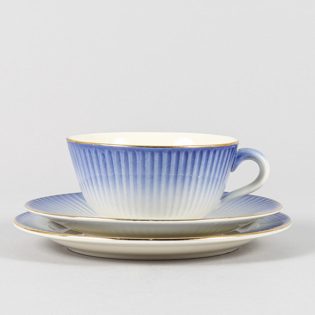 6 tekoppar med fat och assietter.