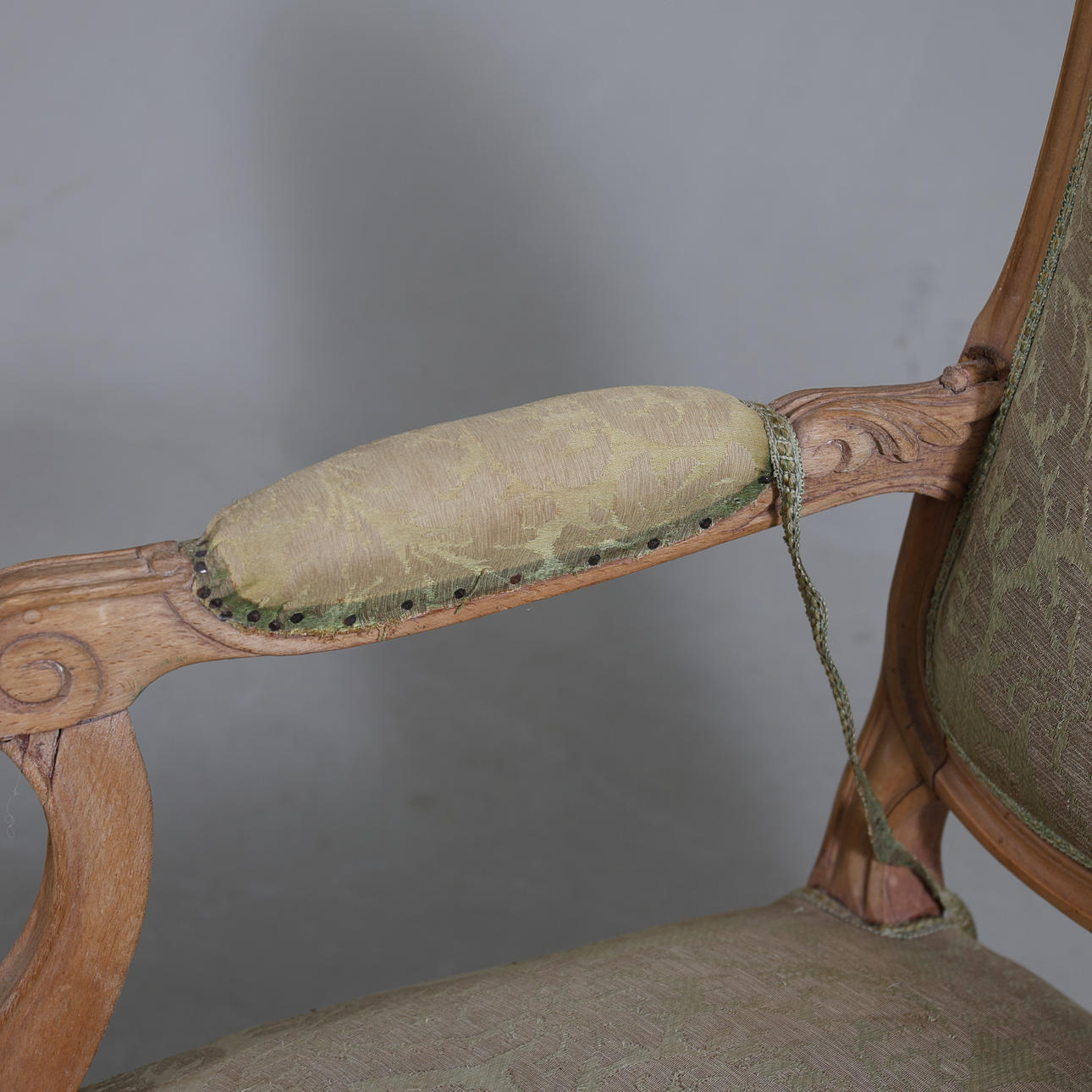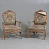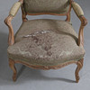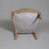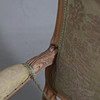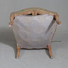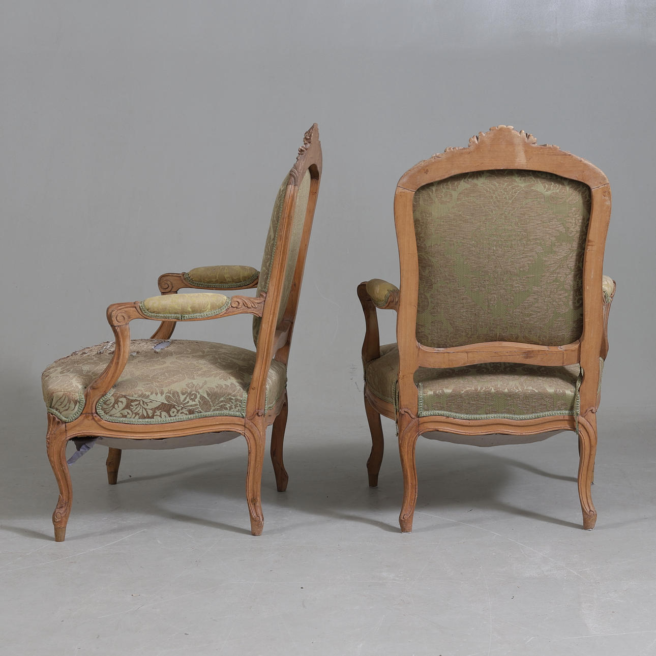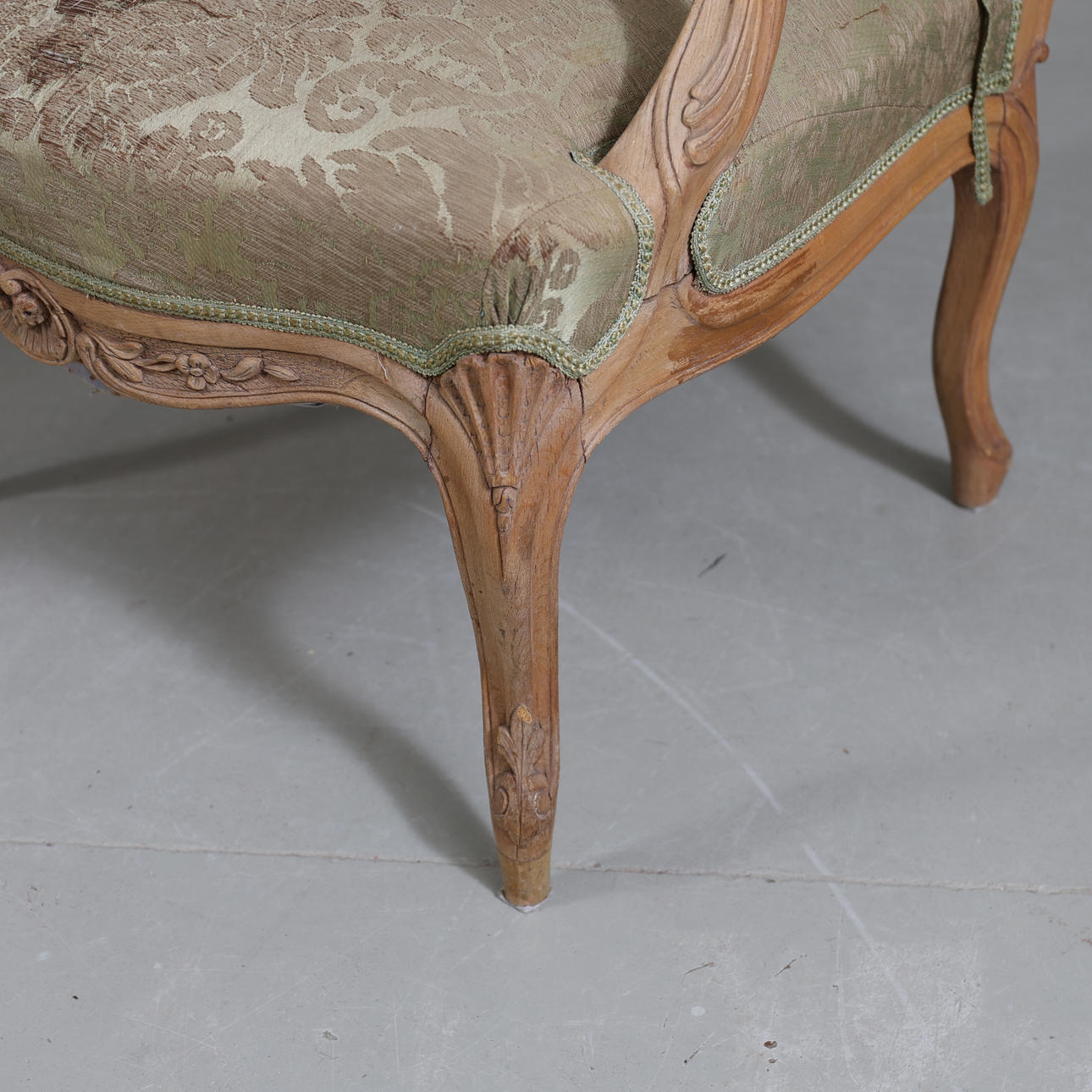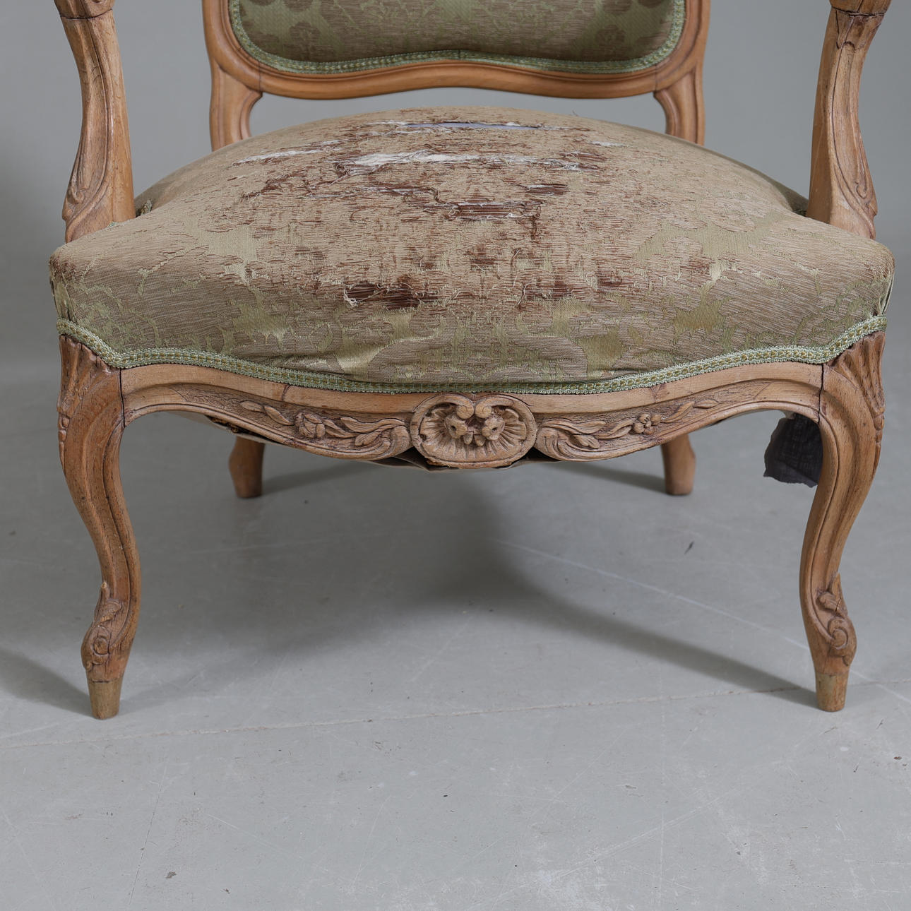 Bildhuggen dekor. Svängd konturerad rugg krönt med akantus och voluter. Utsvängda armlän. Frontsarger med rocailler och blad. Fast stoppad rygg och sits med fjädring.