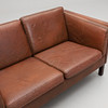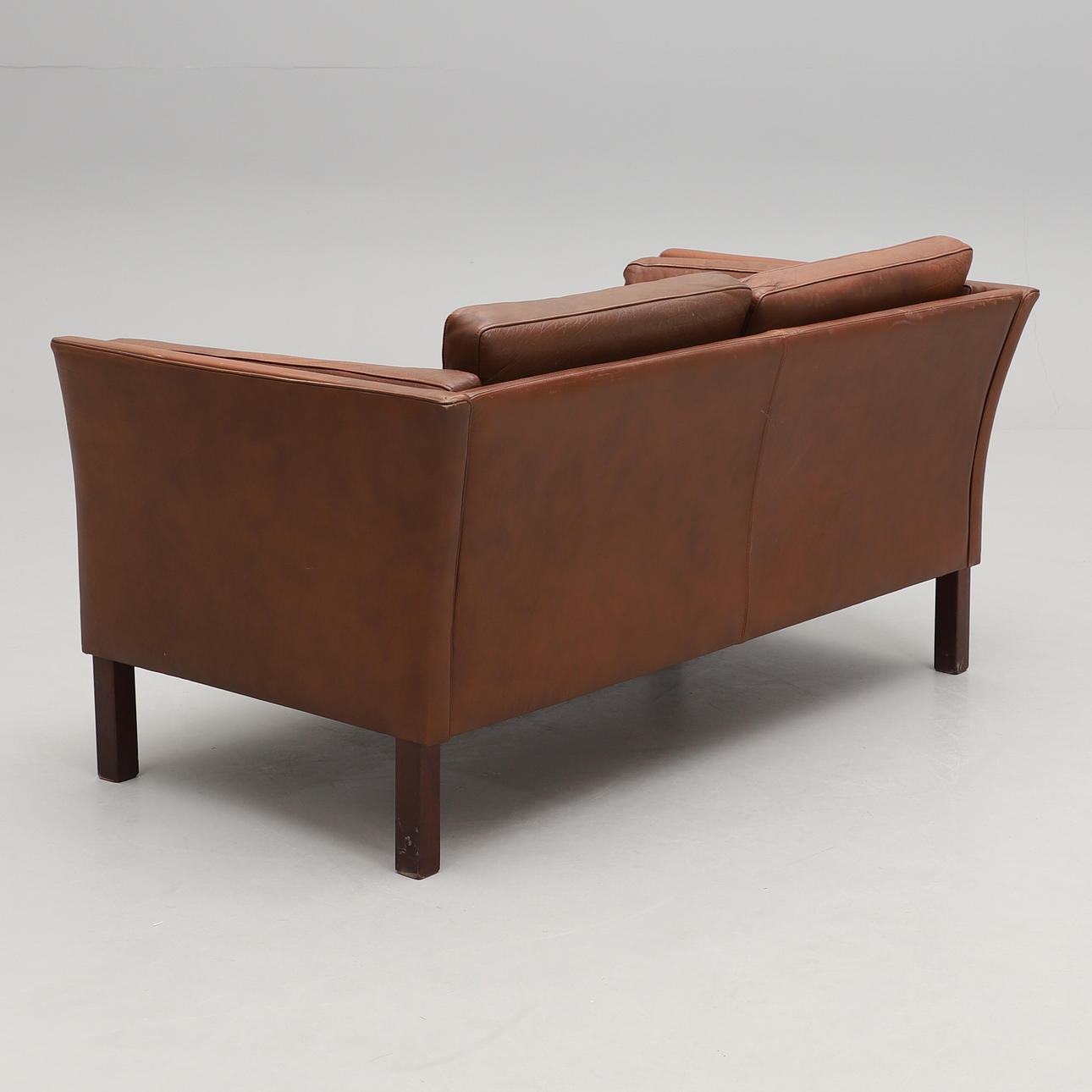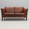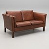 Lösa dynor. Ben i mörkbetsat trä. Mått: bredd 143, djup 78, höjd 66 cm.