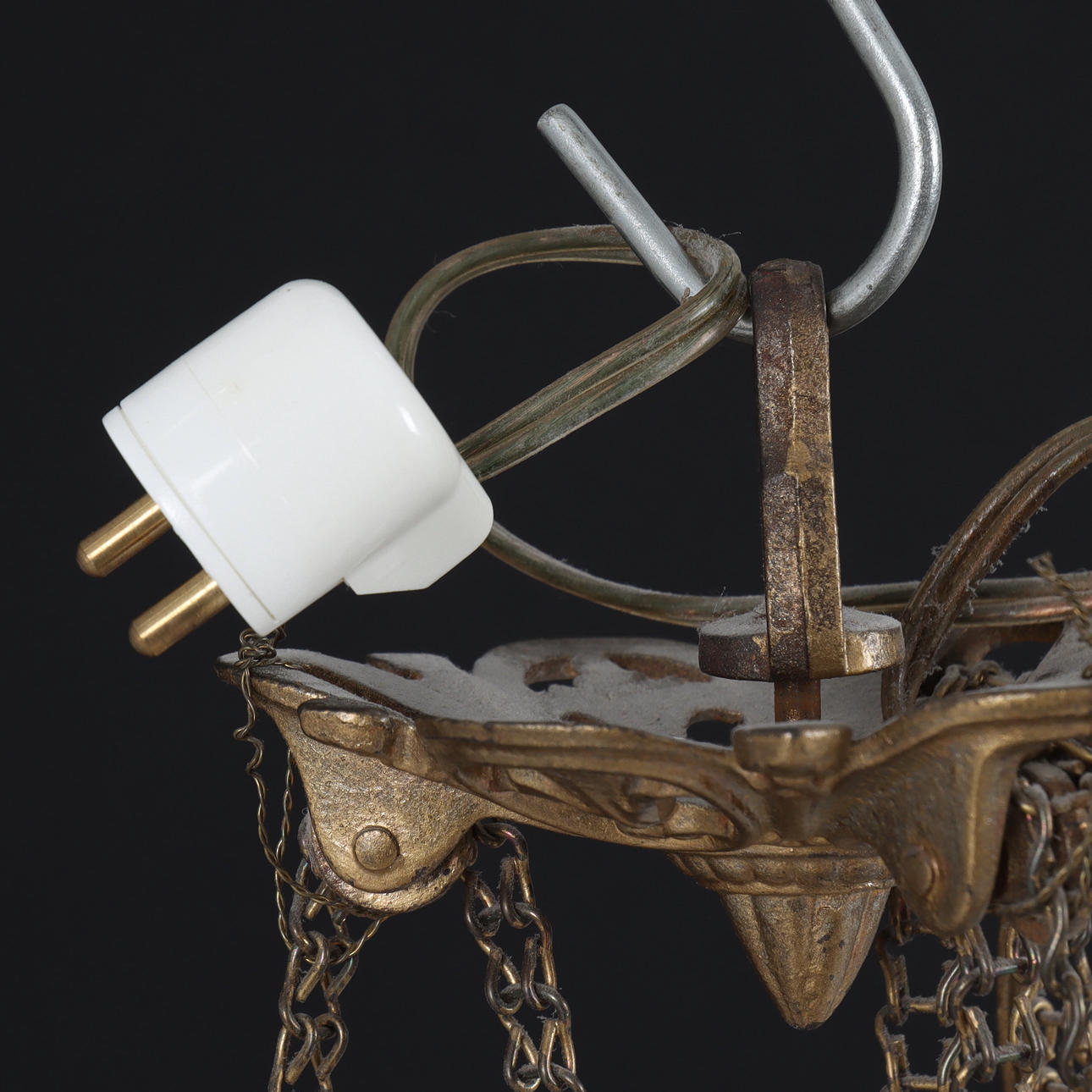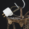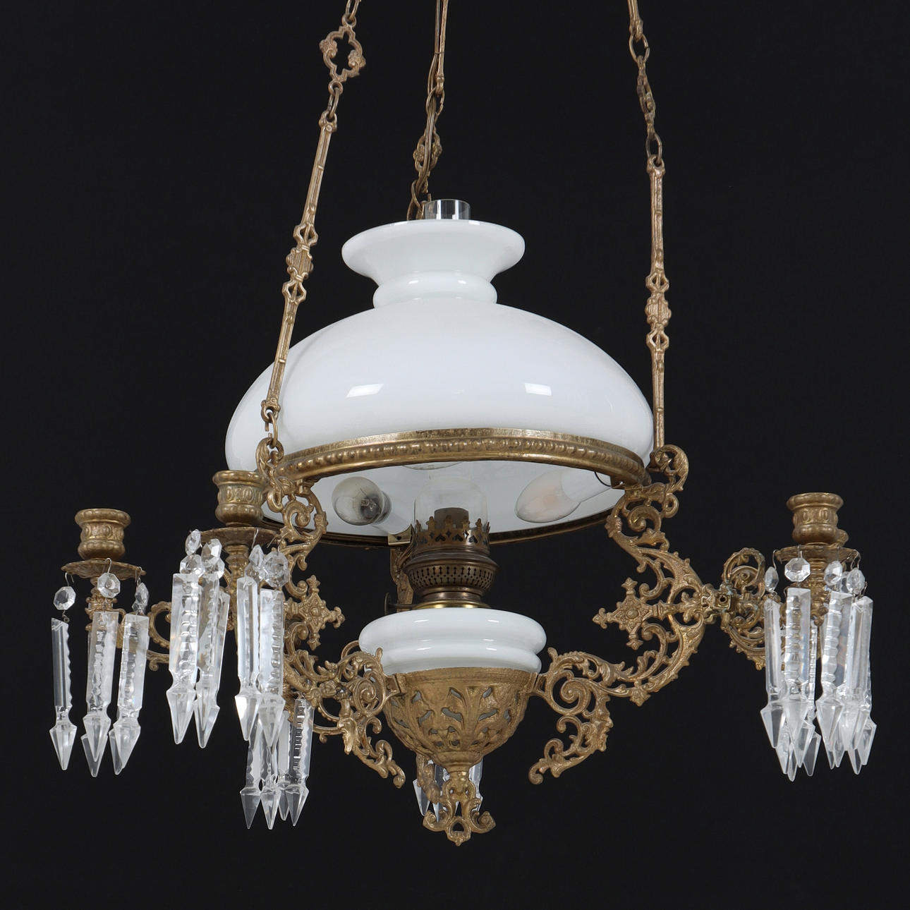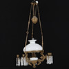 Stomme av metall behängd med prismor. Med tre ljuspunkter och sex ljusarmar. Höjd 112, diameter ca 60 cm.