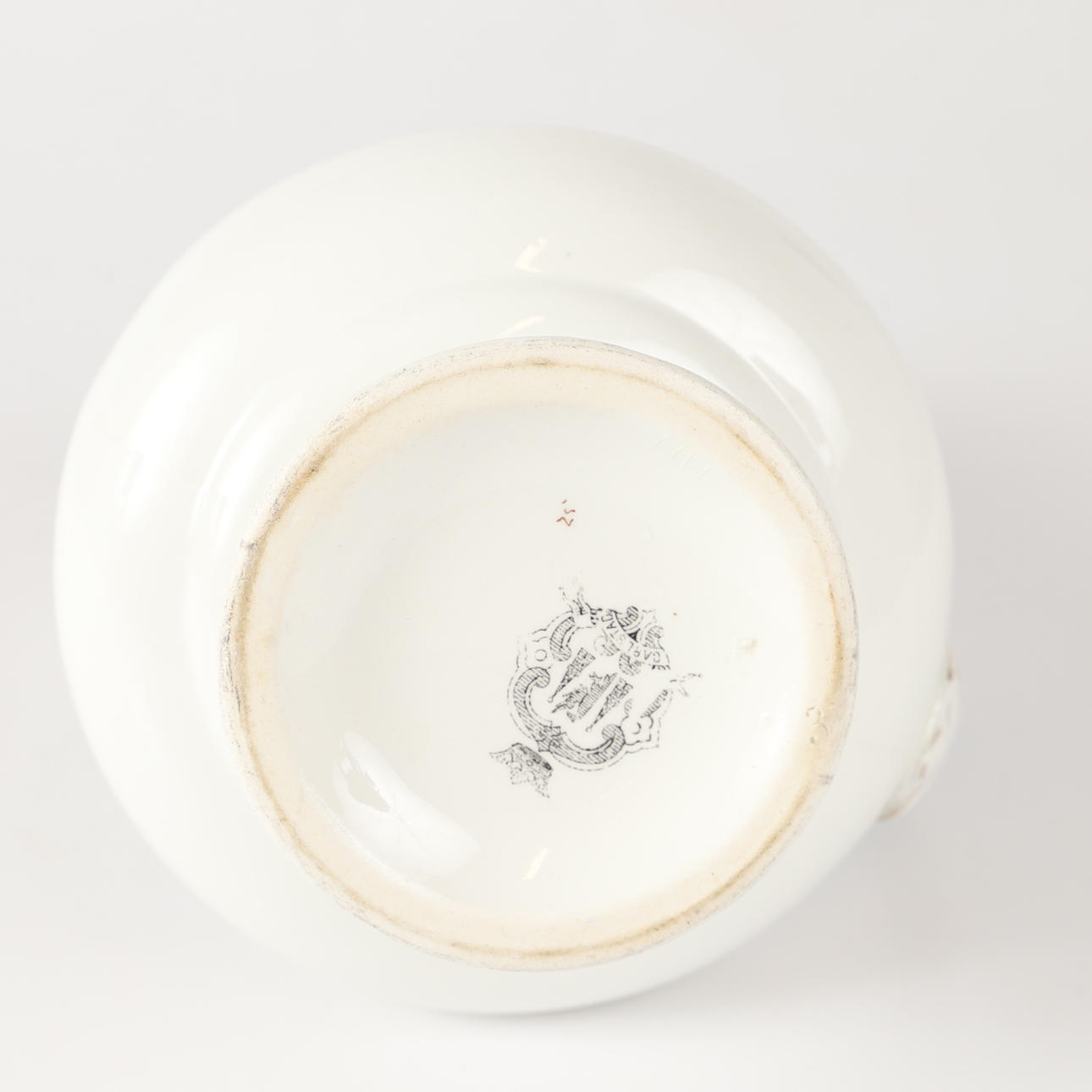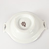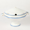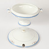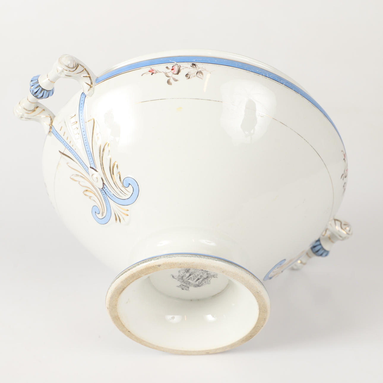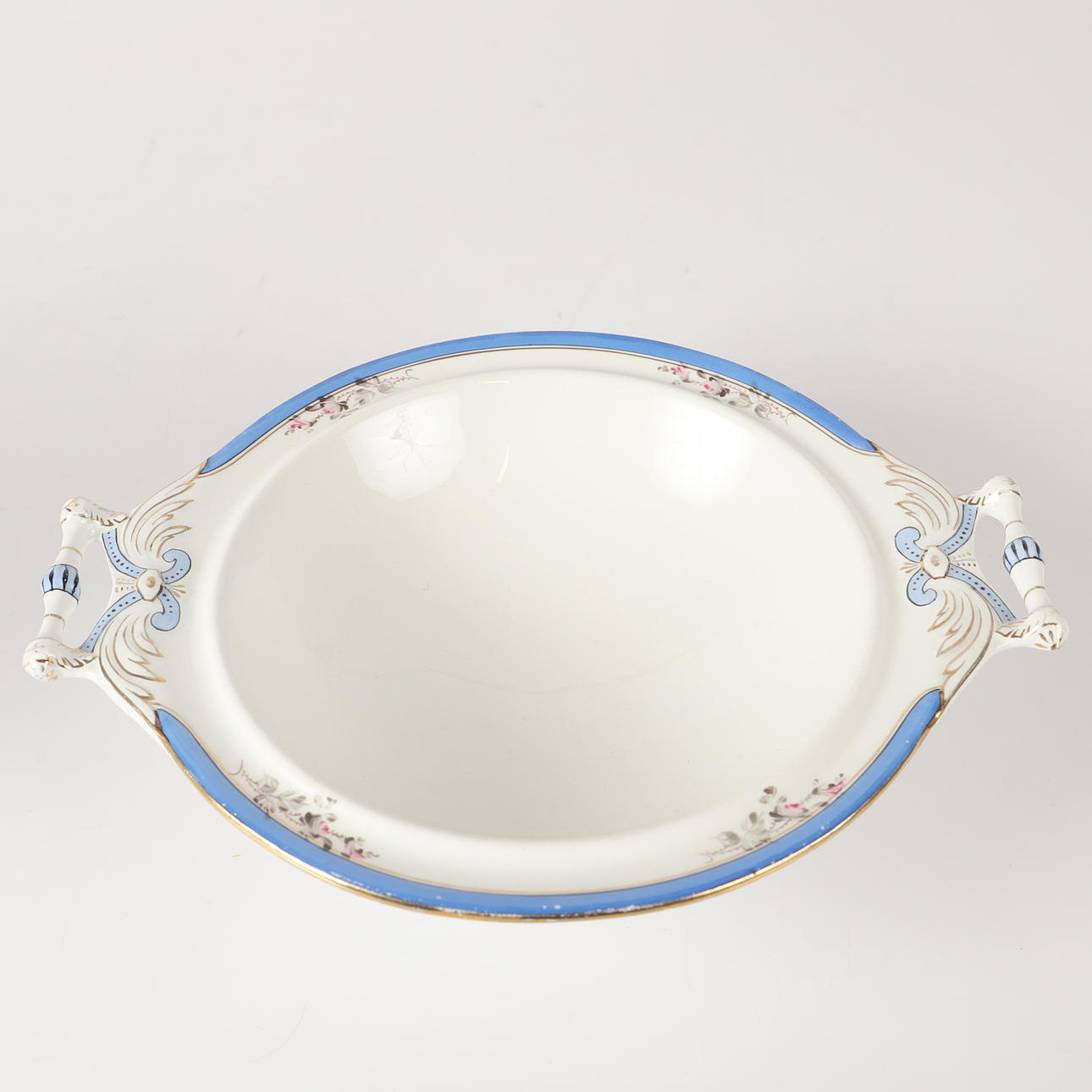 Yt-samt förgyllningsslitage, krakelyr, åldersslitage. Terrinen skadad (saknar knopp samt avslag).