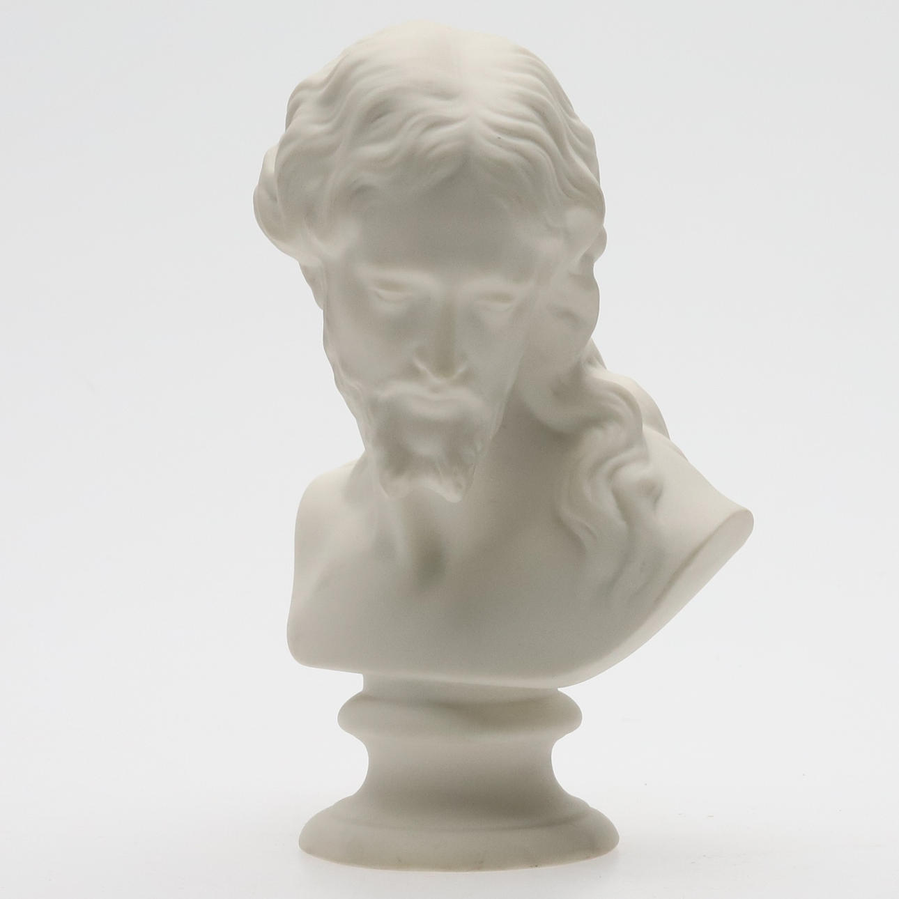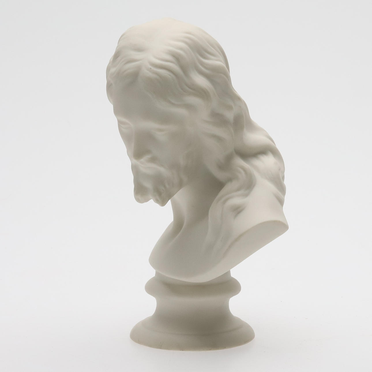 Skulptur, kristusbyst. ca 18 cm höjd. Ca 11 cm bred. Stämplad och märkt "Gustavsberg 1921, F".