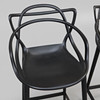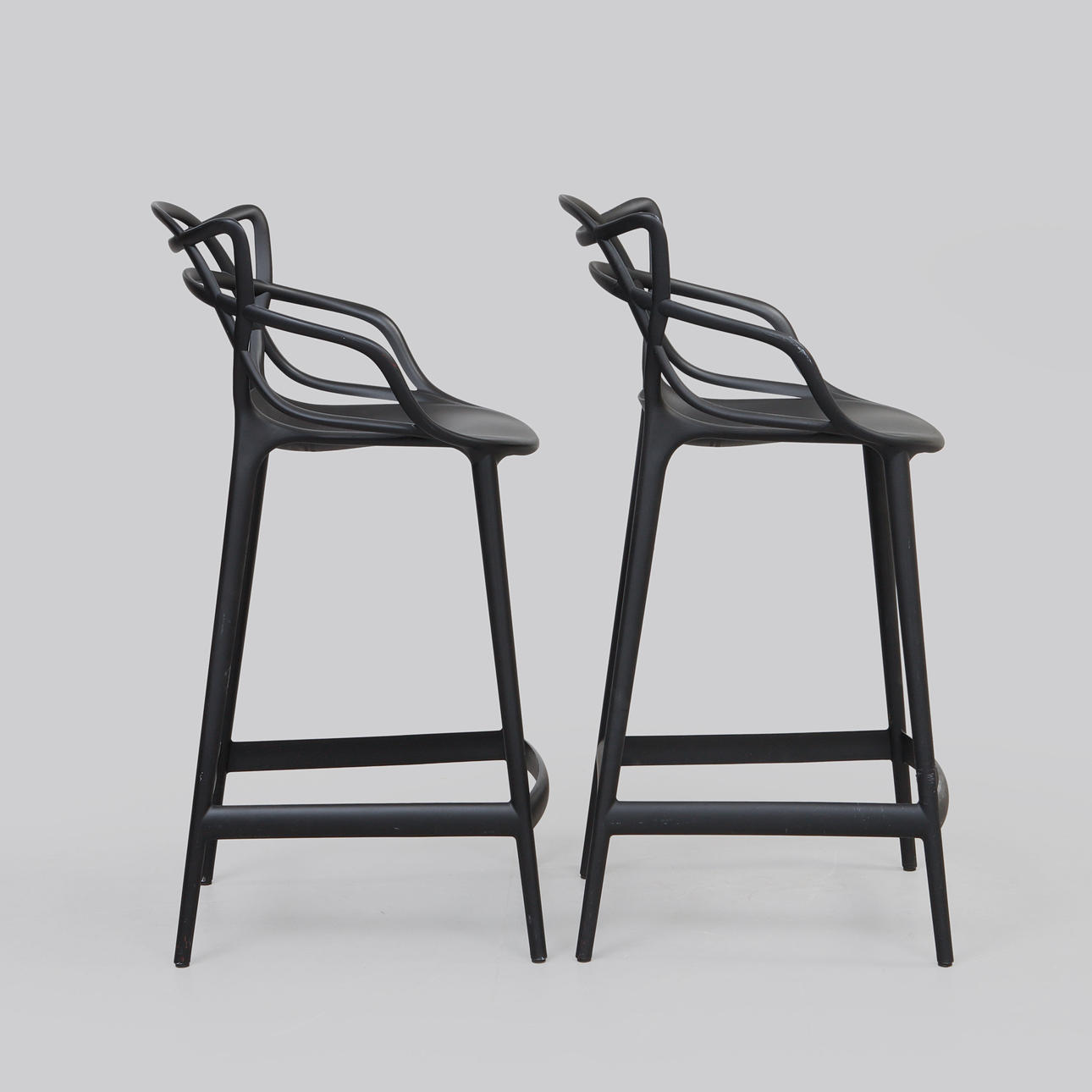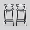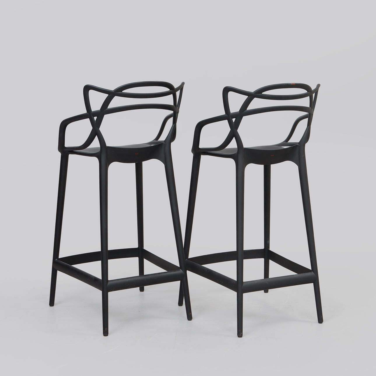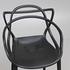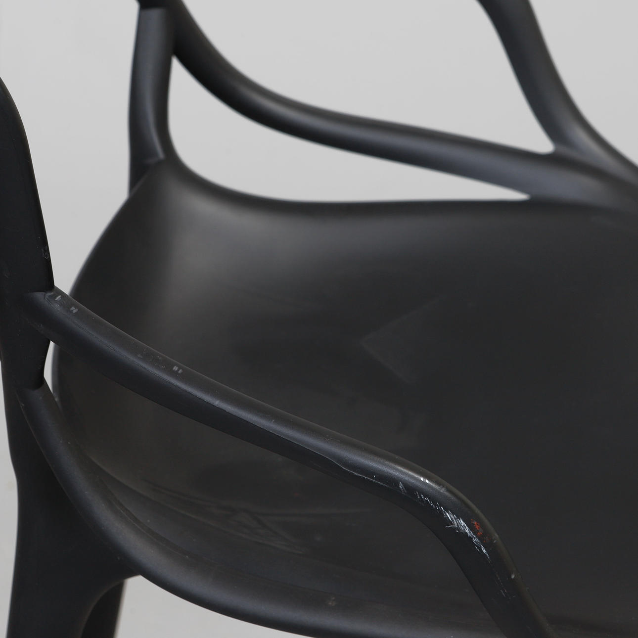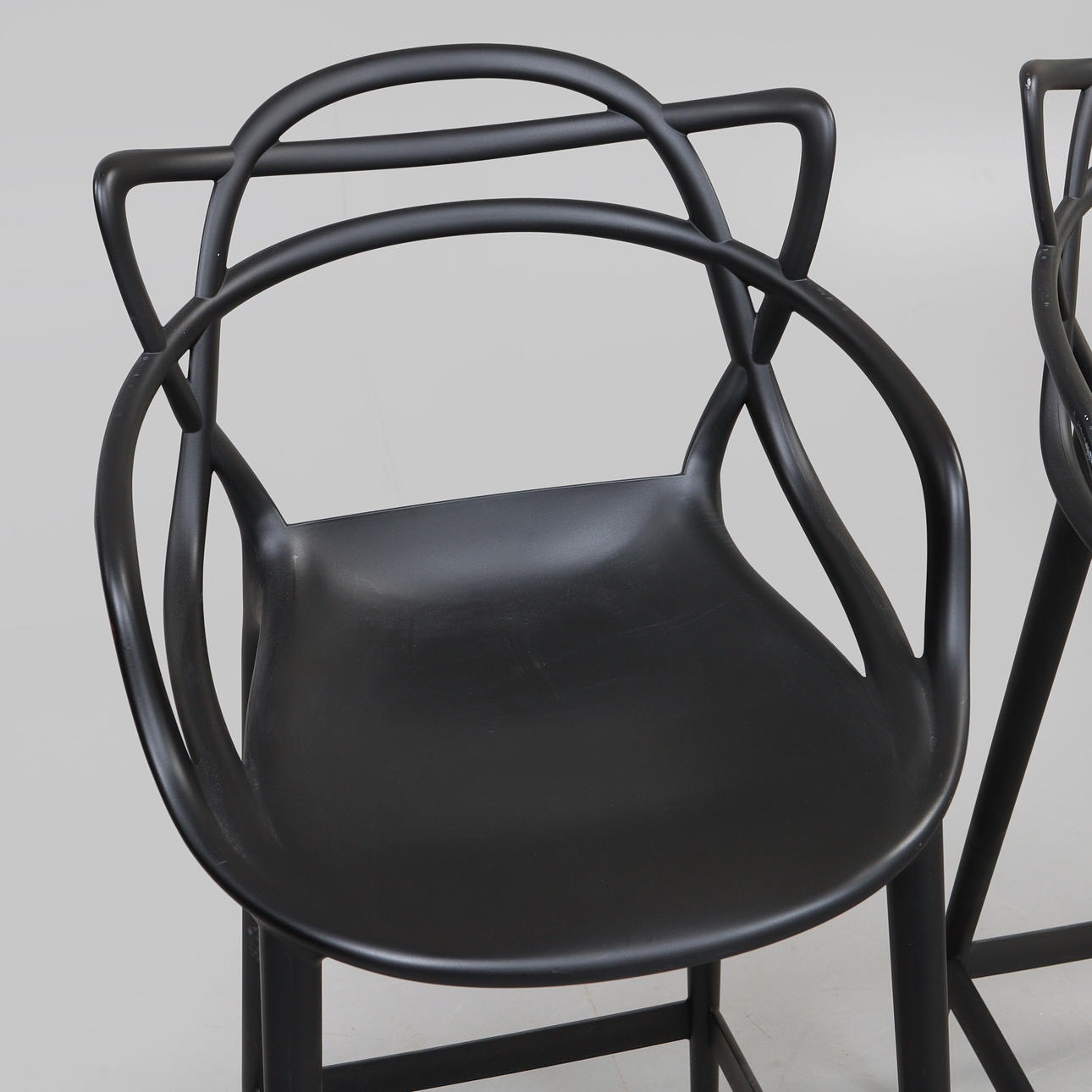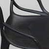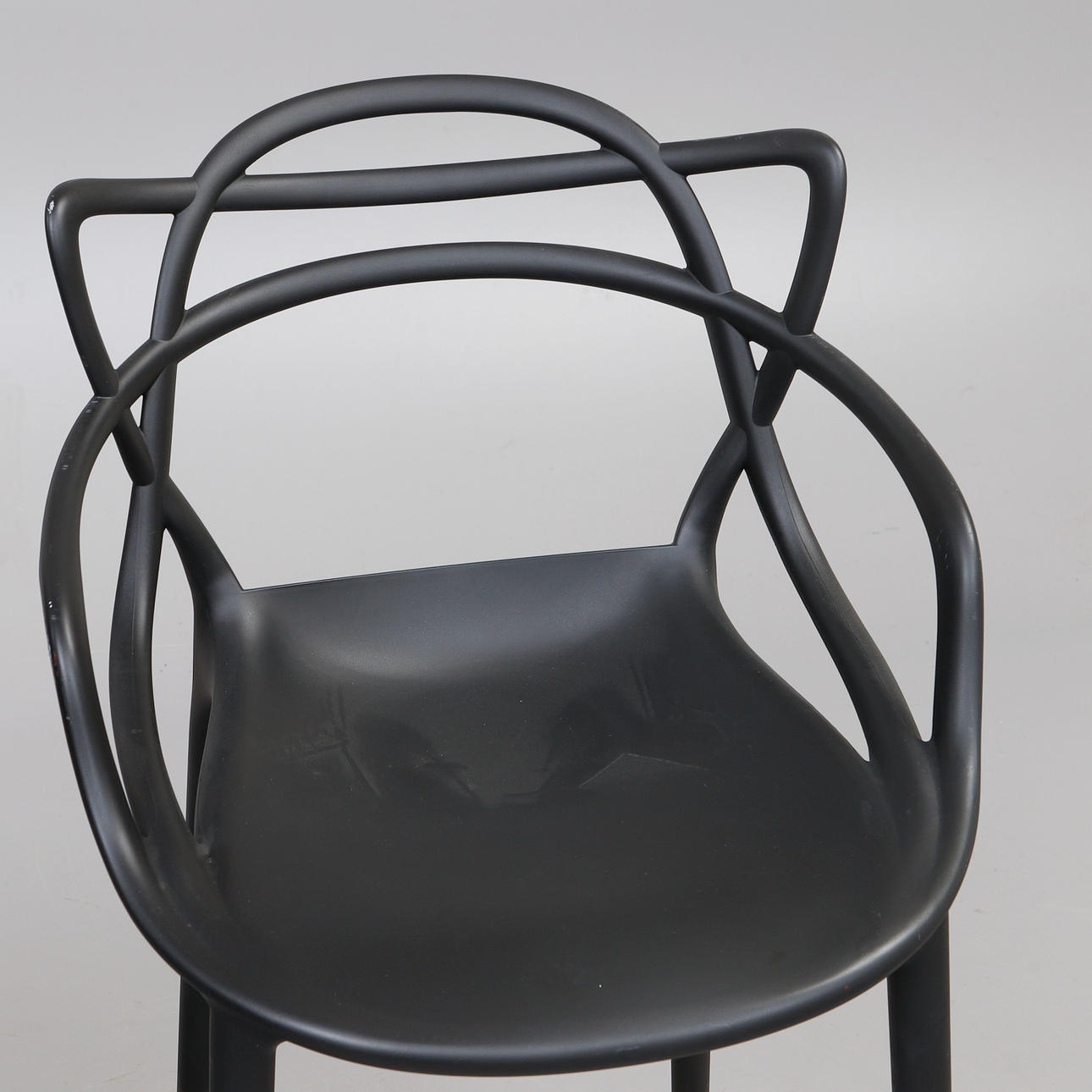 Svart plast. Bredd ca 49 cm, sitthöjd ca 68 cm, rygghöjd ca 99 cm.