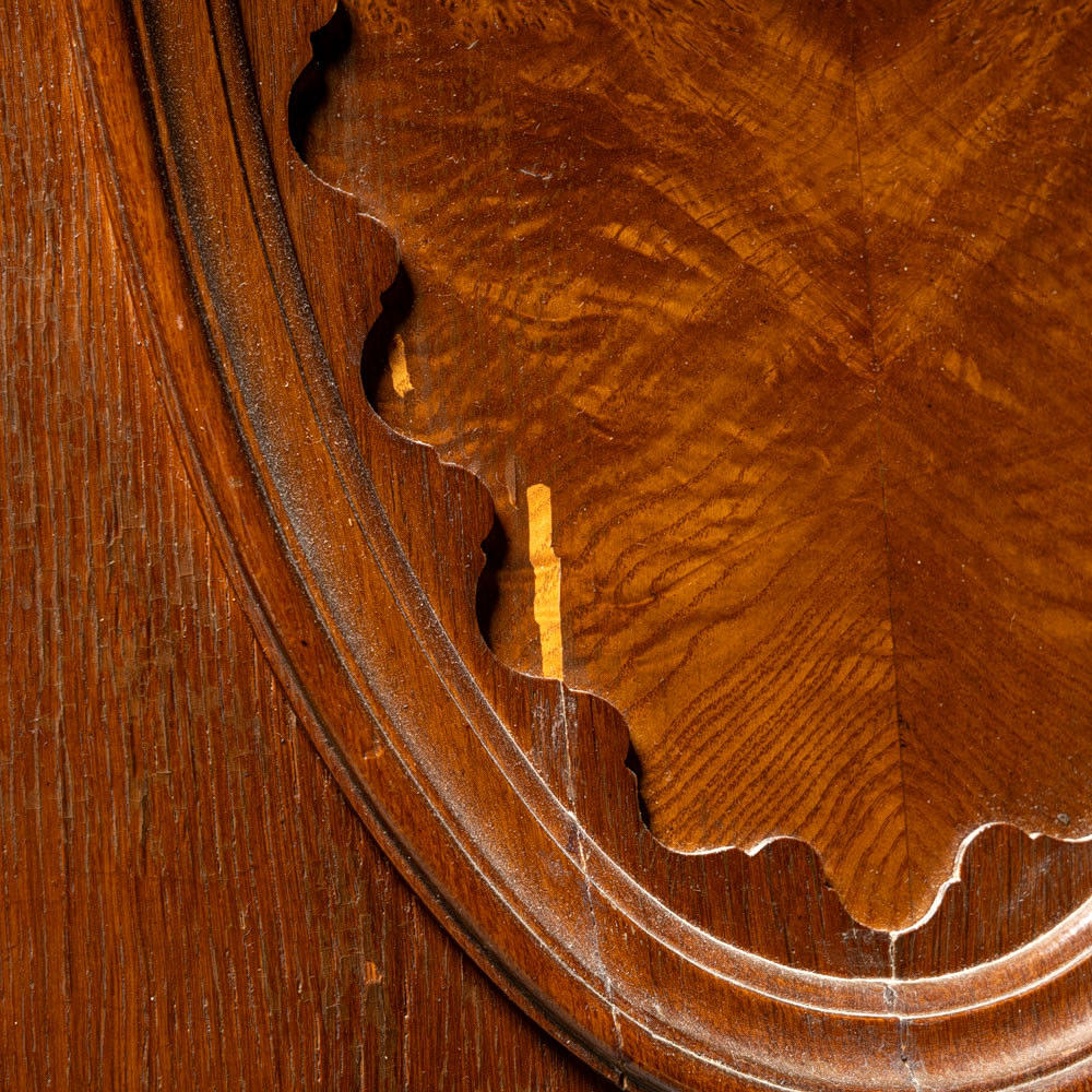 Bronserade beslag och skuren dekor.