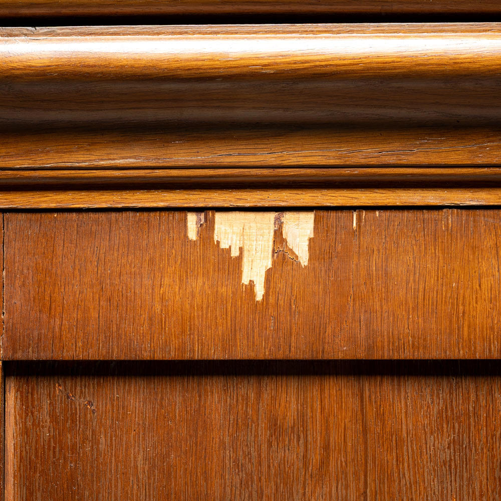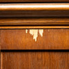 Skav på fanér höger och vänster sida. Märken, Repor, invändig dekorering med materialbortfall.