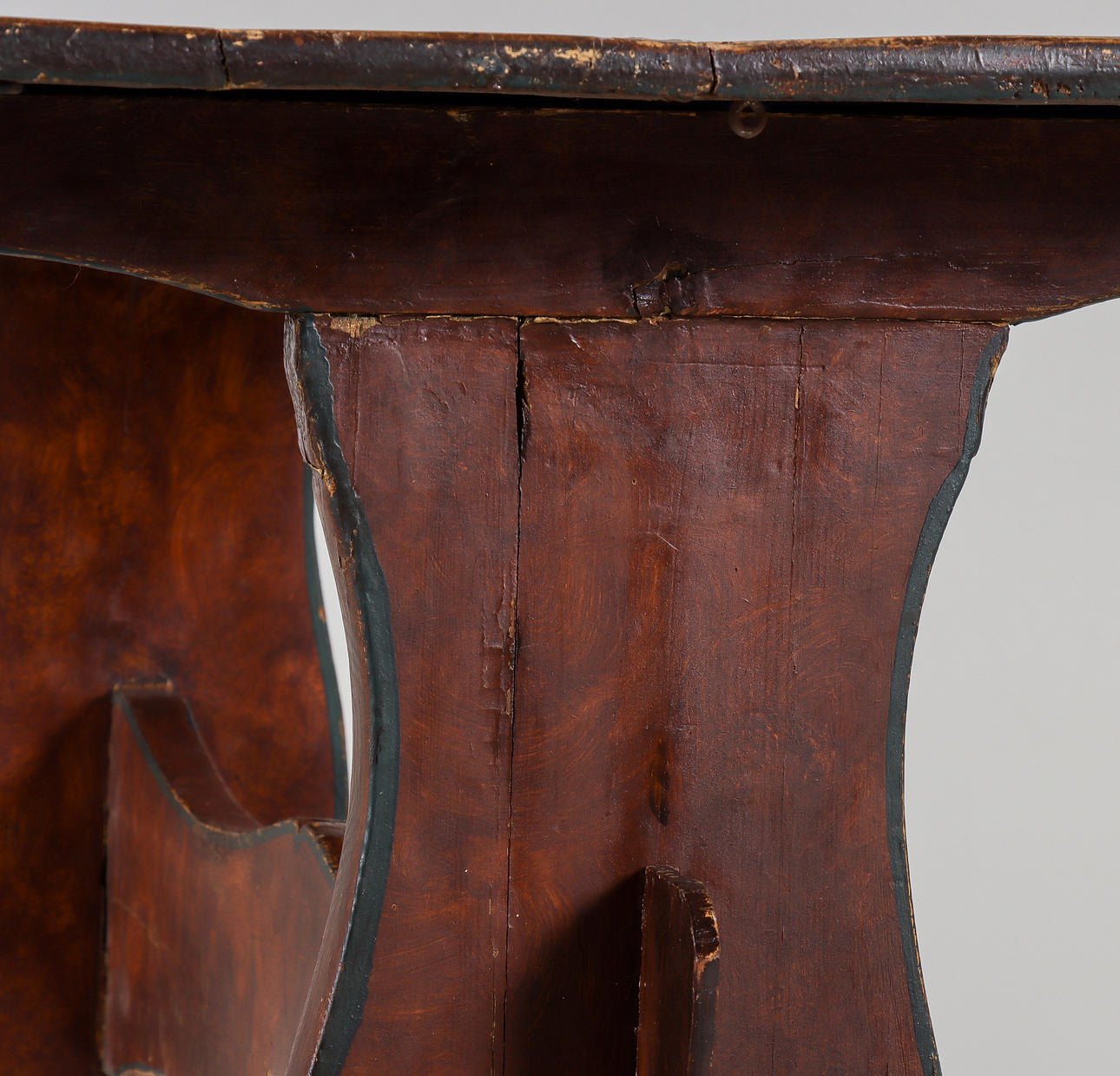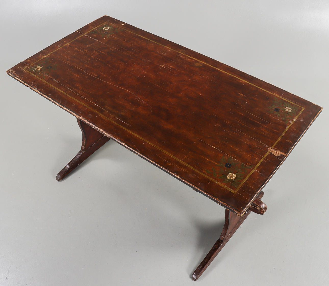 Renoverat och kompletterat. Torrsprickor. Något slagen skiva. Färgbortfall. Skavmärken.
