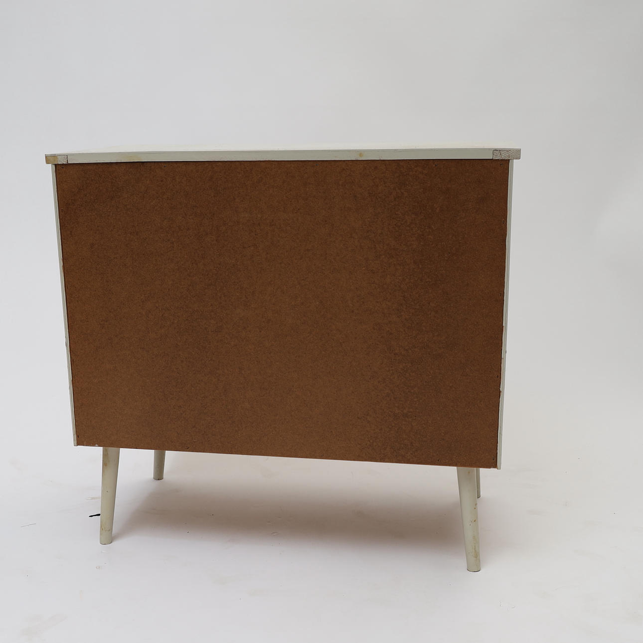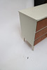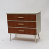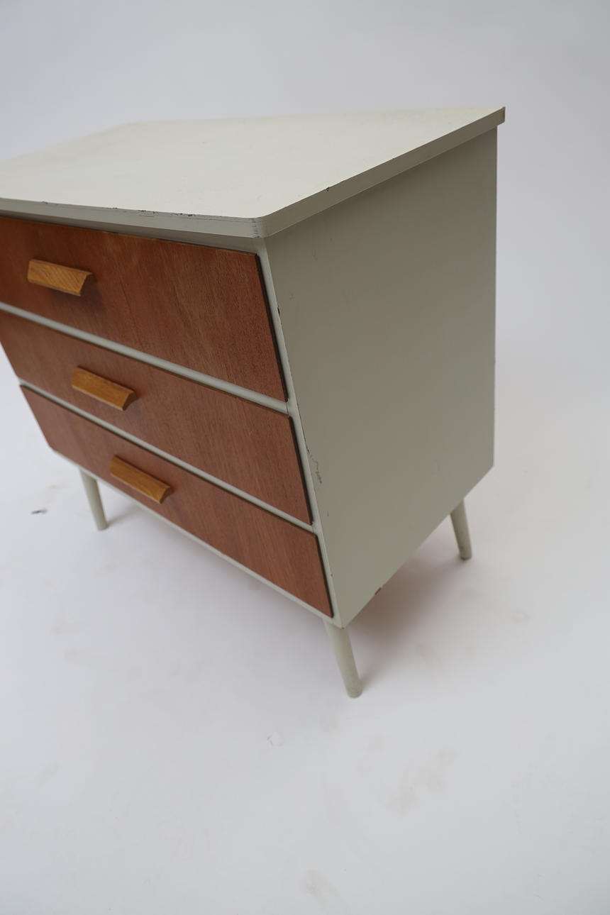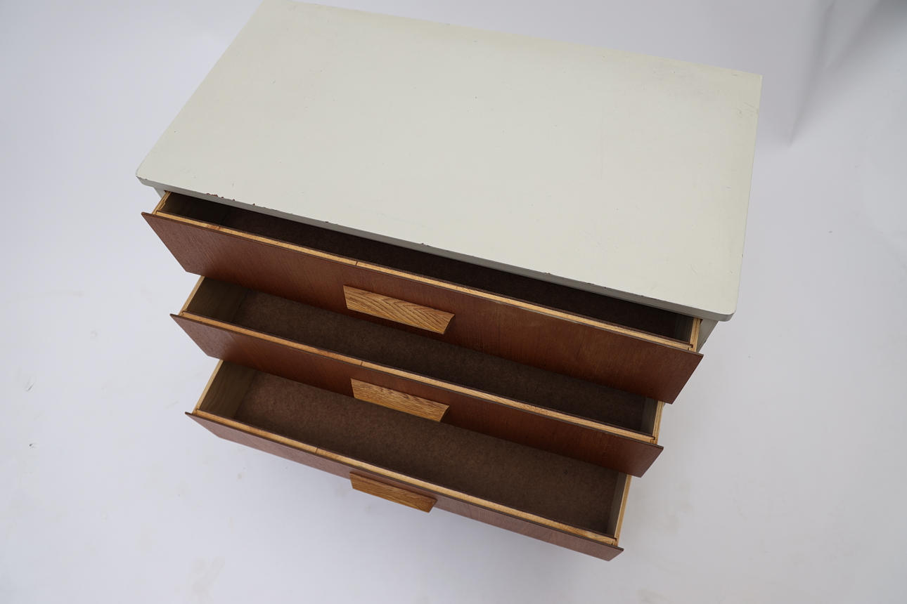 Gråmålad med lådfrontar av teak. Tre lådor.