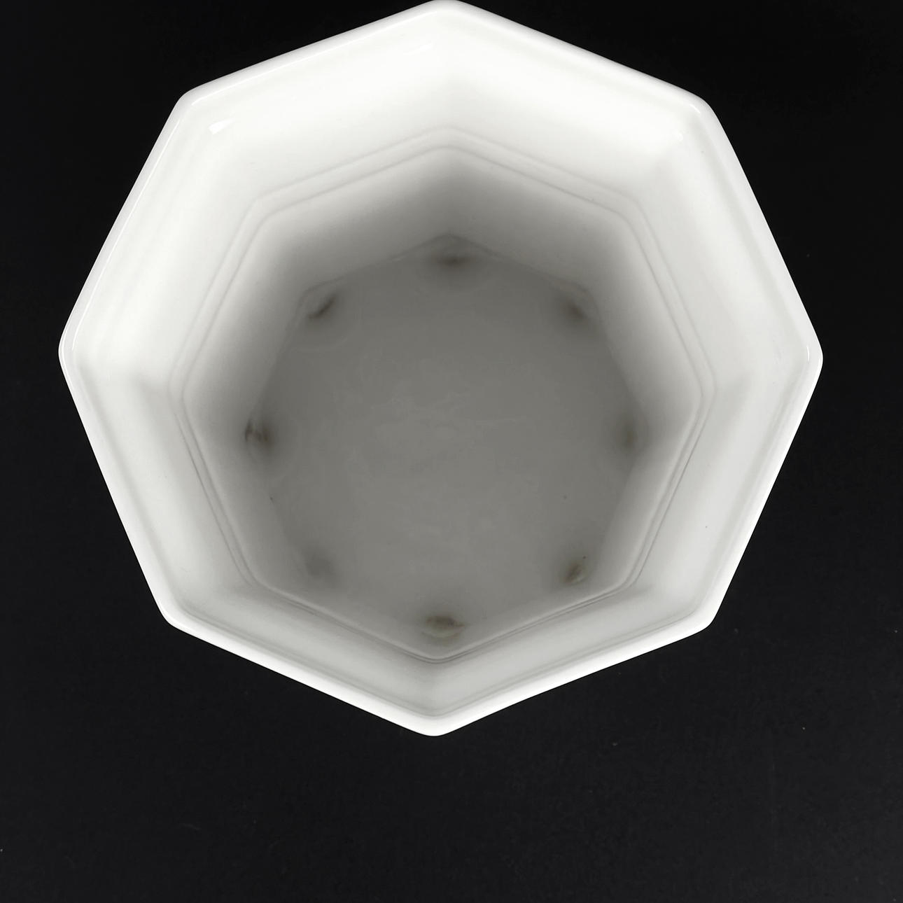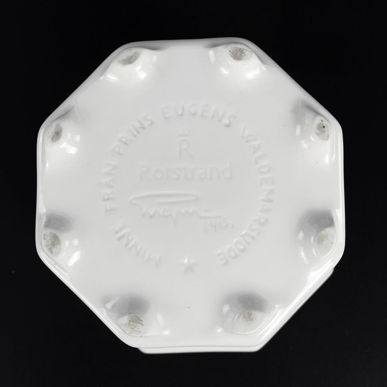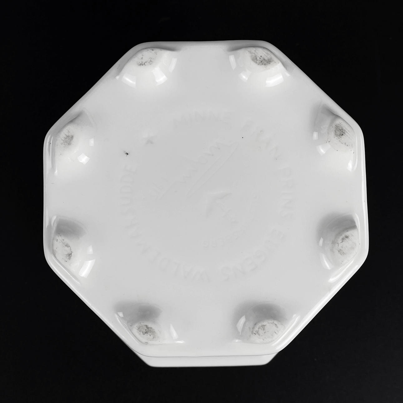 Vitglaserat porslin. Djupstämplade undertill. Mått: ca 15,5 x 15,5 cm, höjd ca 15 cm.