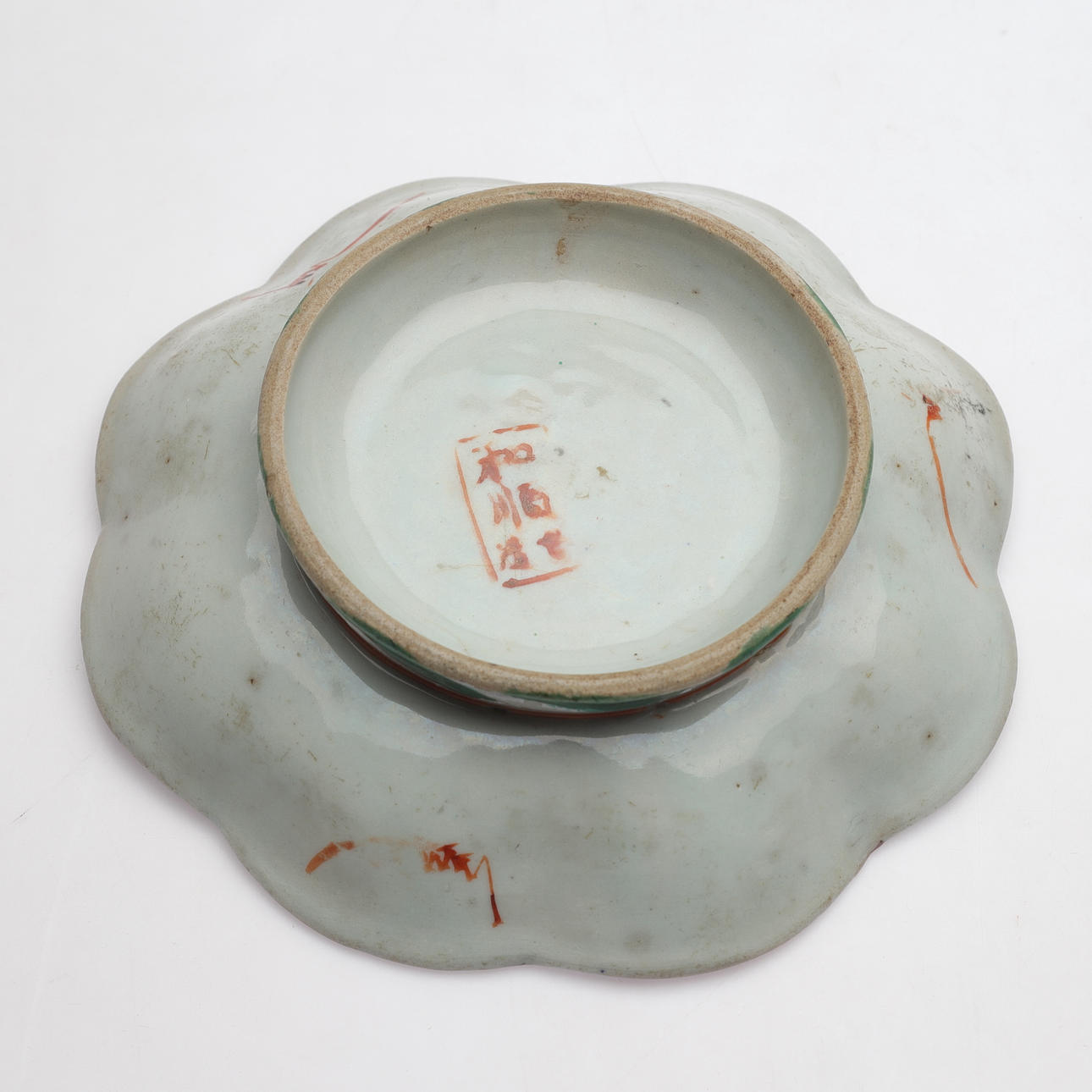 Bruks- och åldersrelaterat slitage. Tillverkningsdefekter/glasyrmistor. Perukvas med spricka/dekorbortfall. Tekanna med glasyrspricka på undersida.