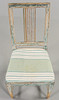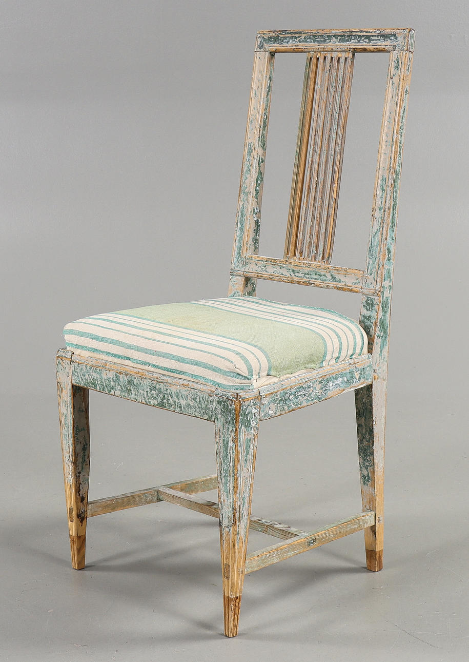 Bemålad. Ryggbricka med spjäldekor. Lös stoppad tygklädd sits.