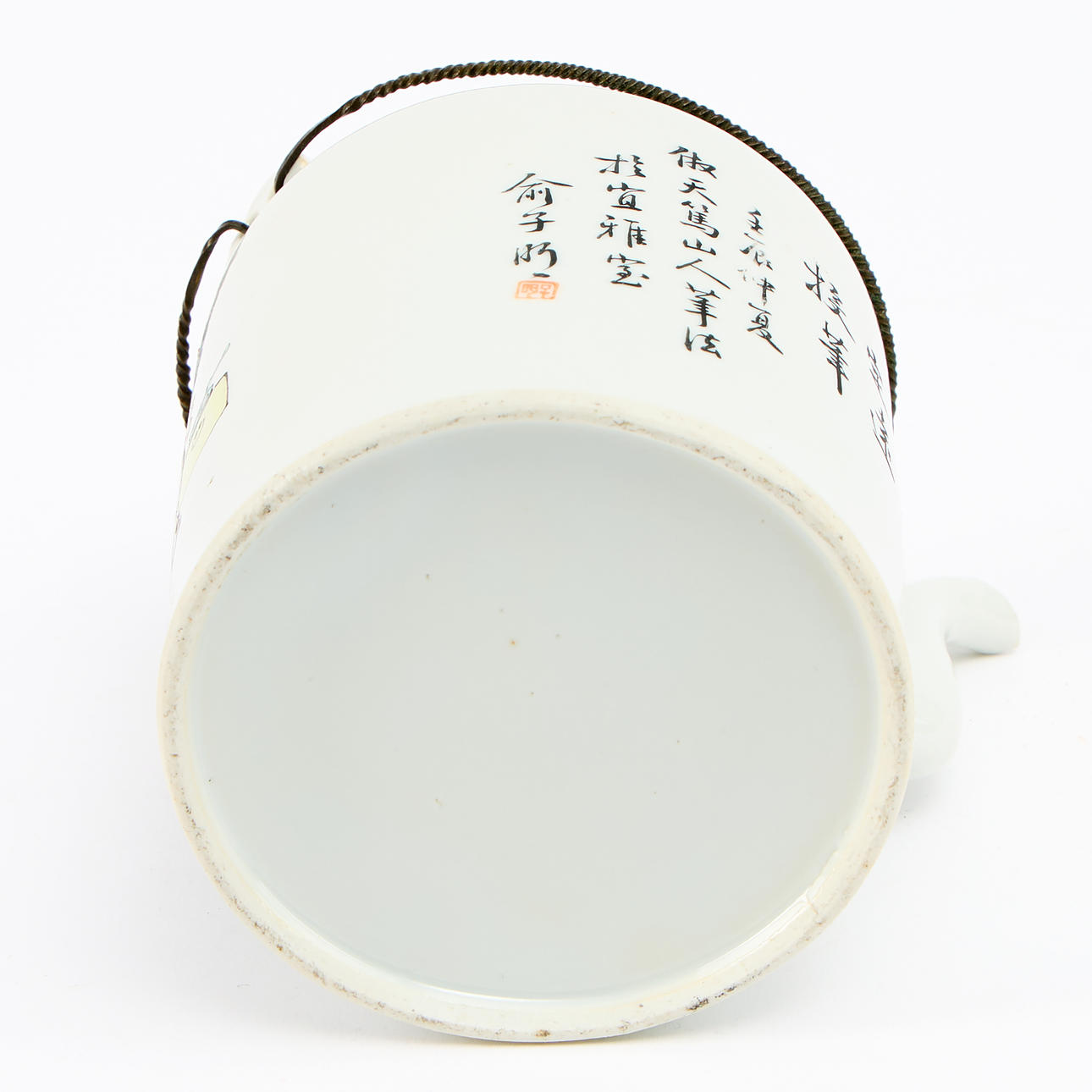 Polykrom dekor av man med pojke samt skrivtecken H. 13 cm exkl handtag.