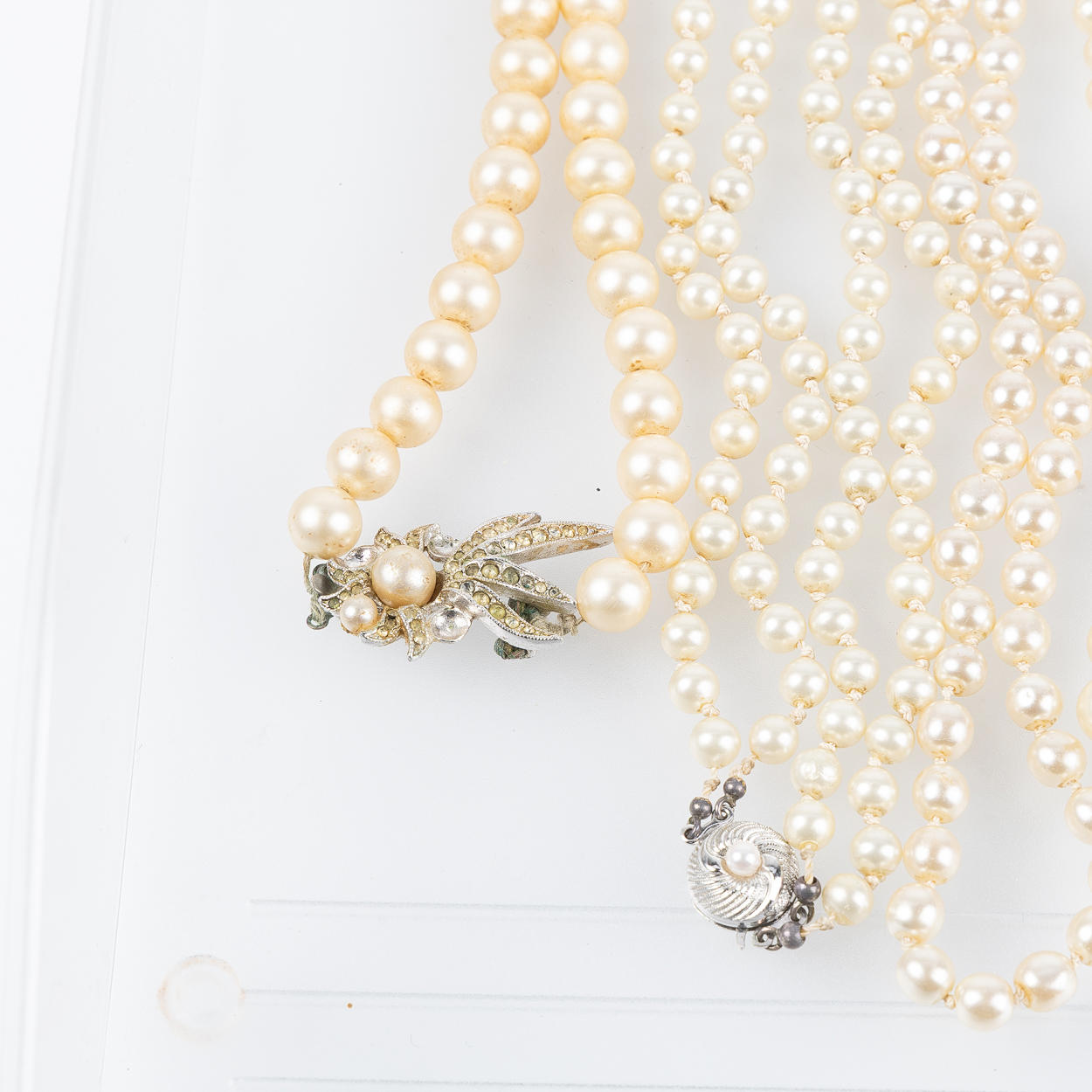 Tre stycken collier med imitationspärlor, omkring 1960-80-tal. Delvis doserade länkar. Längder ca 20/22/27/37 cm.