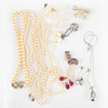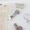 Brosch i nysliver med imitationspärlor och glasstrasstenar i vitt och rött, Golden Age of Hollywood/ Costume Jewelry, omkring 1950-tal. Längd ca 8,5x5 cm.