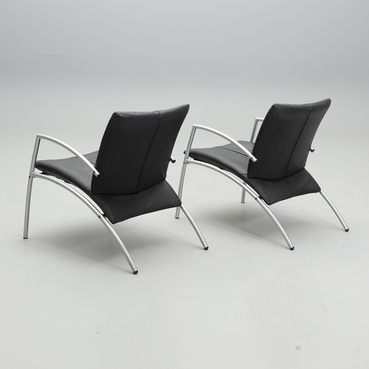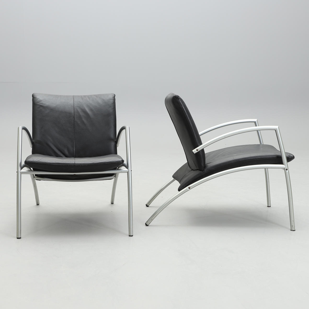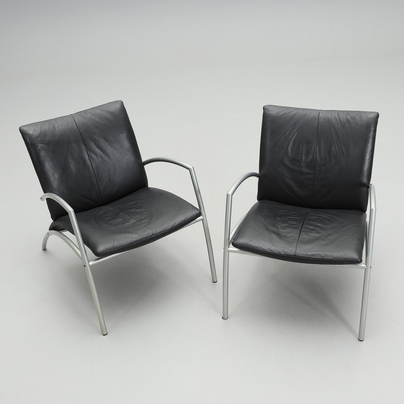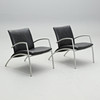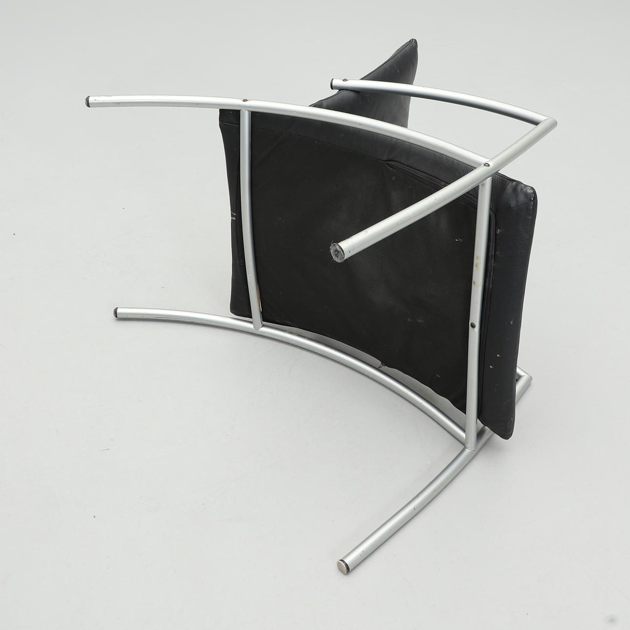 Lackerad stålrörsstomme. Sits och rygg klädd i svart skinn. Bredd 63, djup ca 90, rygghöjd 80, sitthöjd 45 cm.