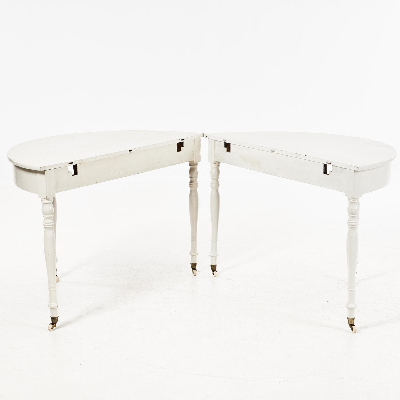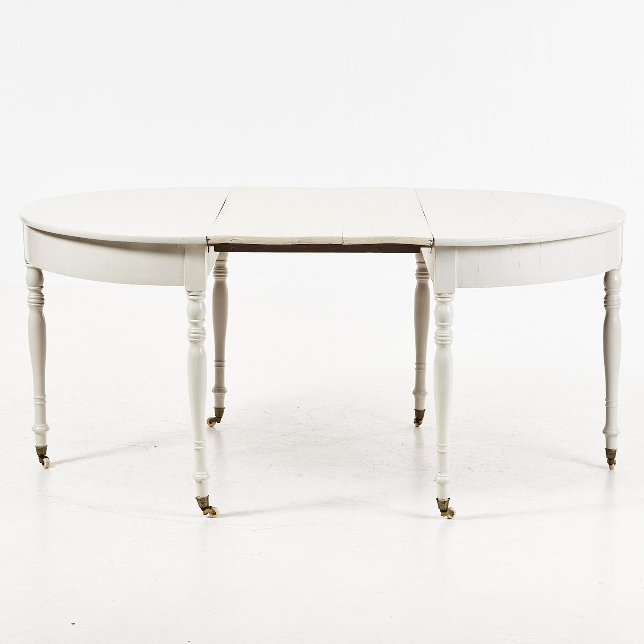 Vitmålat, med en iläggsskiva, på hjultrissor, mått ca 77, 120 x 120, skiva 58 cm.