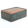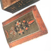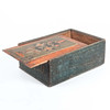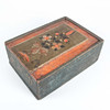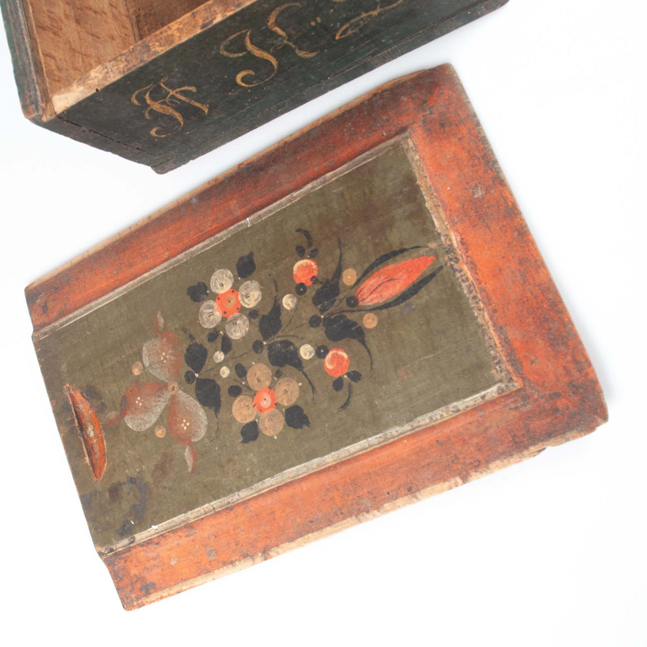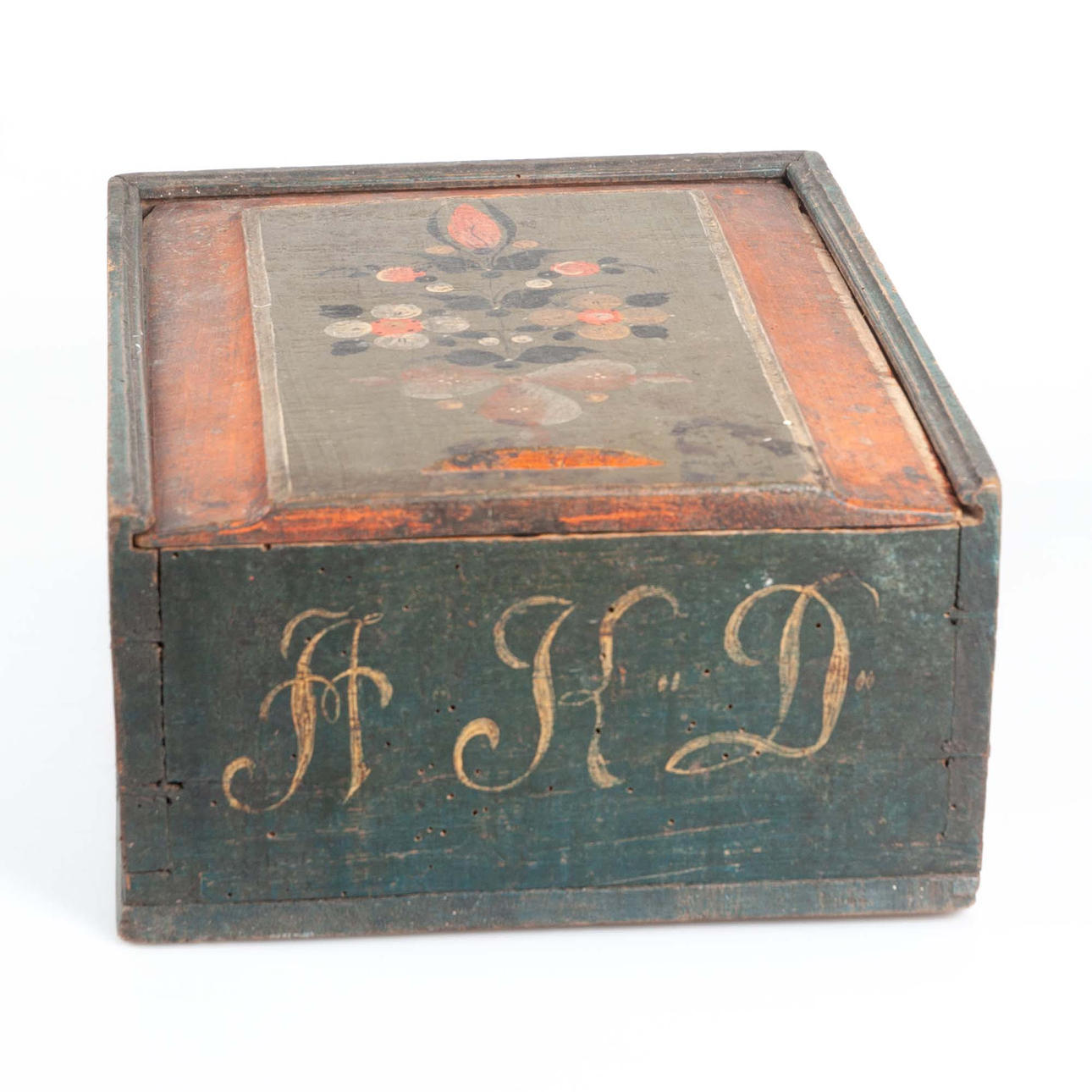 Rektangulär bemålad trälåda med lock. Dekor i form av stiliserat blomstermotiv i rött, svart, beige och vitt mot grön botten samt röd kant. Sidor i mörkgrön/svart kulör. Invändigt omålad. På kortsida försedd med initialer.