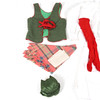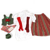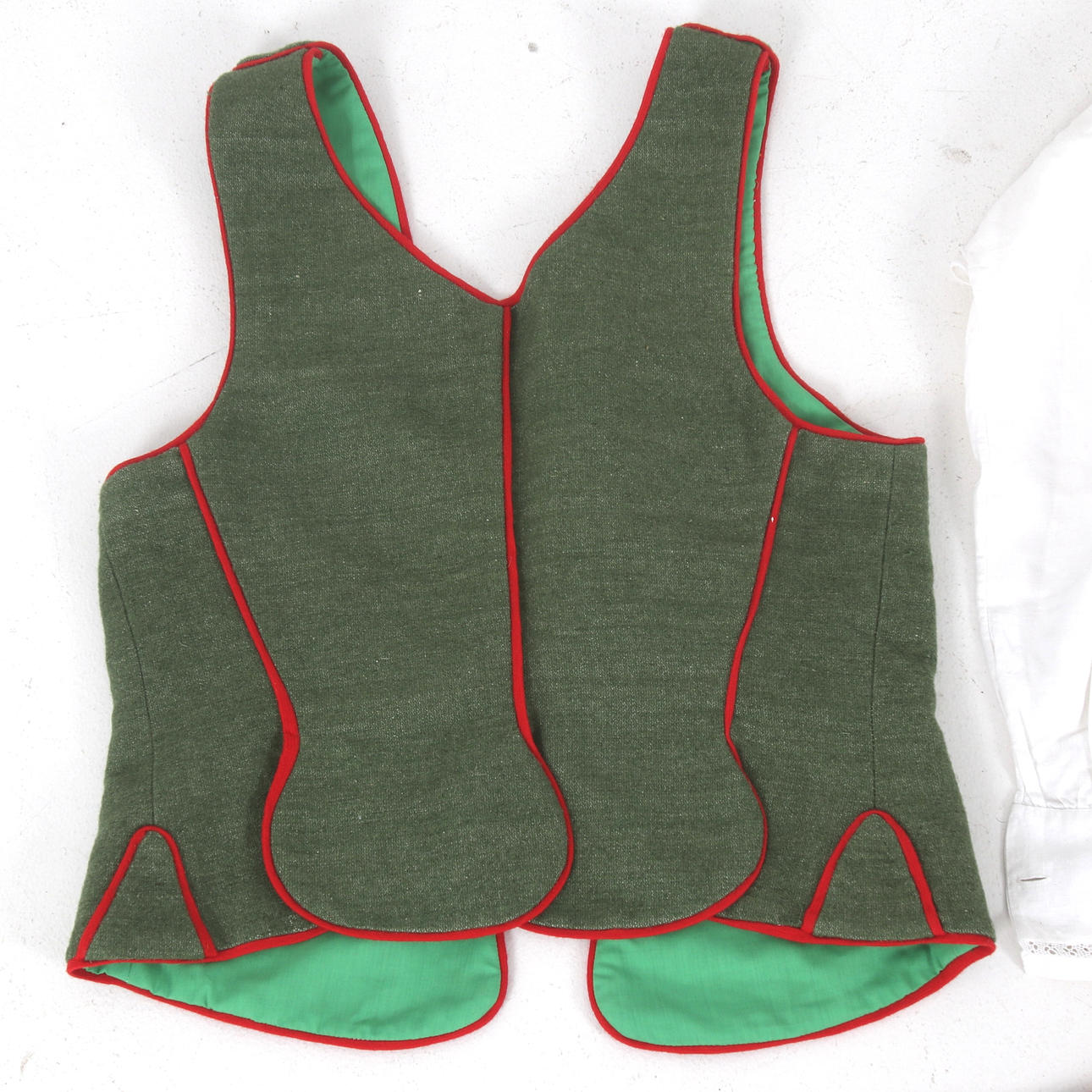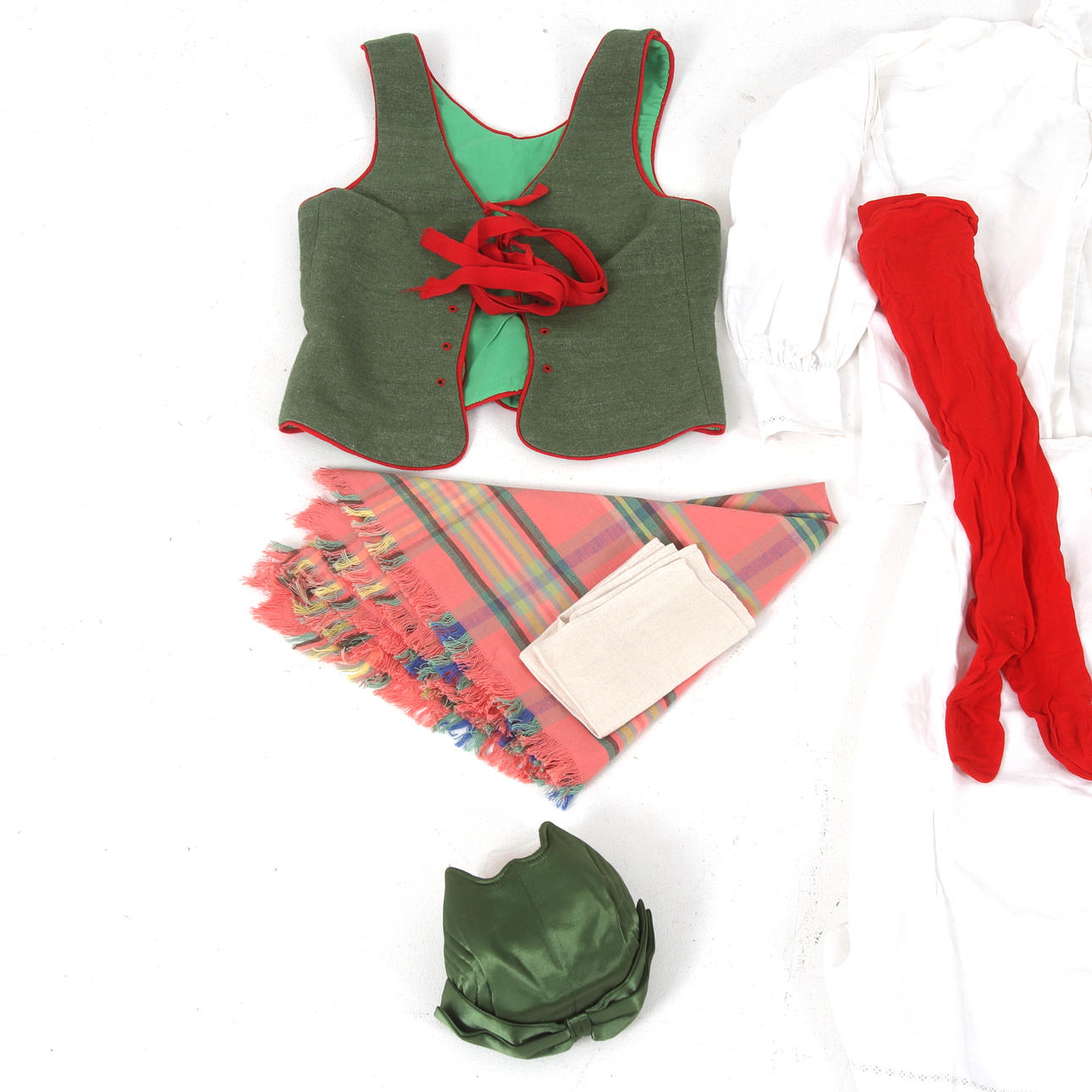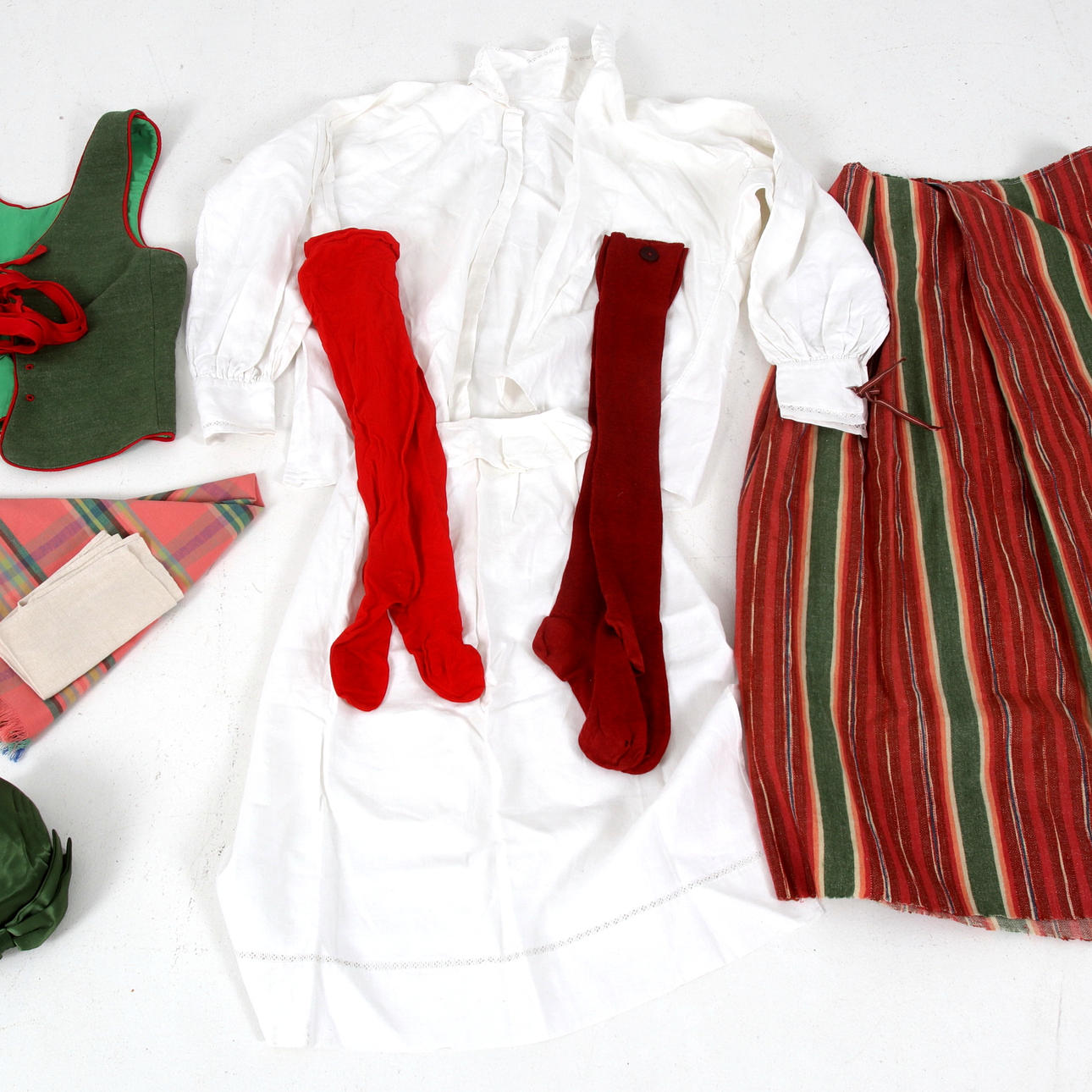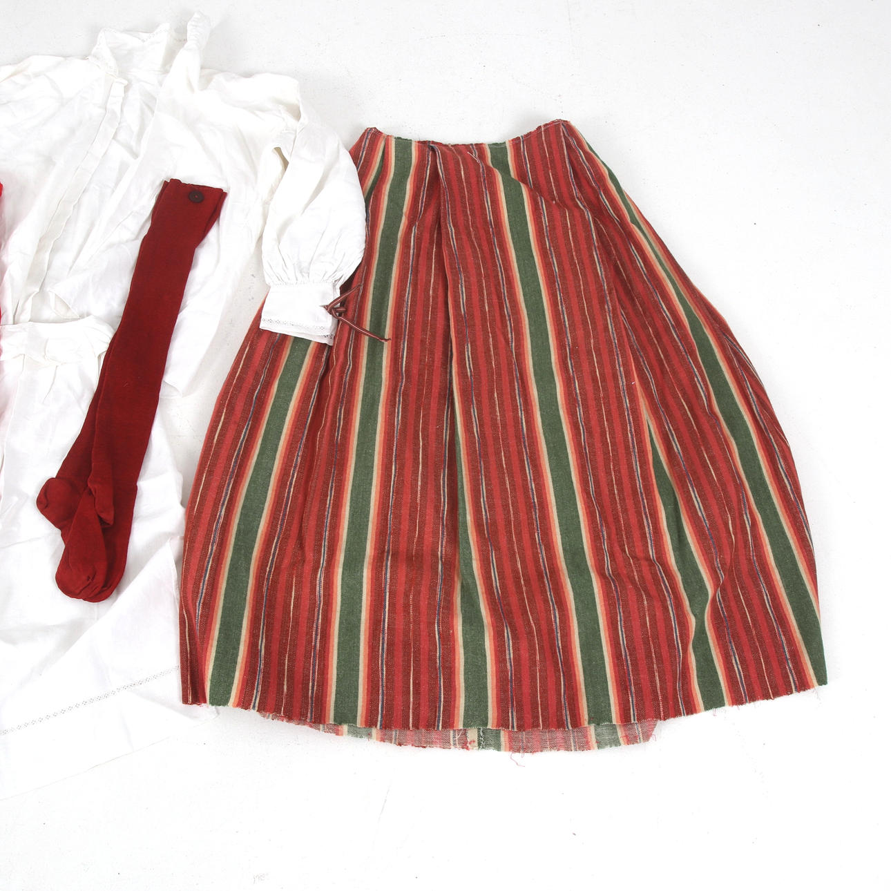 Sjal, väst, skjol, förkläde, skjorta, 2 par strumpor samt hätta.
