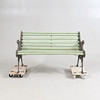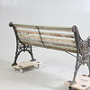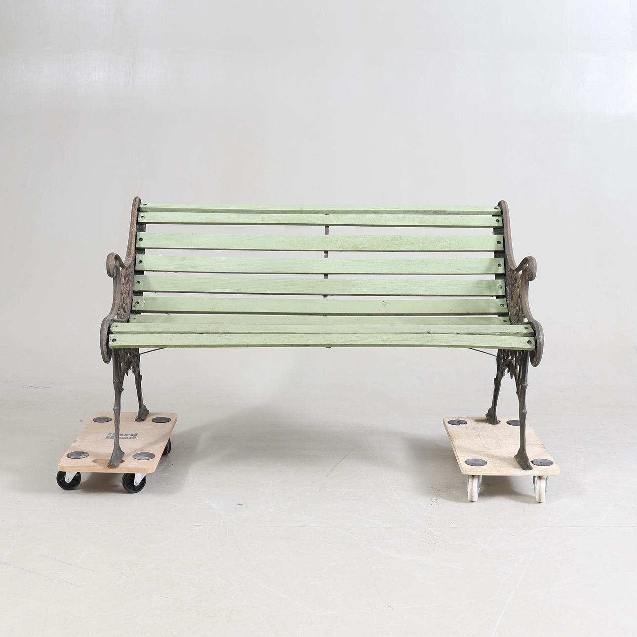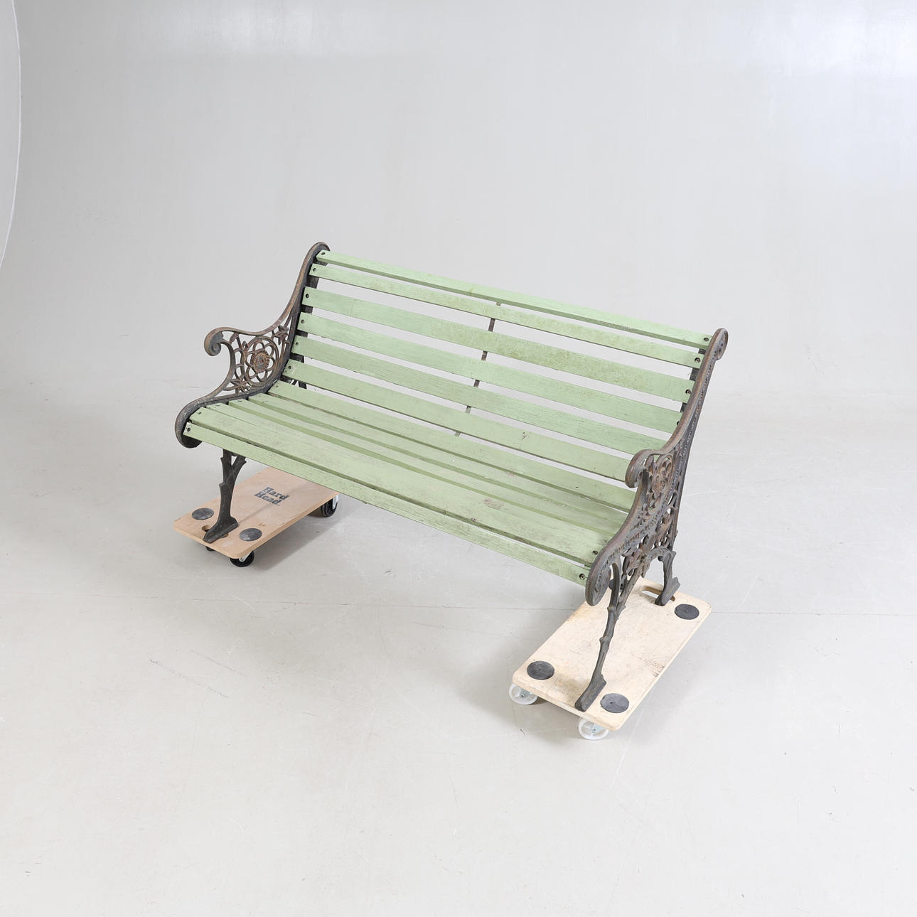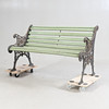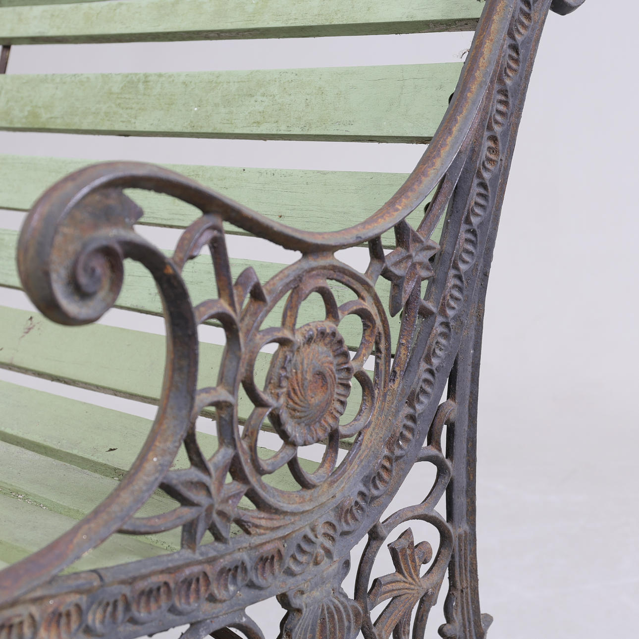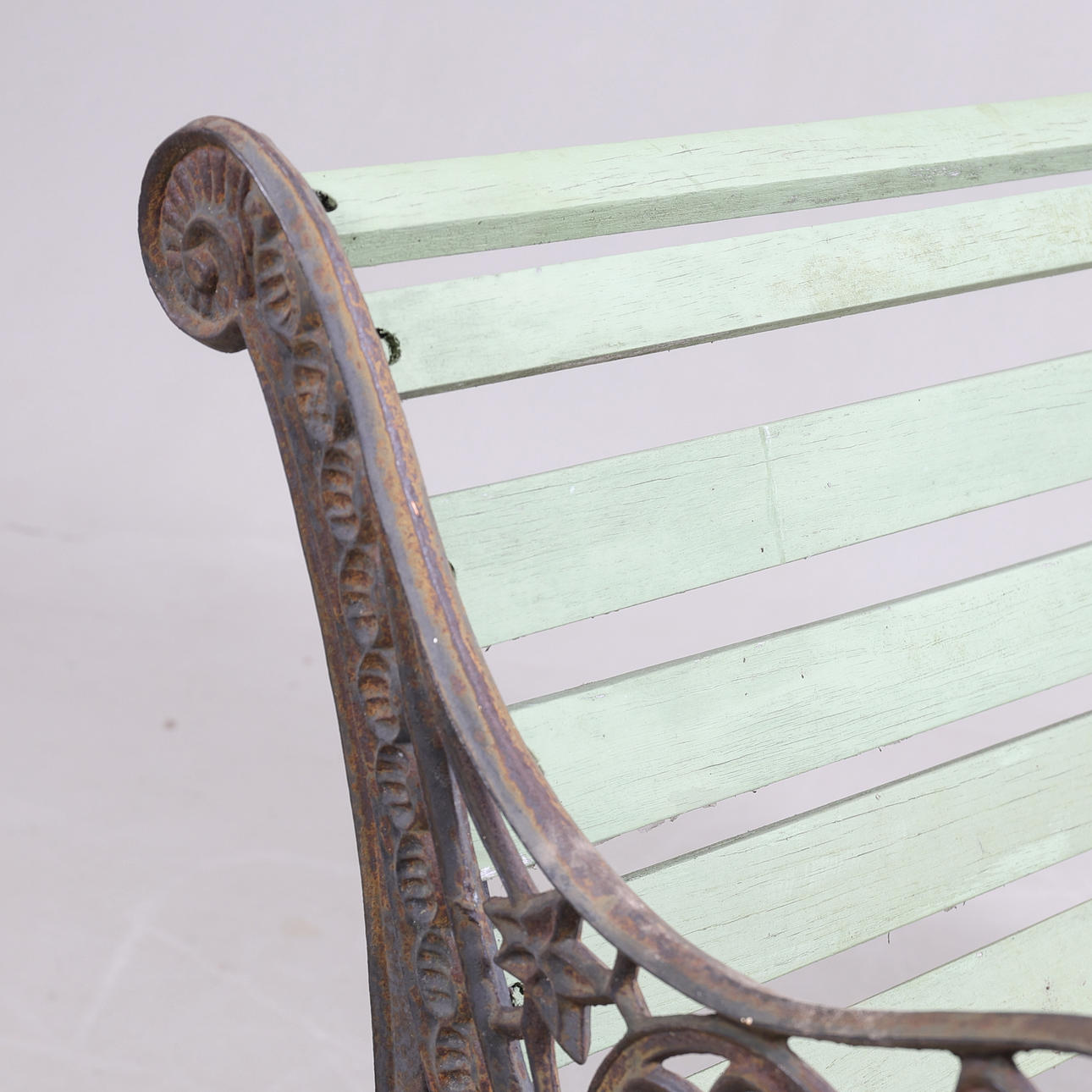 Gavlar i gjutjärn med genombruten dekor. Ribbor av bemålat trä.