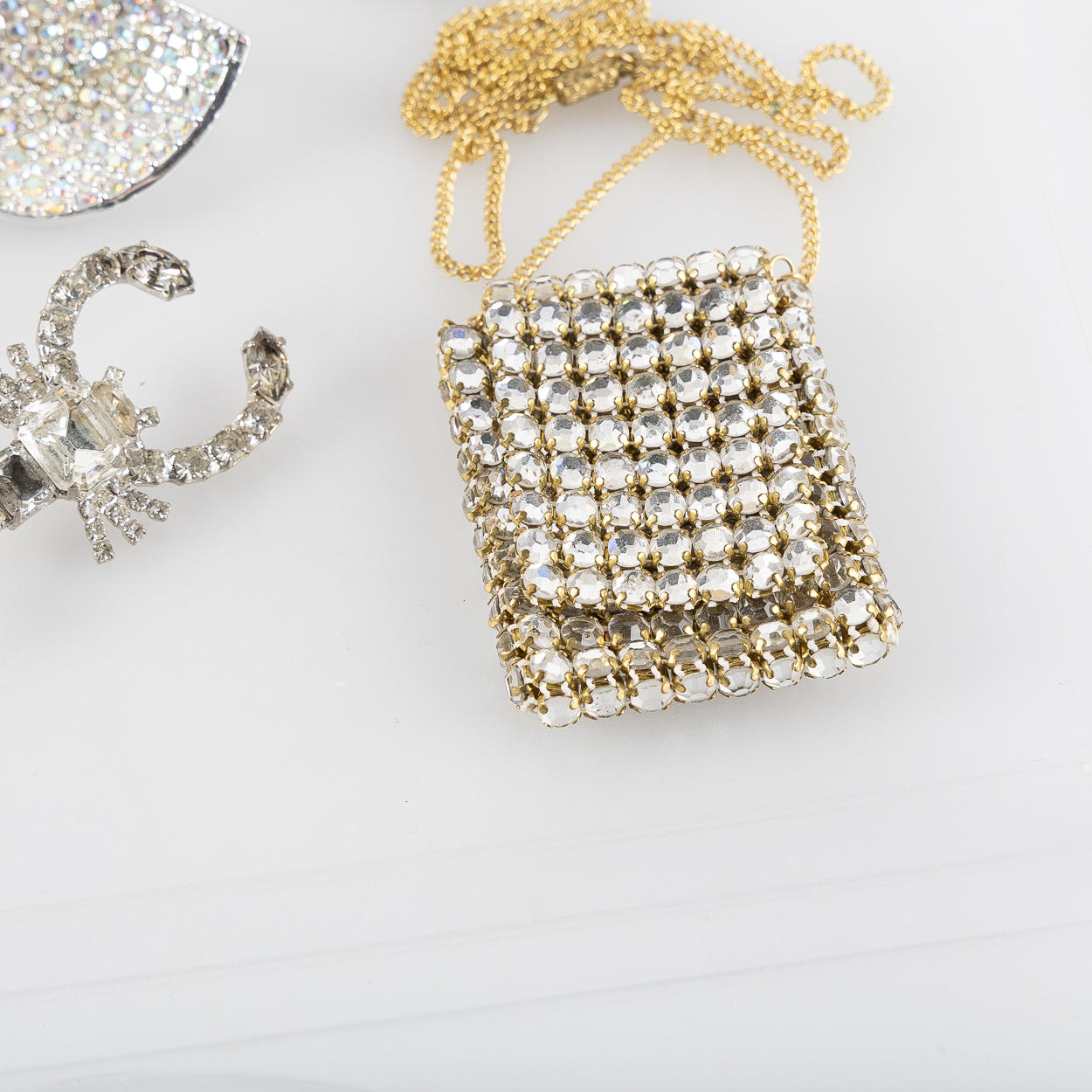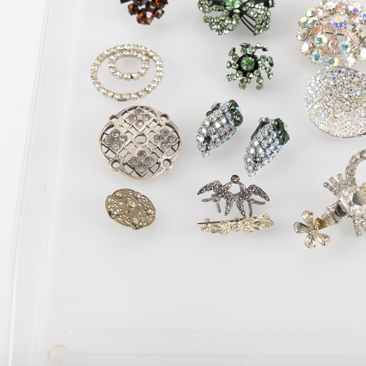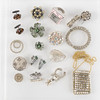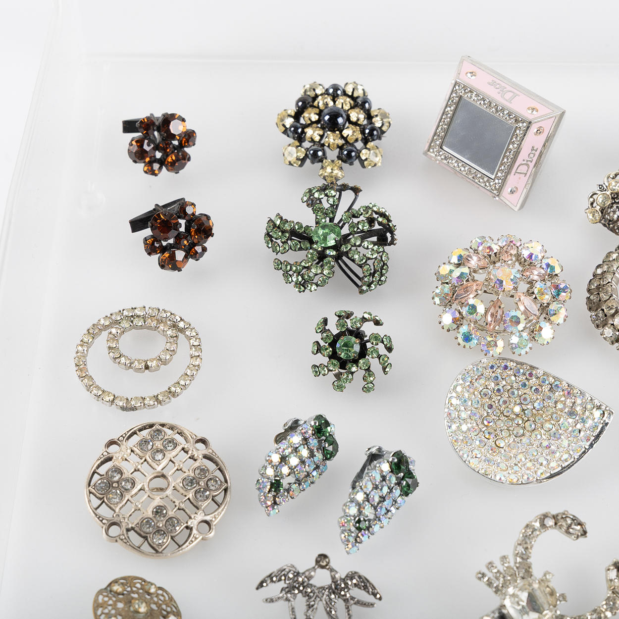 Knappar, broscher, manschettknappar, "Dior Princess Ring" smink- ring med spegel och öppningsbar med två fack för gloss, armband, spänne, 3 stycken clips samt miniatyrväska för parfymflakong i metall och strasstenar i glas.