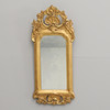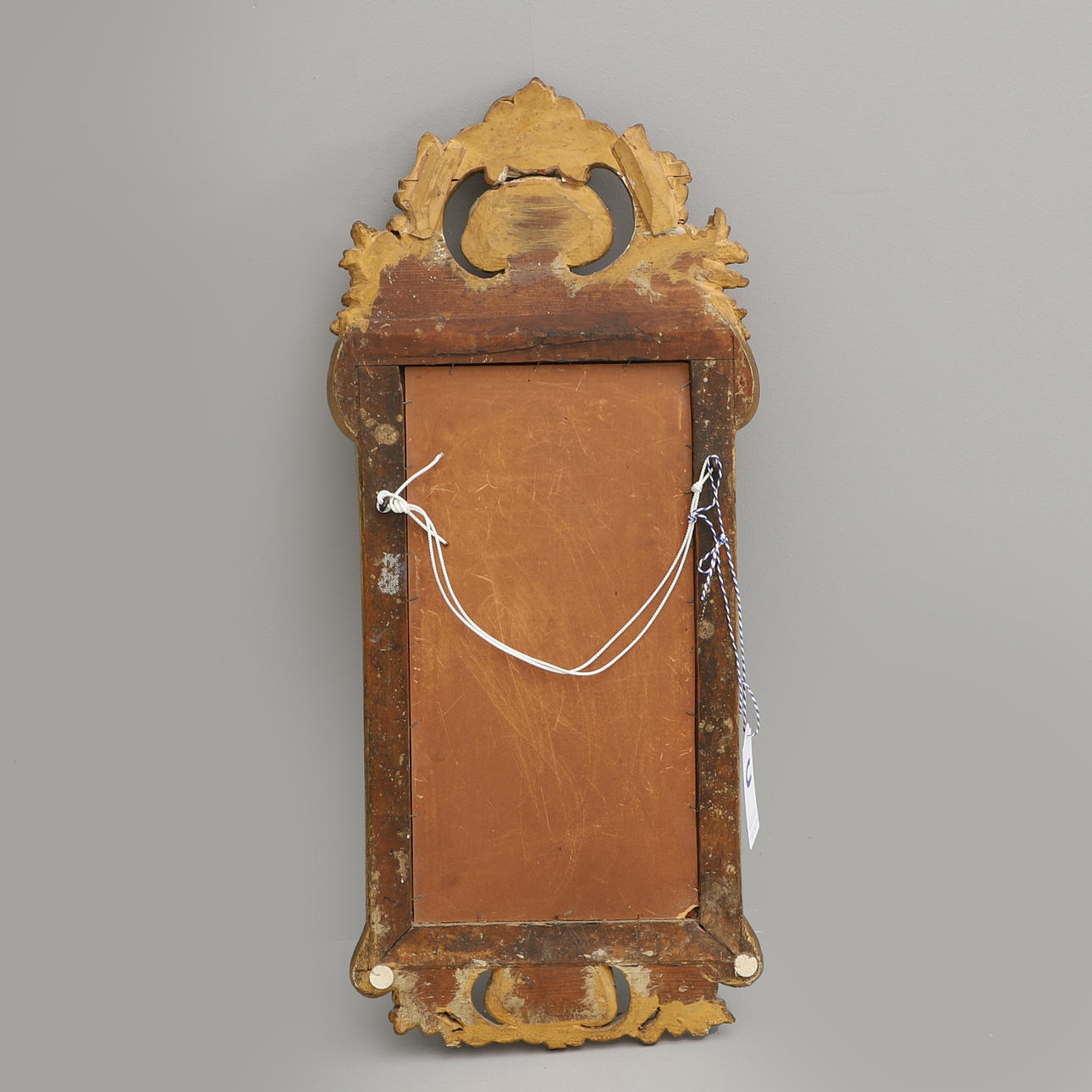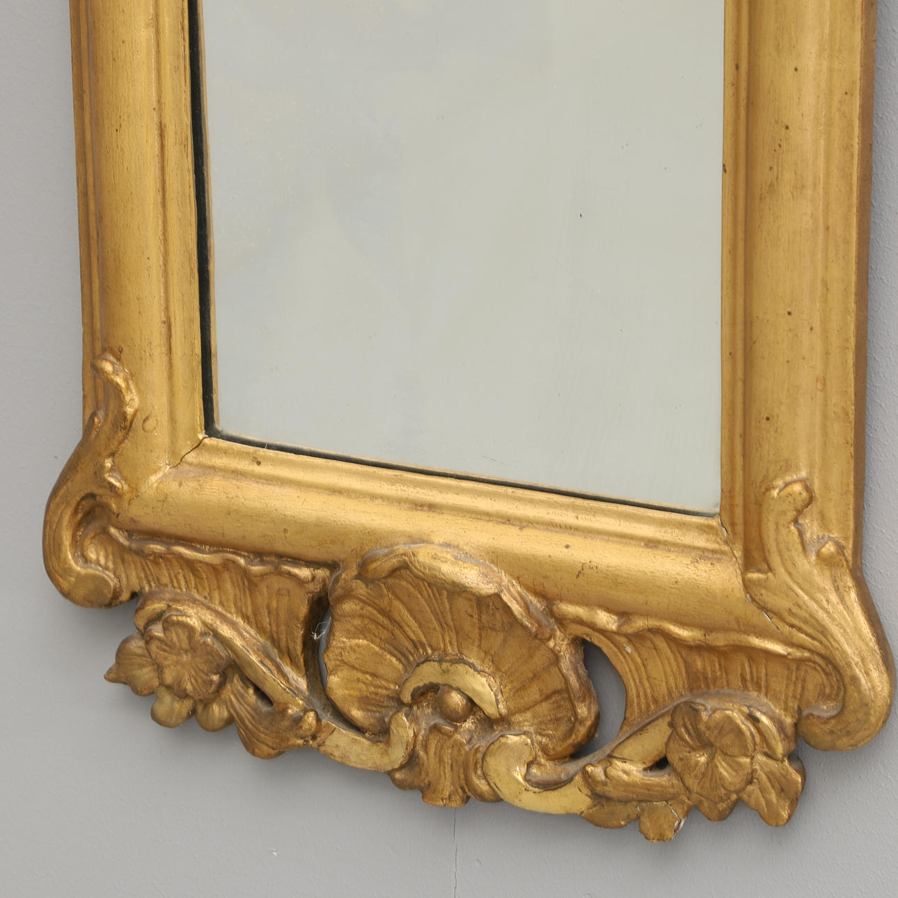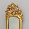 Bruks- och åldersrelaterat slitage. Senare förgyllning och bronsering. Senare spegelglas. Krön med lagning samt nedtill på spegeln.
