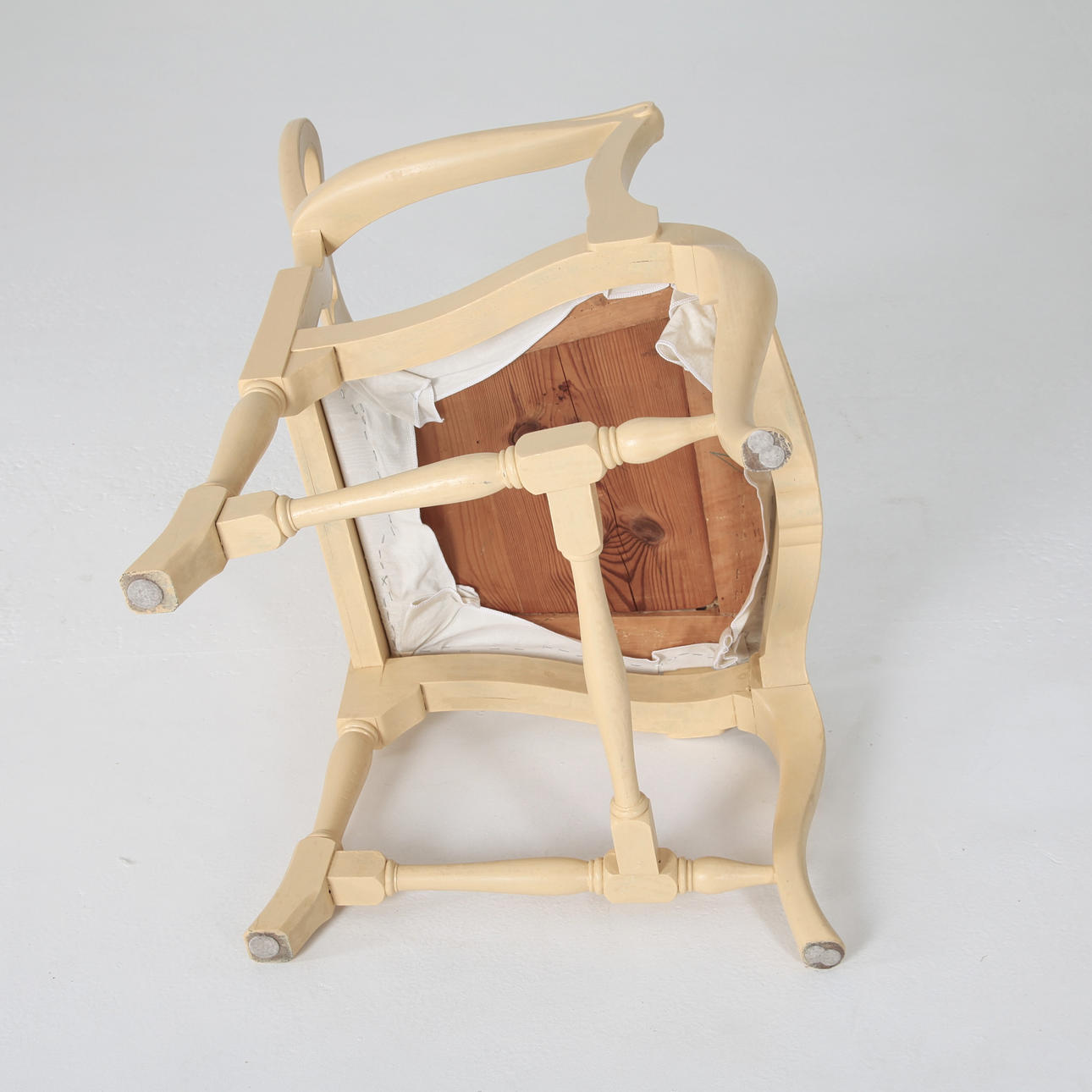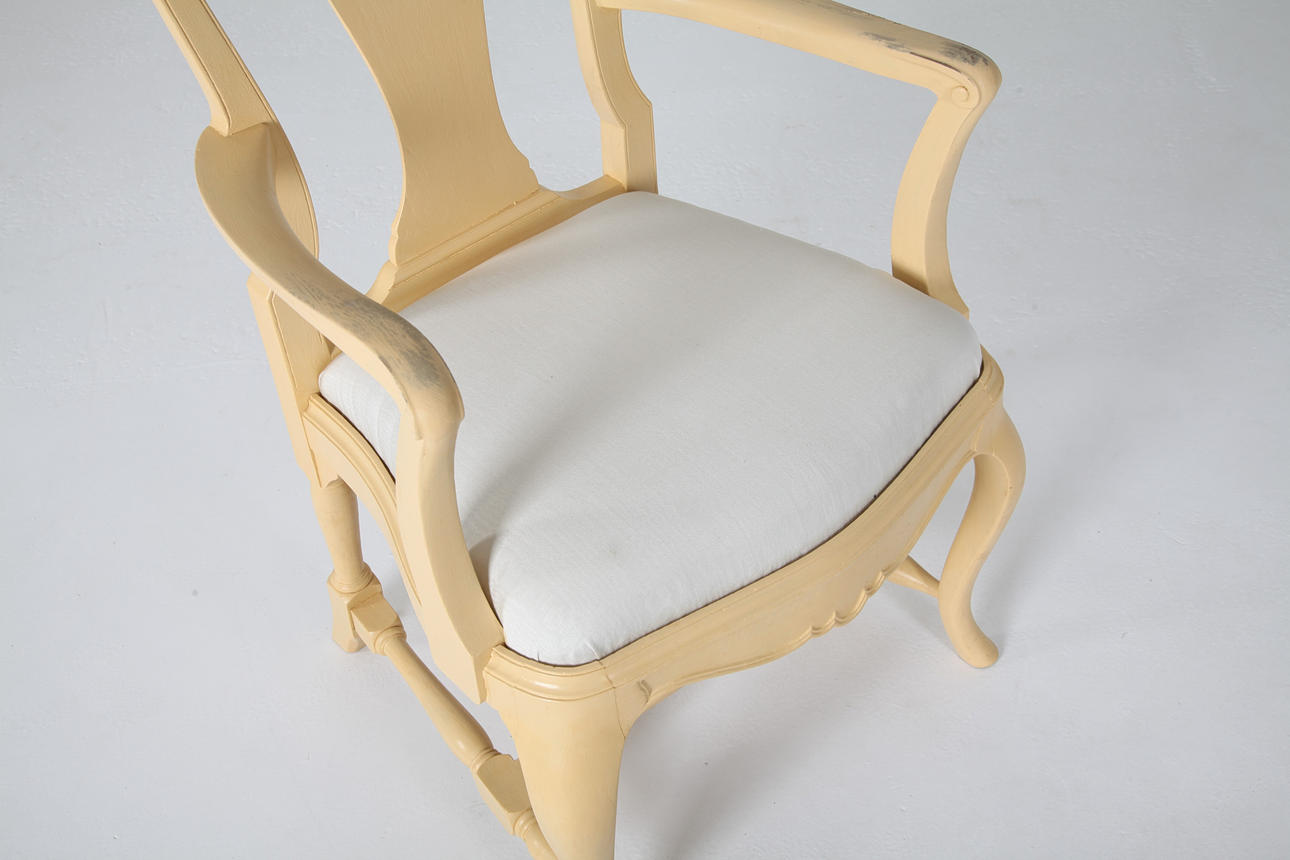 Målat lövträ, ljus gul. Lös sits med ljus möbeltextil.