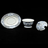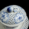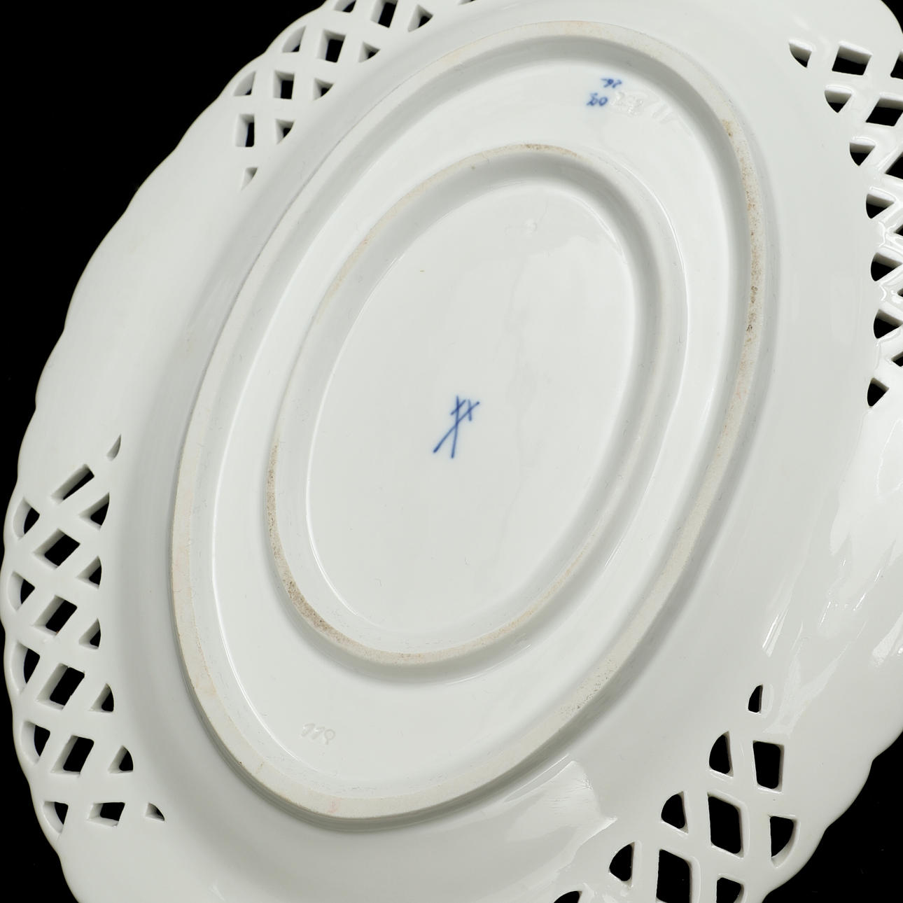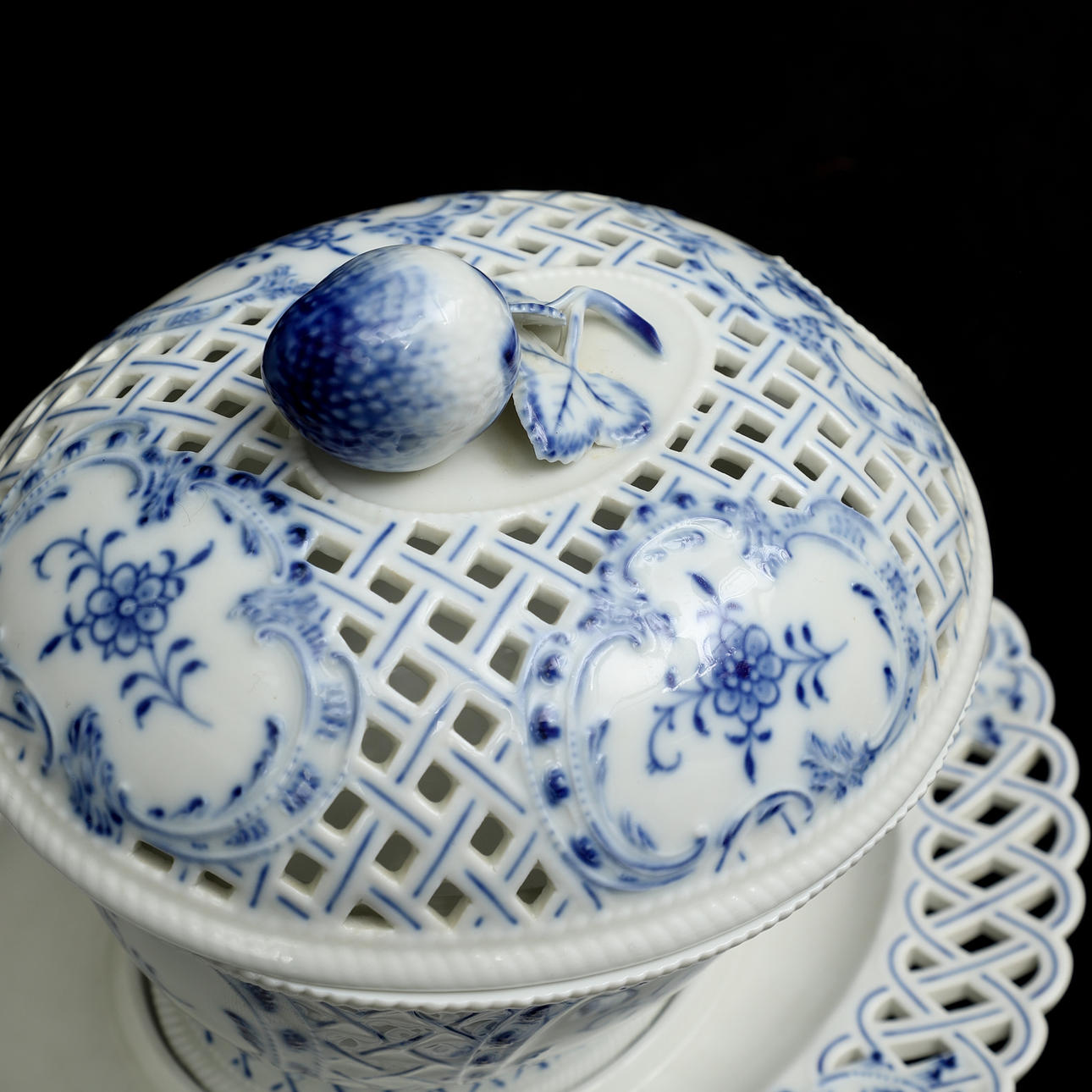 Porslin. Knopp i form av jordgubbe. Lockskål längd ca 17, höjd ca 16 cm. Fat längd 27,5 cm.