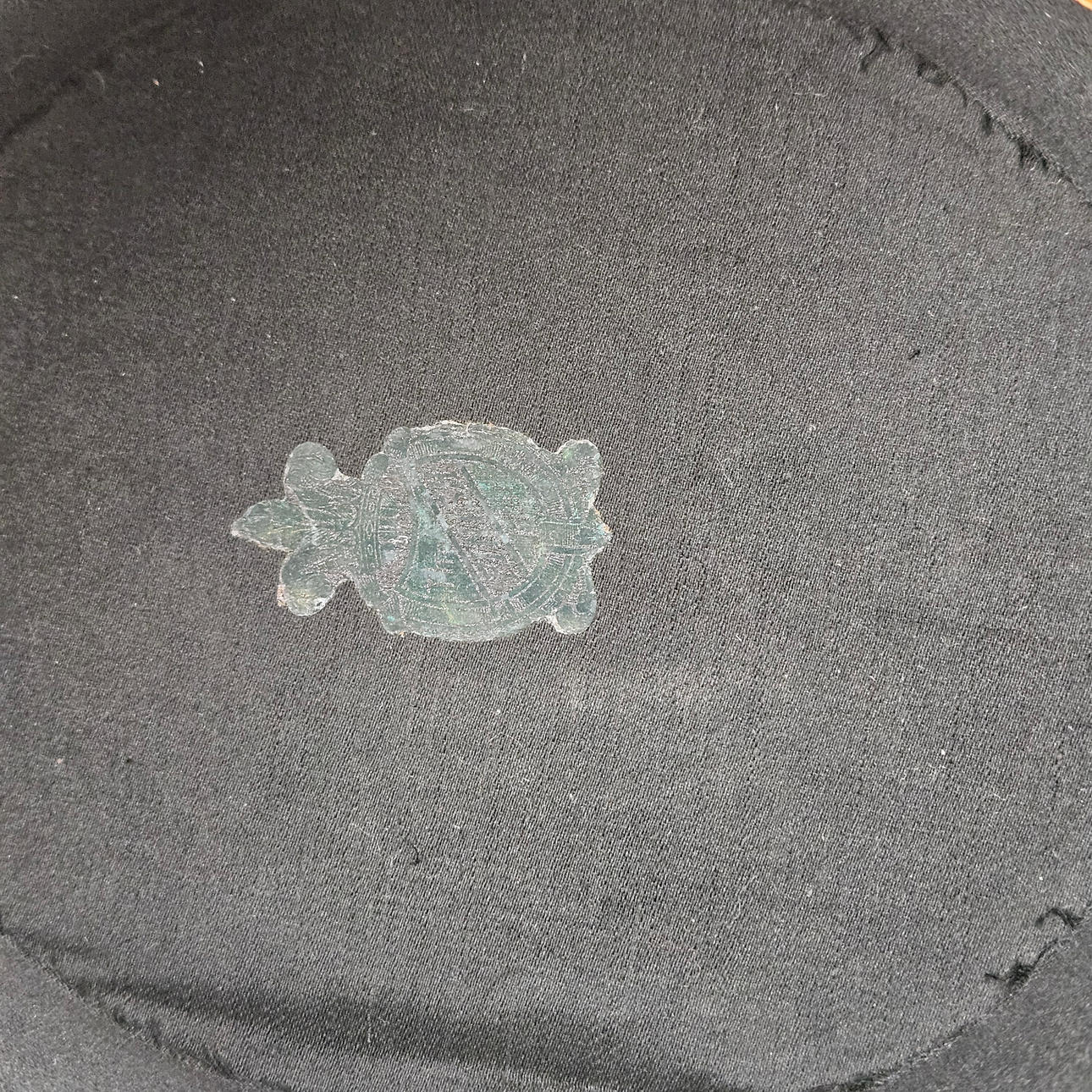 Invändiga fläckar, en med text i blyerts. Ask med mindre skador.