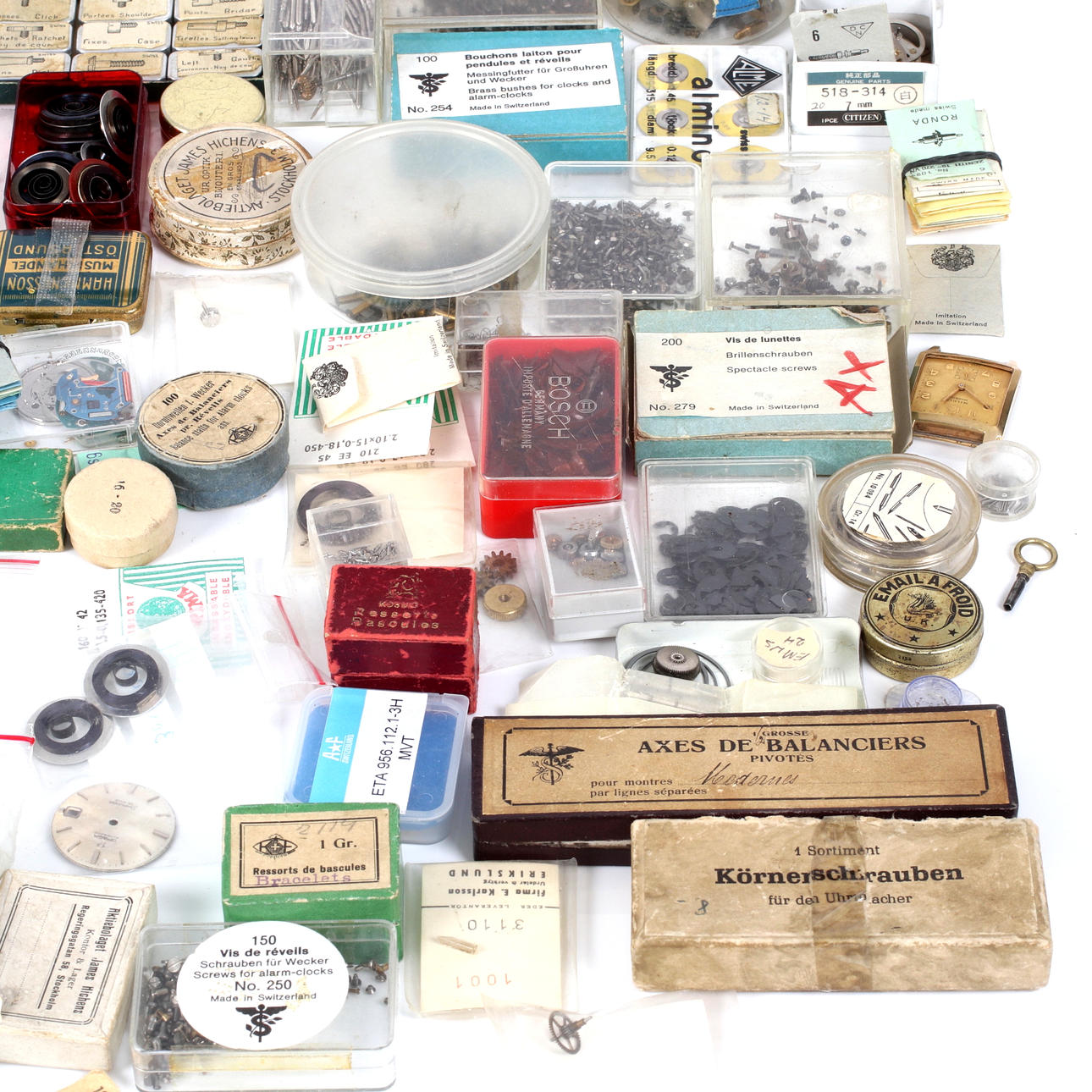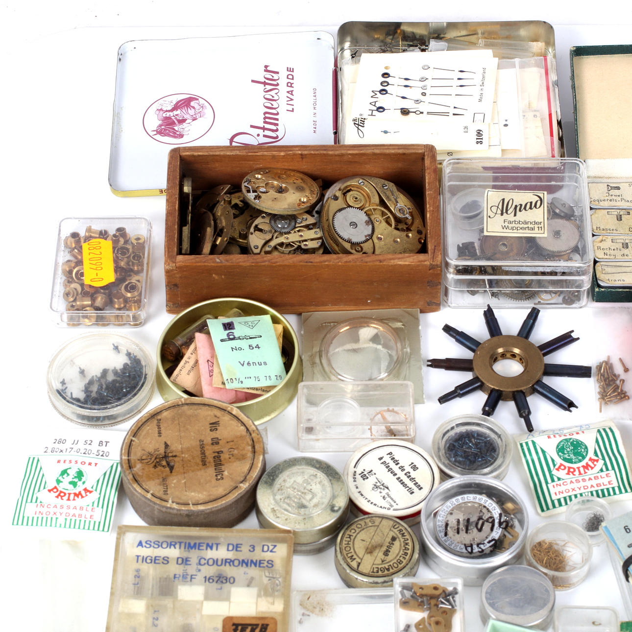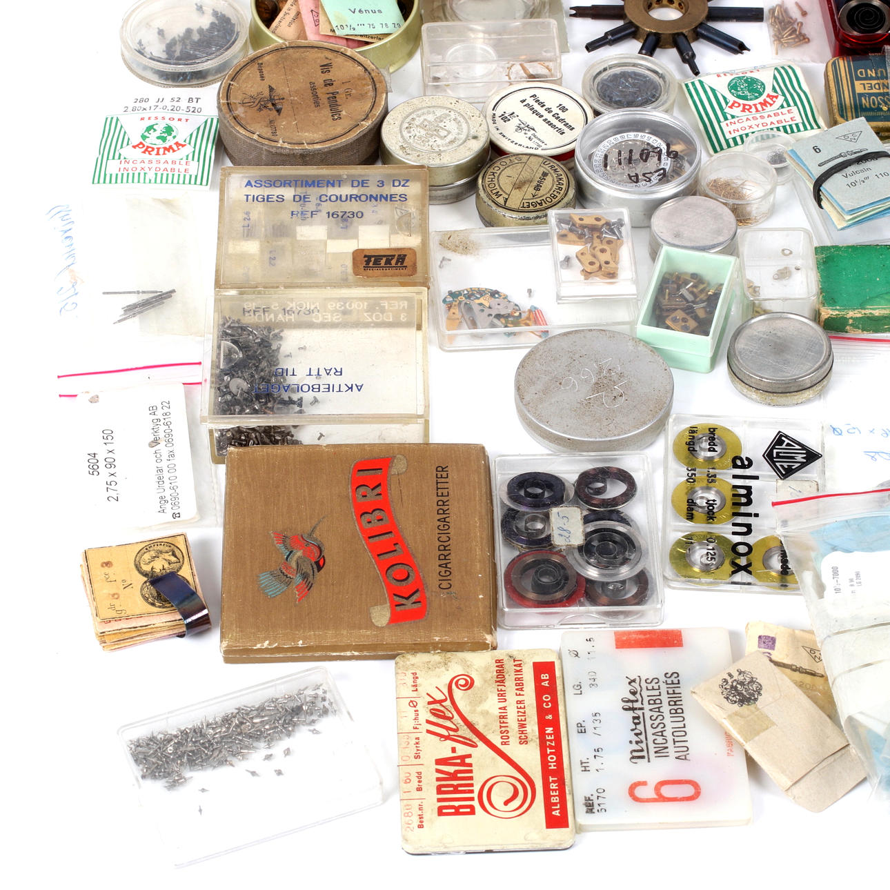 Klocksprintar, axlar, urverk, armbandsur, skurvar, kugghjul, fjädrar mm.