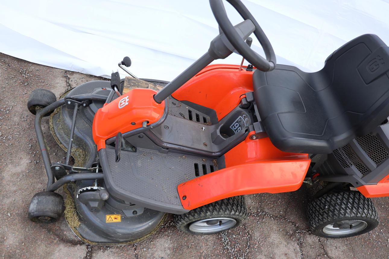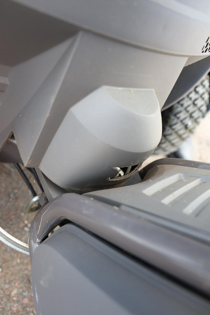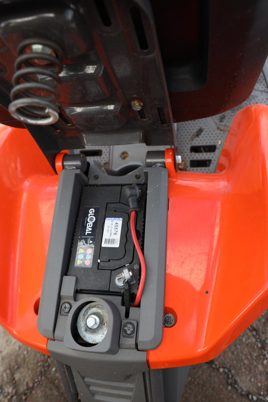 Fungerar enligt uppgift, men batteriet behöver laddas/bytas. Punktering, plastskador. Kompletterat med extra fotstöd.