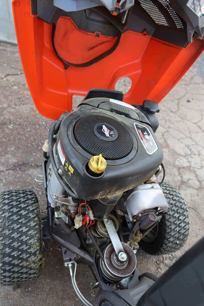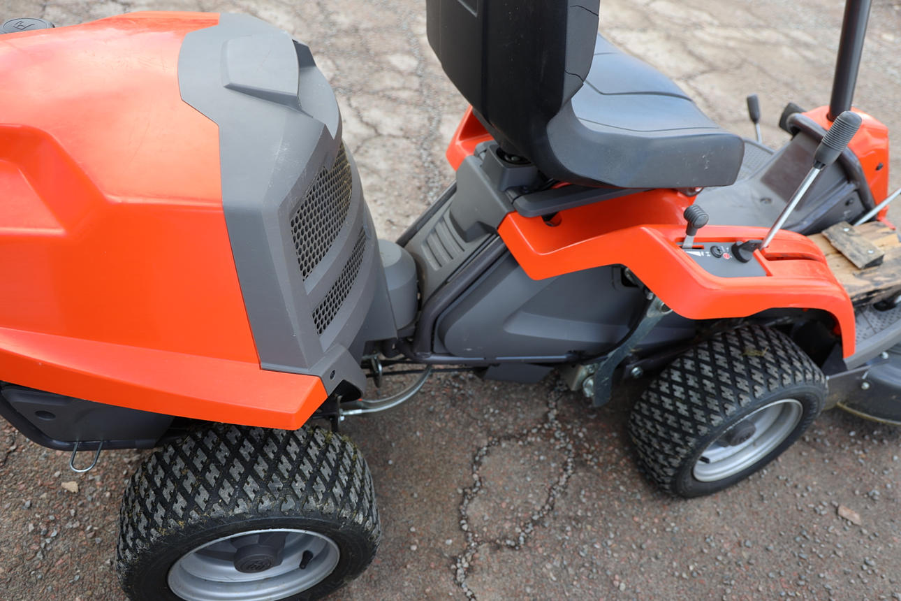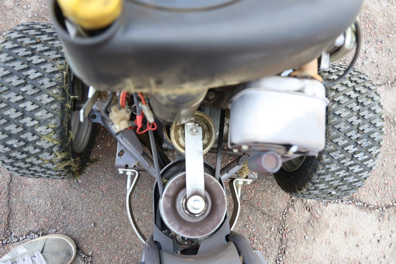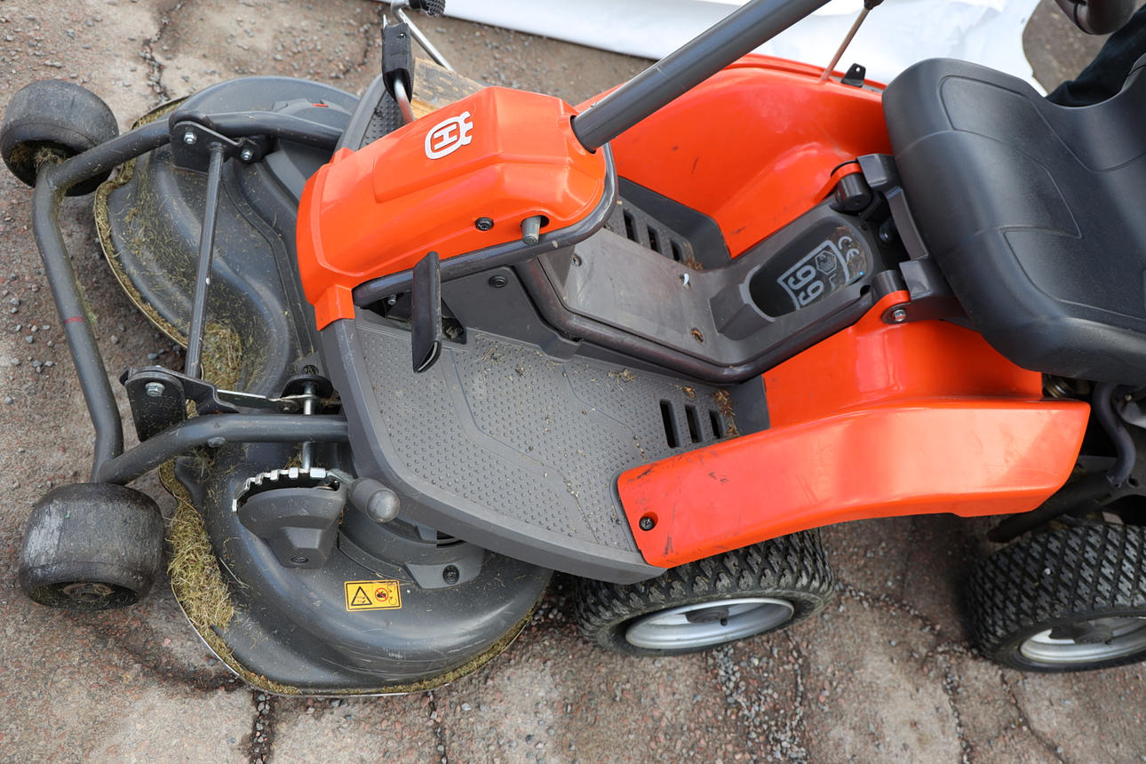 Fungerar enligt uppgift, men batteriet behöver laddas/bytas. Punktering, plastskador. Kompletterat med extra fotstöd.