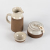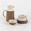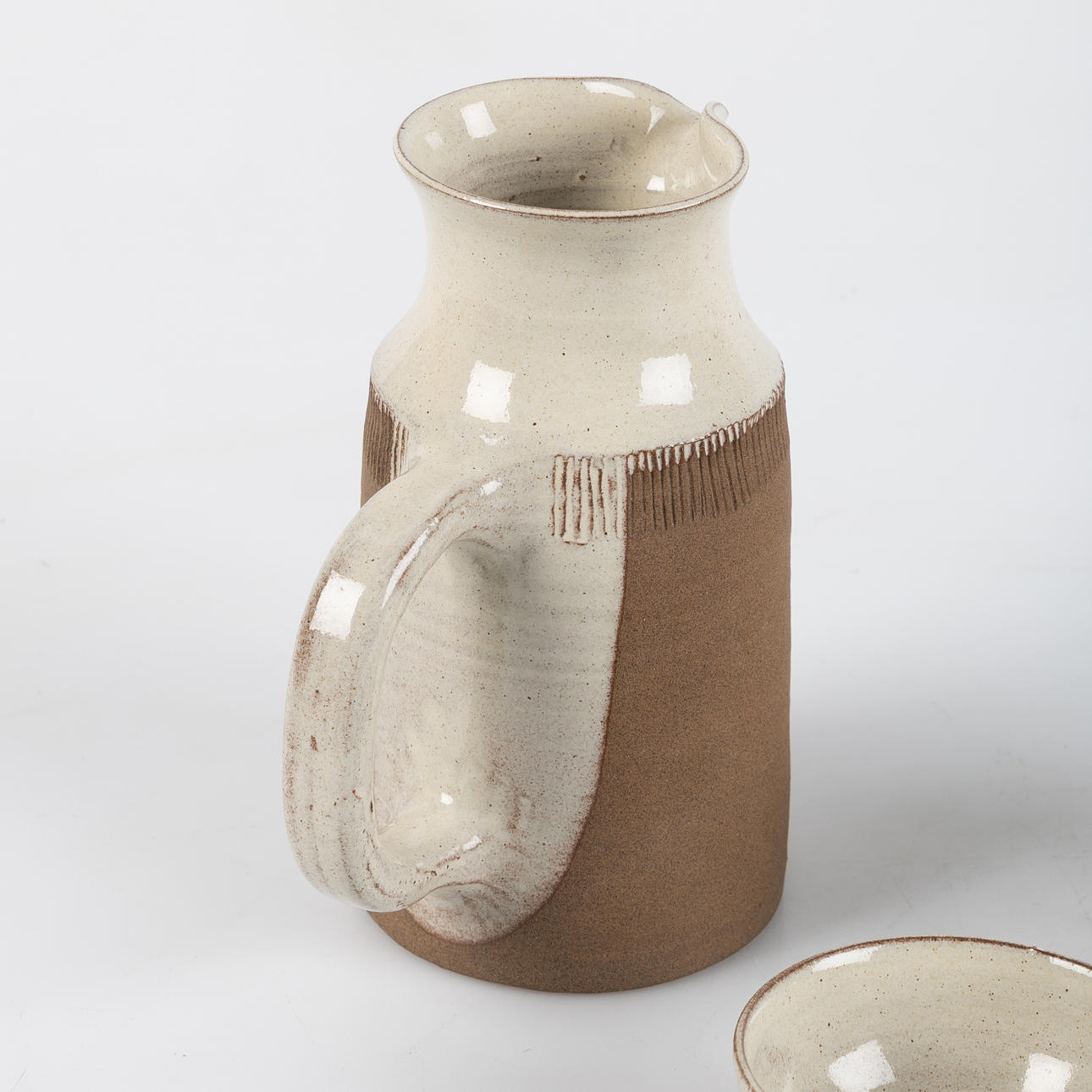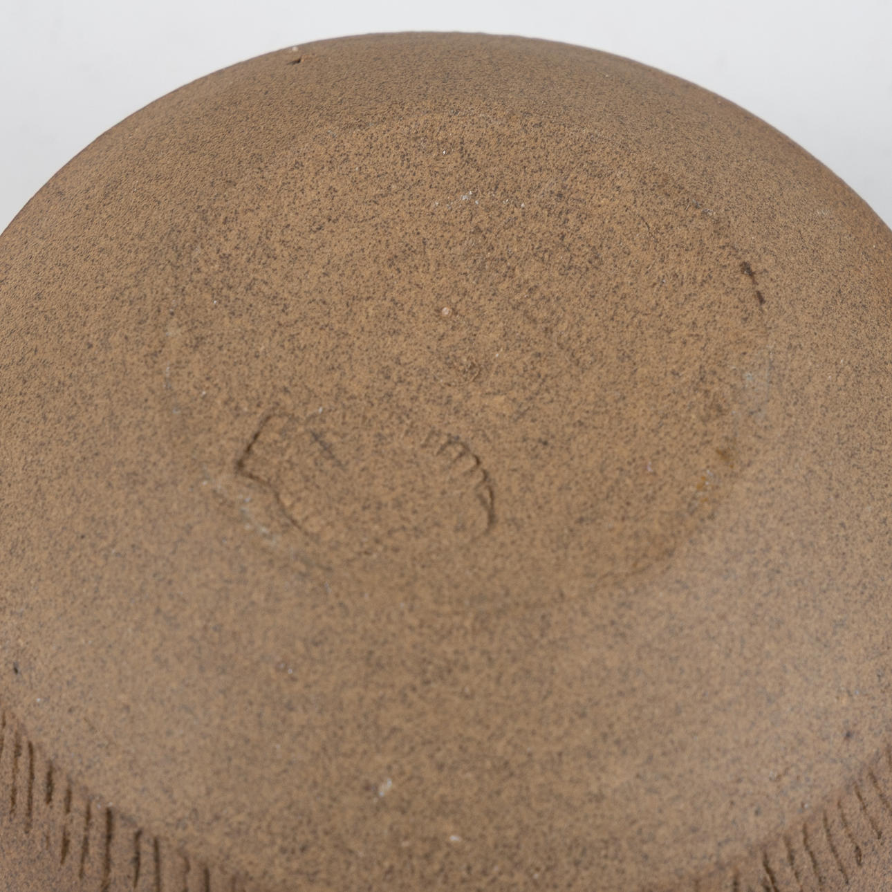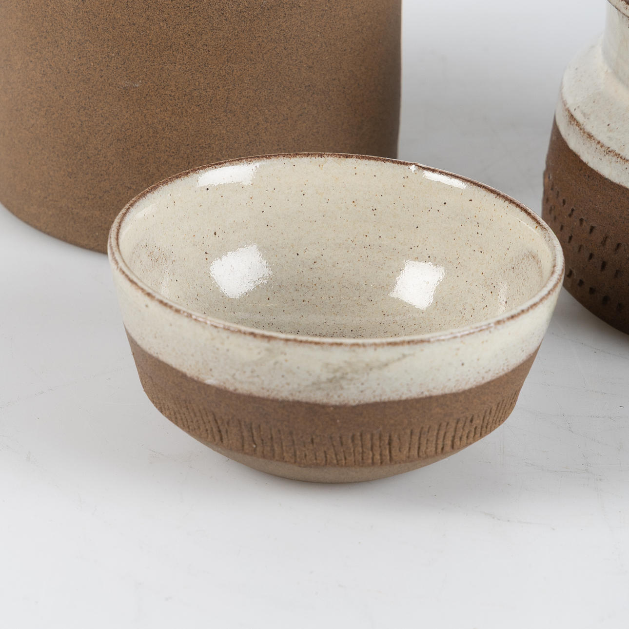 Kanna, skål samt lockburk Inpressad dekor, delvis glaserade Höjd 4,5-18,5 cm.