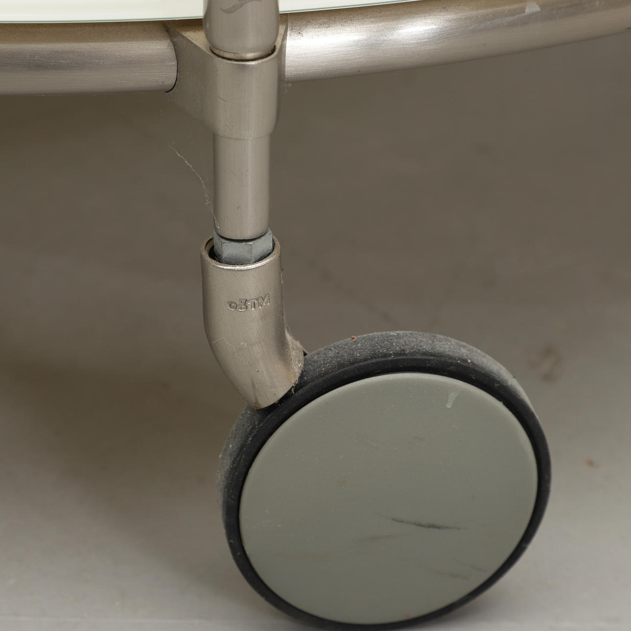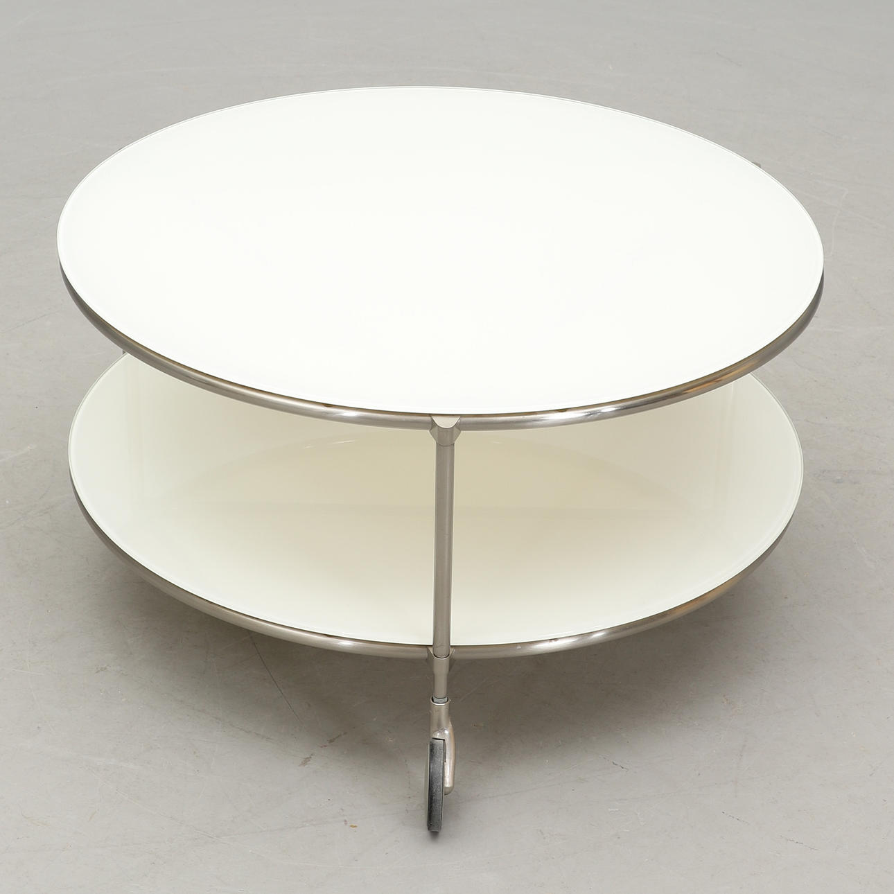 Metallstomme på hjul. Skivor av glas. Diameter 75, höjd 40 cm.