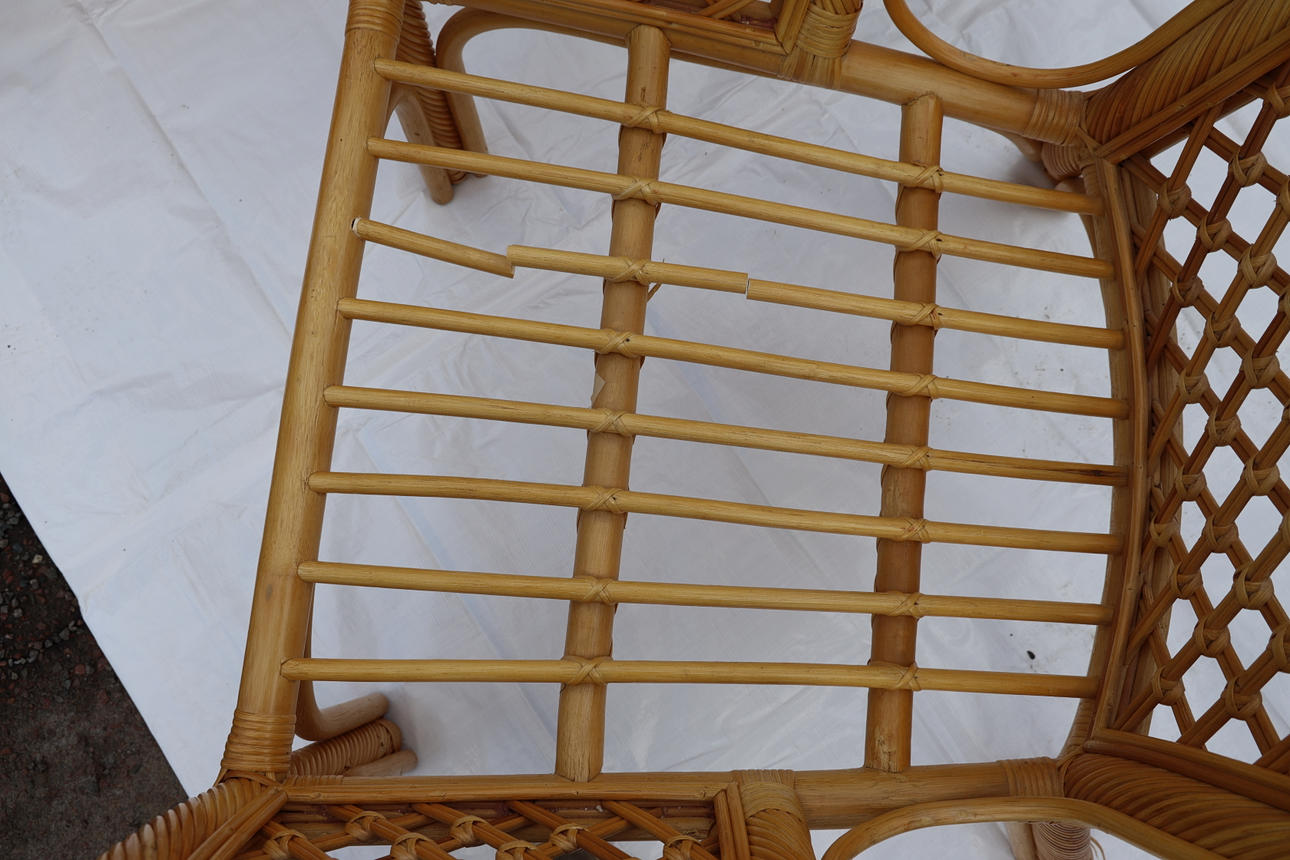 Slitage, sittdel med mindre träskador. Bruks- och åldersrelaterat slitage.