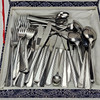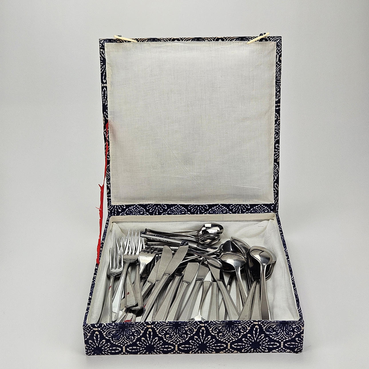 12 bordsgafflar, 12 bordsknivar, 12 bordsskedar, 12 kaffeskedar, 2 smörknivar.