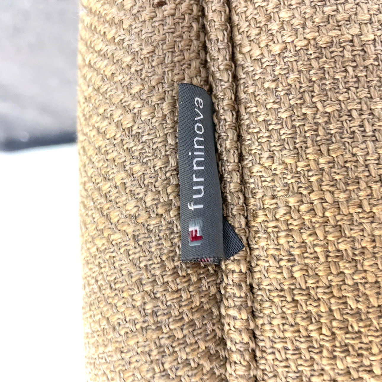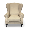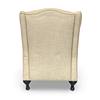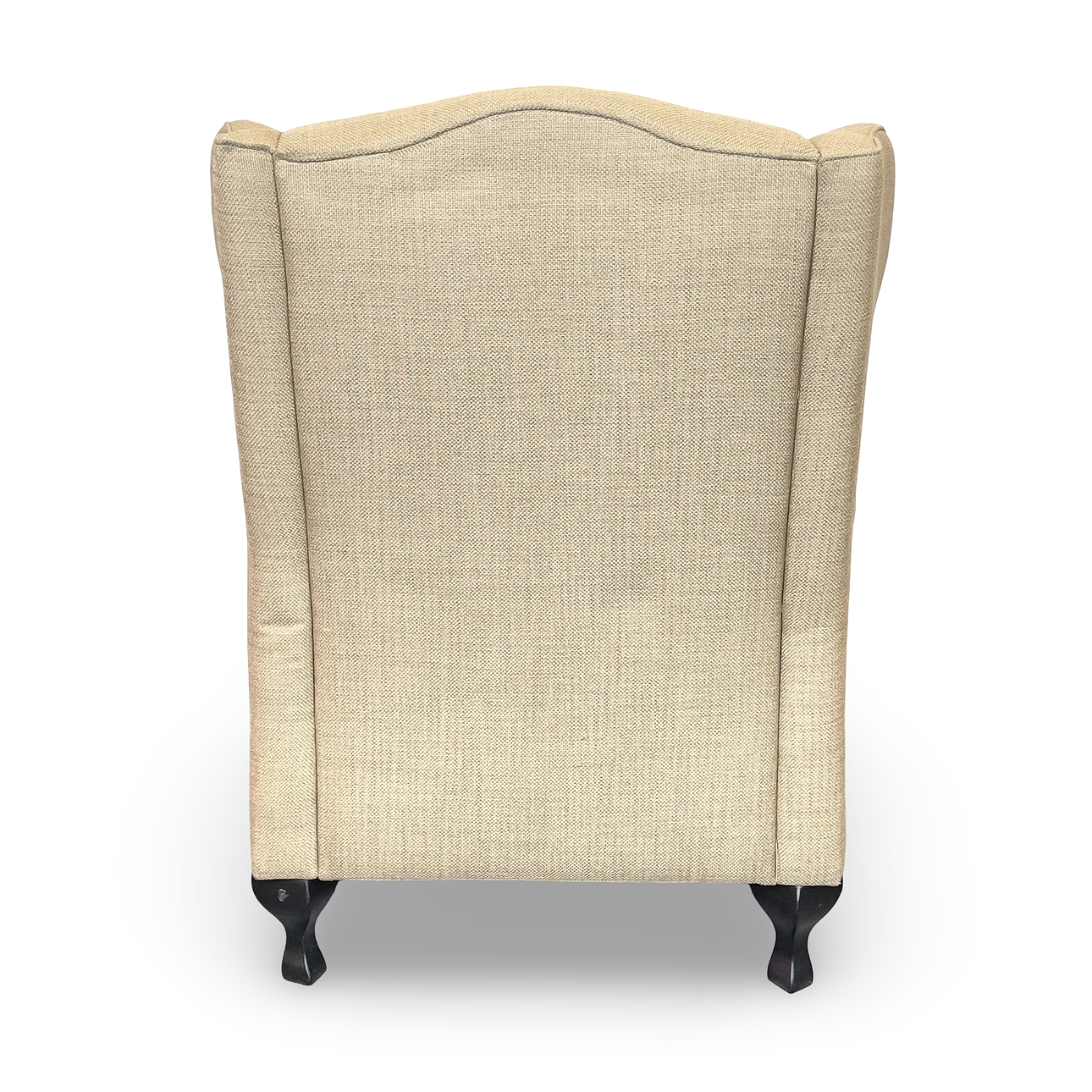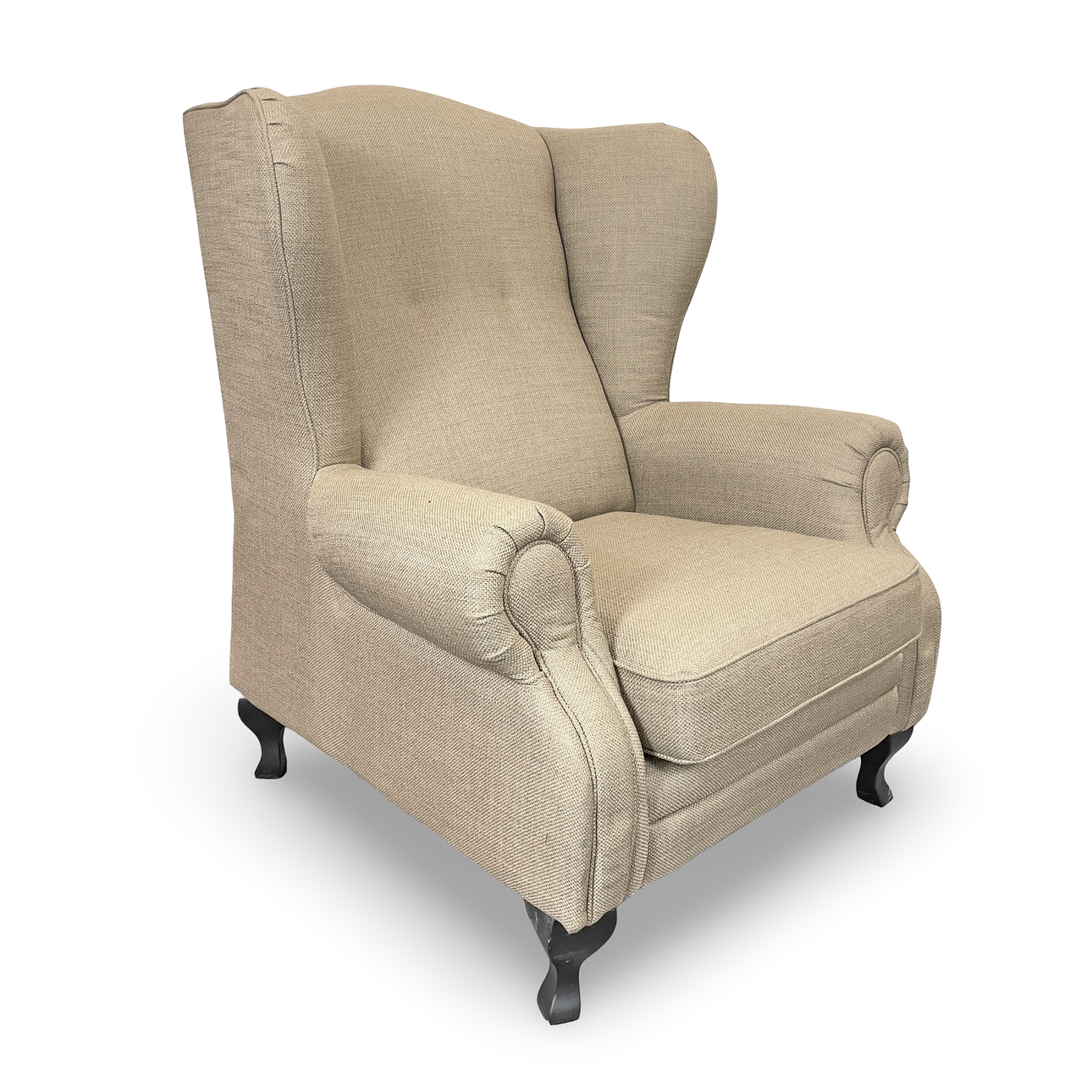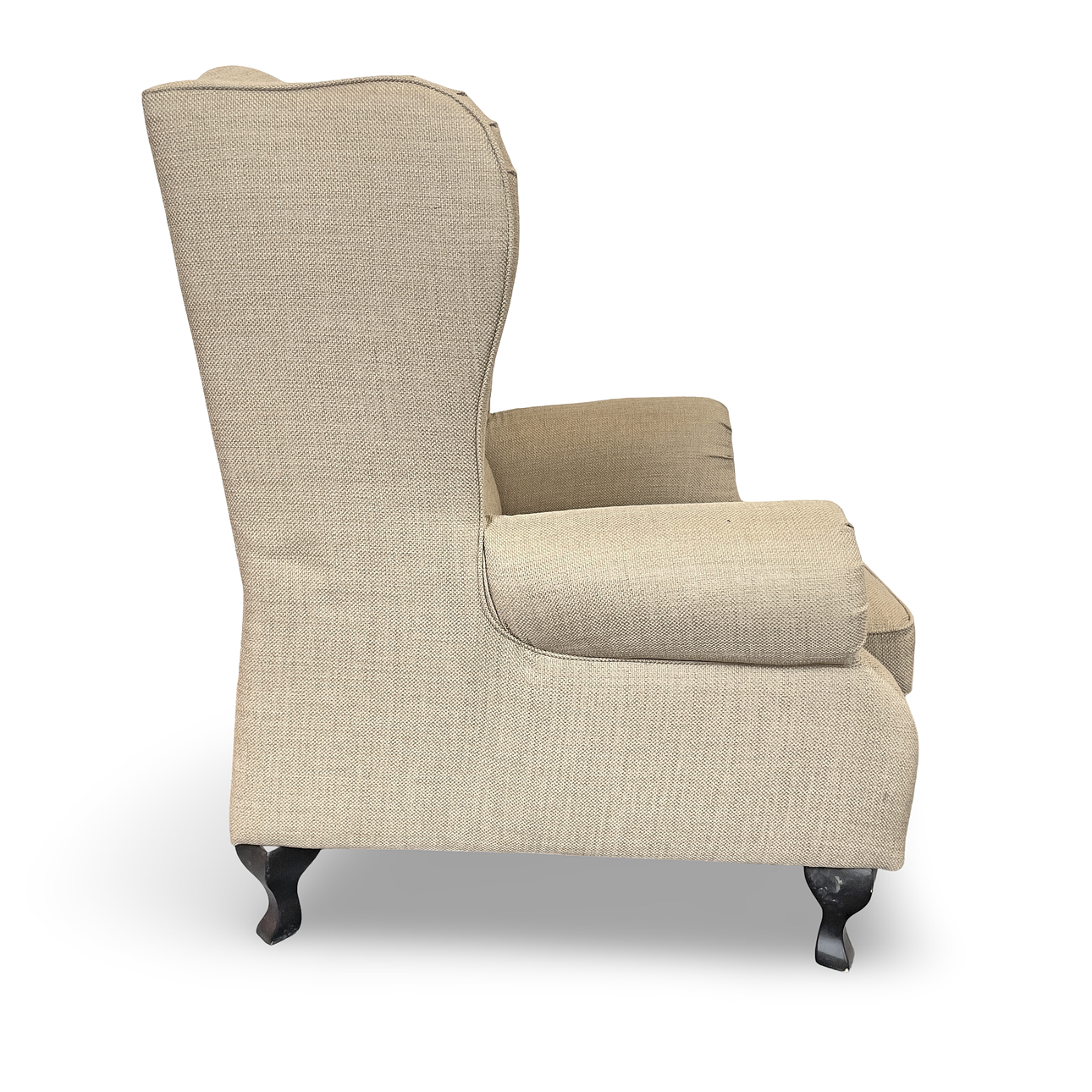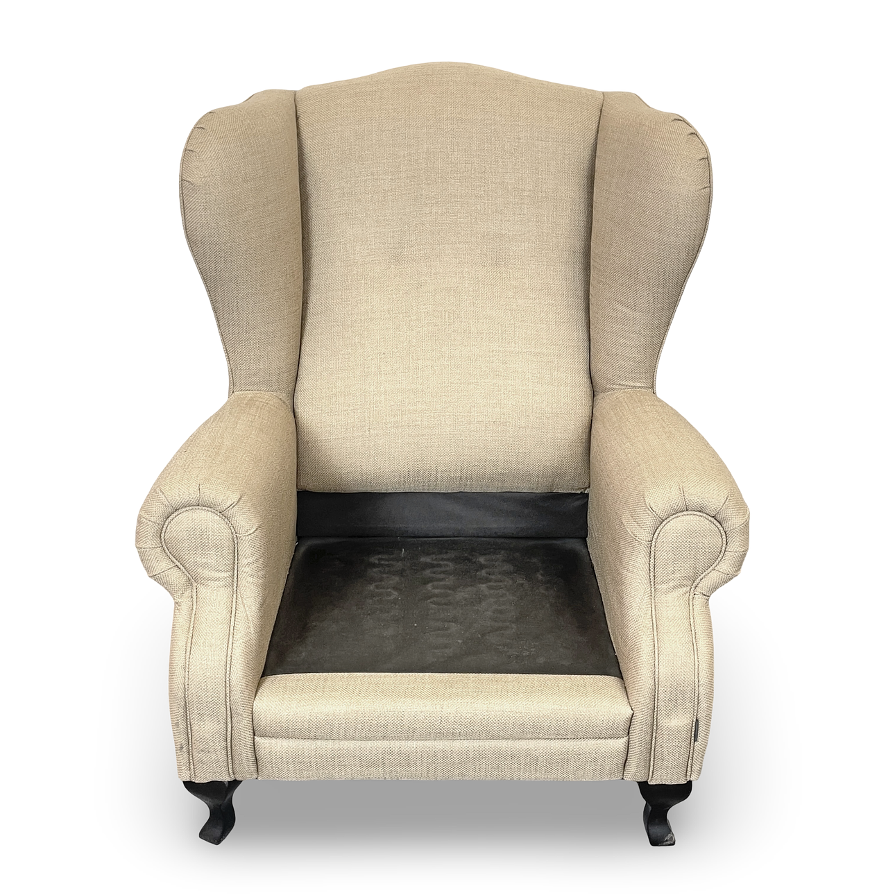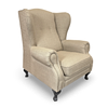 Öronlappsfåtölj klädd i beige textil med lös sittplymå. Etikettmärkt "Furninova".