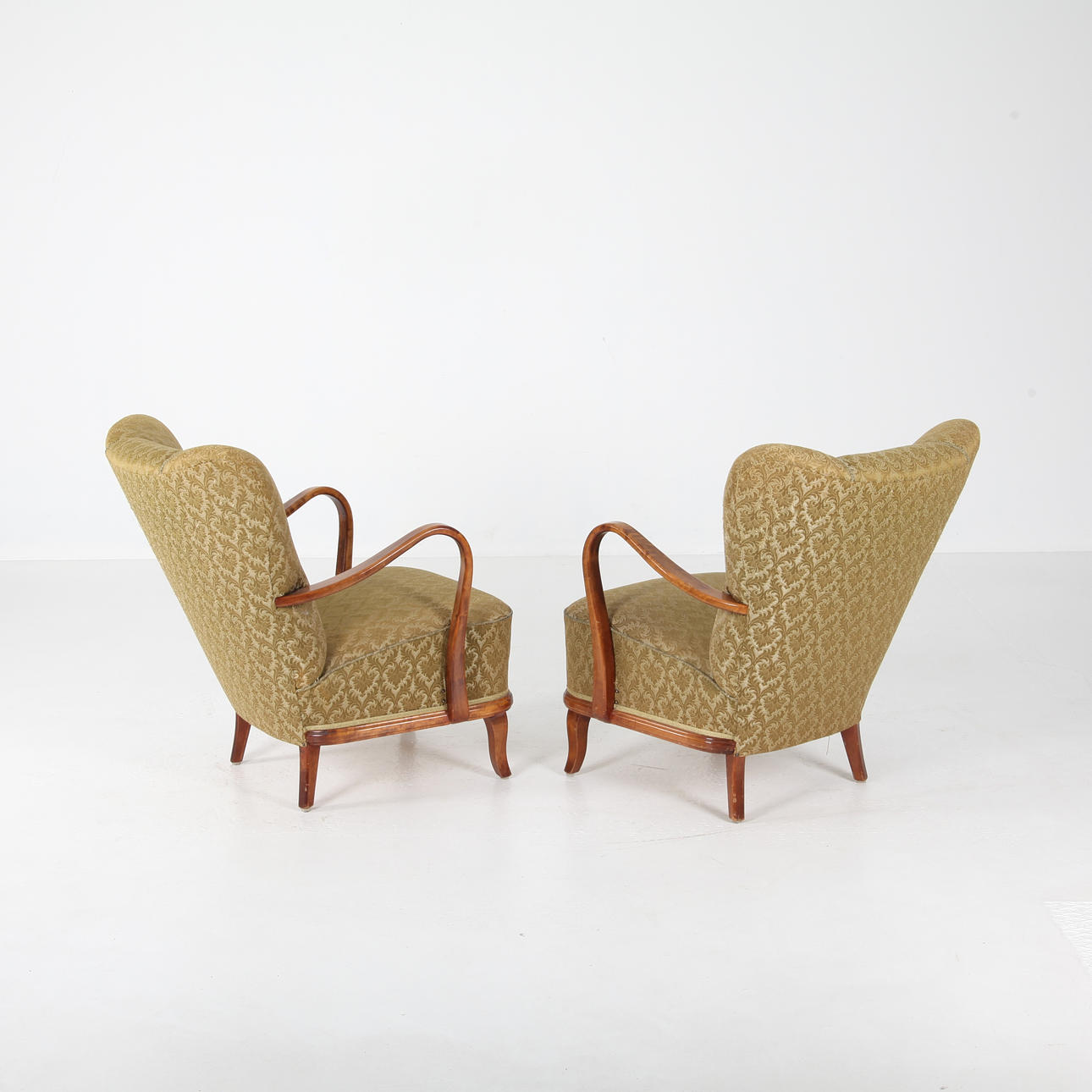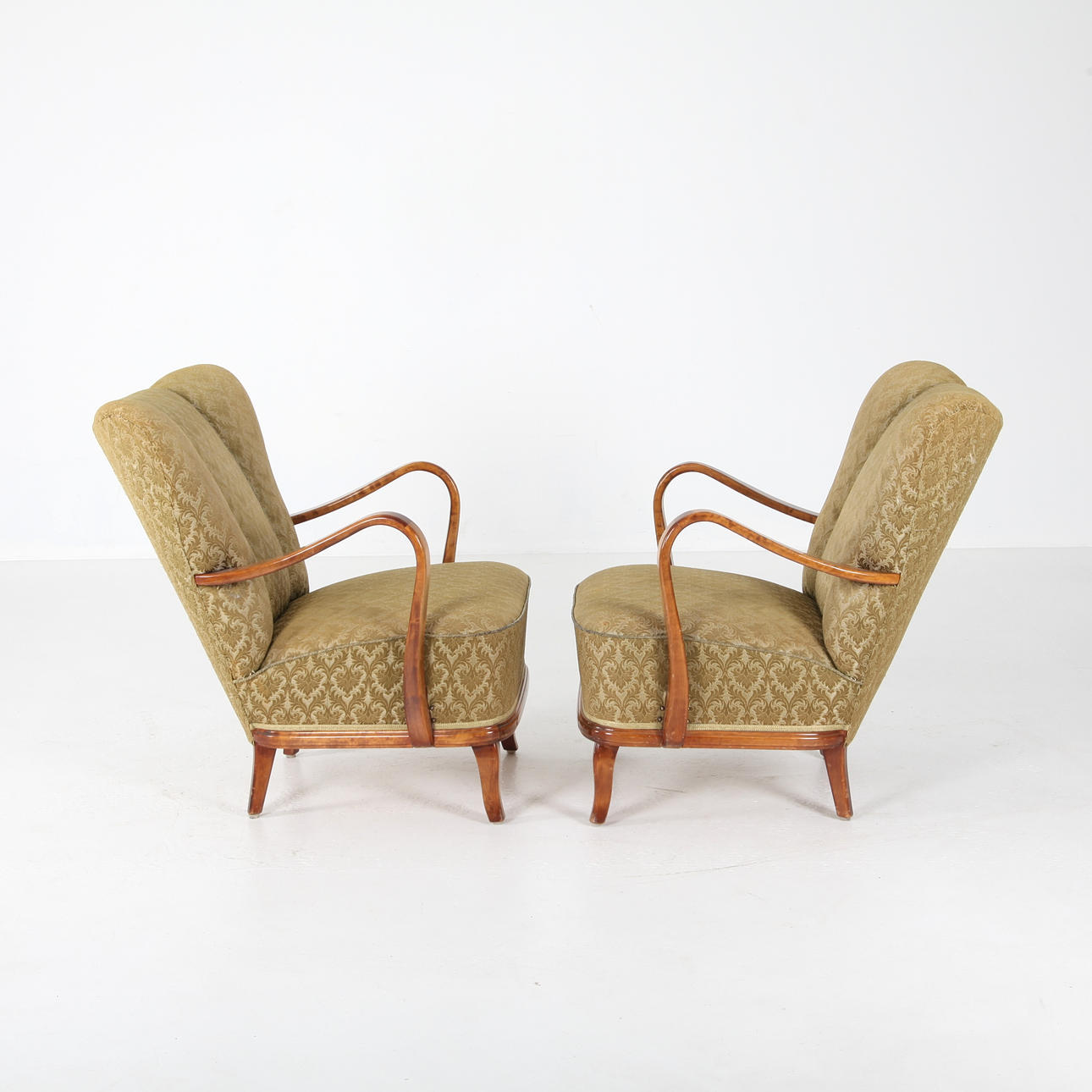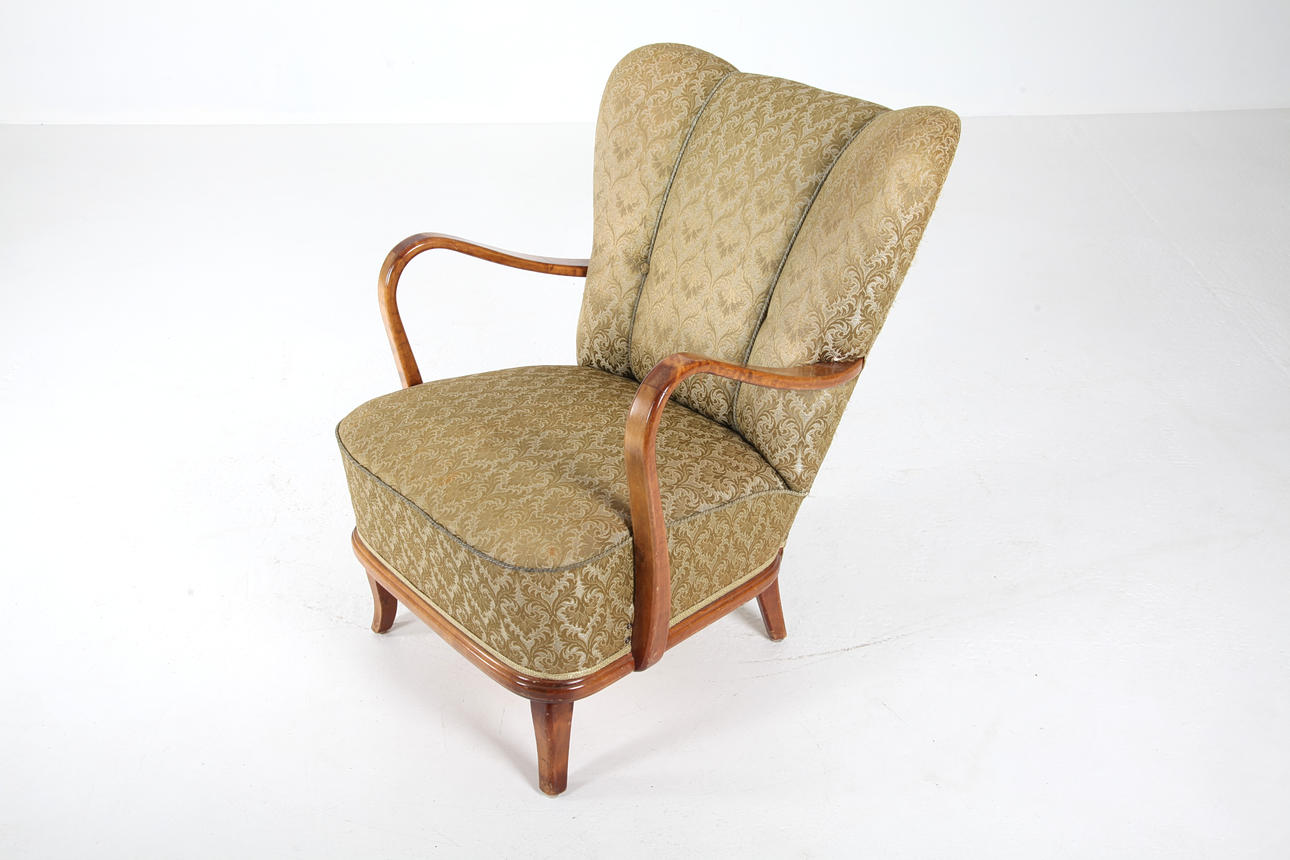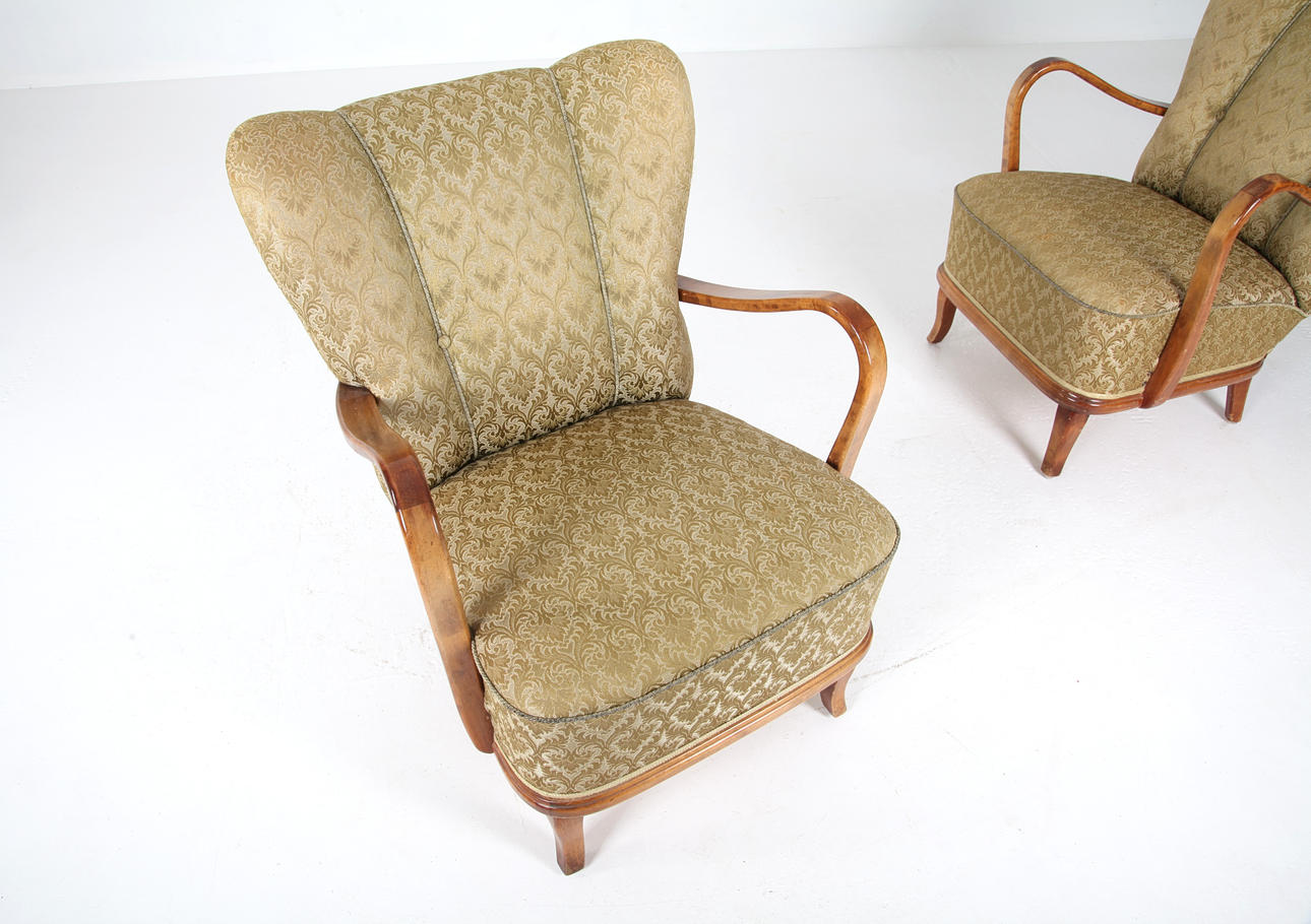 1 par fåtöljer, bonad björk, helklädda. Höjd 85 cm Bredd yttermått 70 cm.