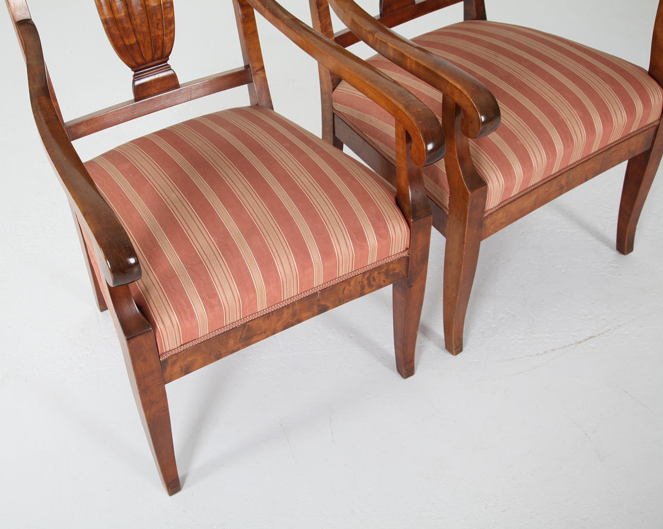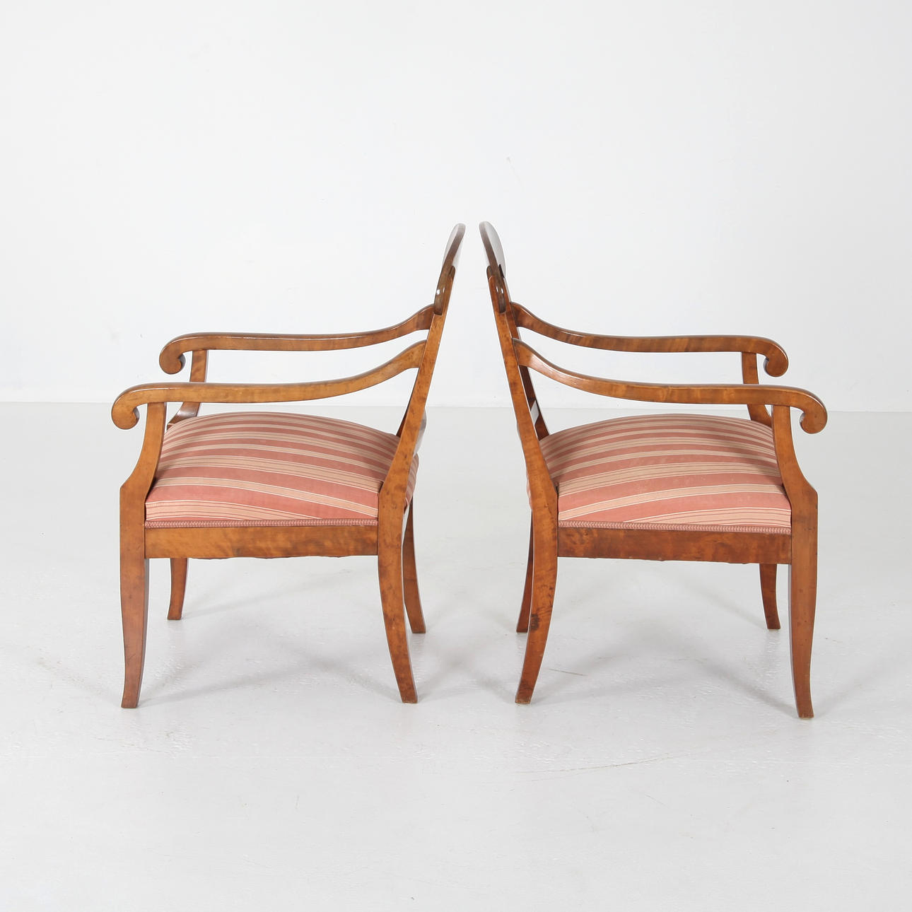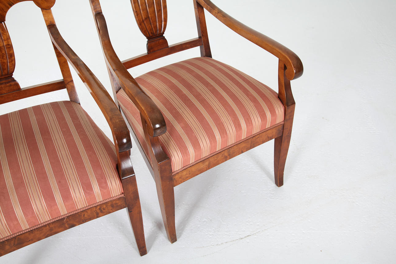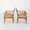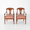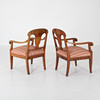 1 par karmstolar, bonad björk, stoppad sits. Sverige omkring 1920. Höjd 88 cm Bredd yttermått 58 cm.