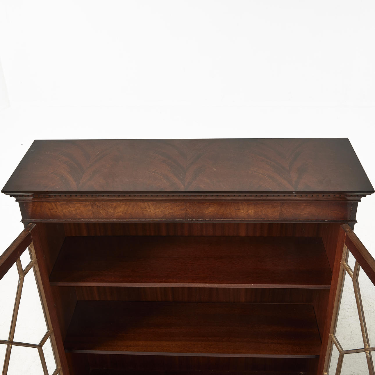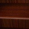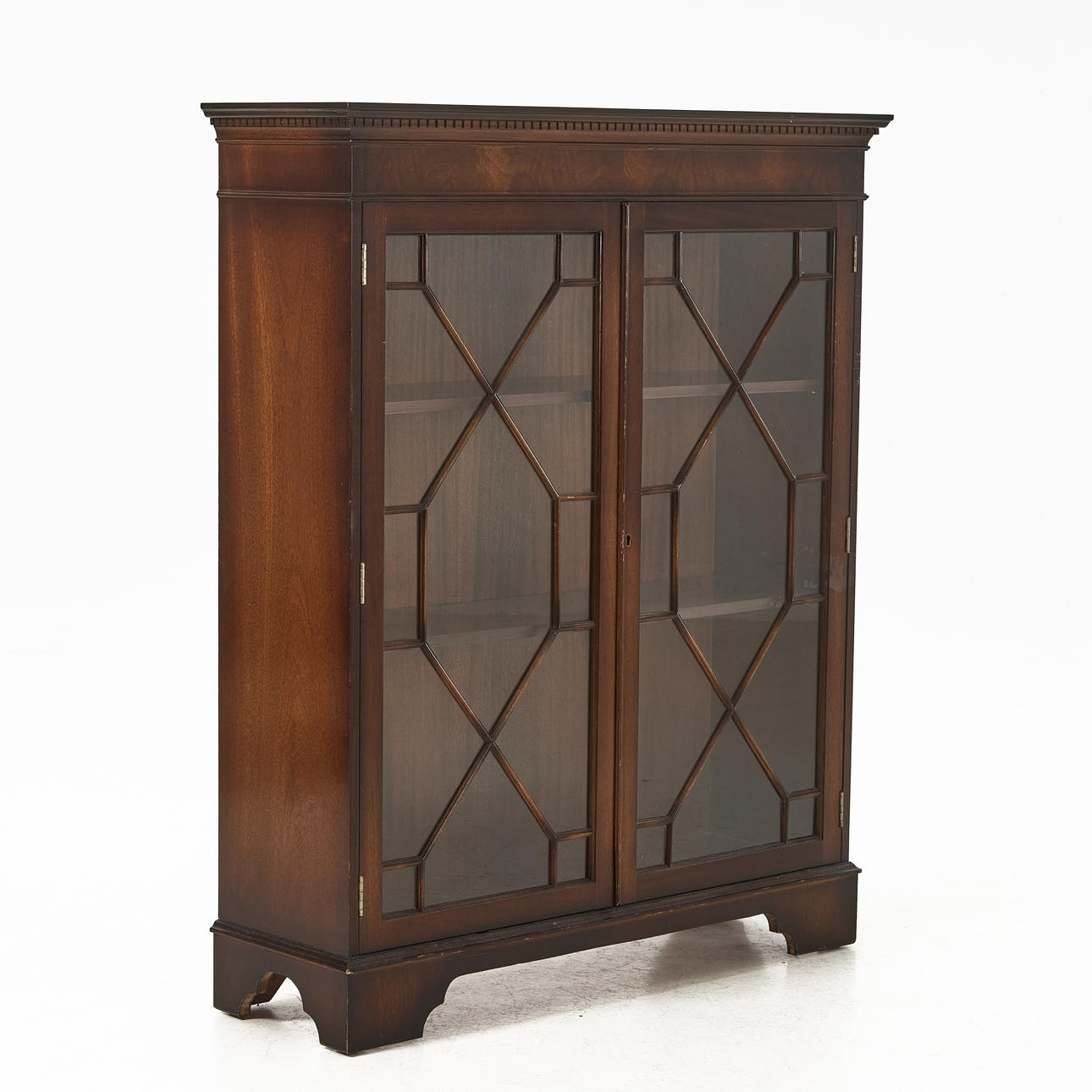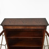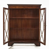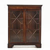 Fanerad i mahogny, glasdörrar, två justerbara hyllplan, mått ca 120, 98 x 31 cm.
