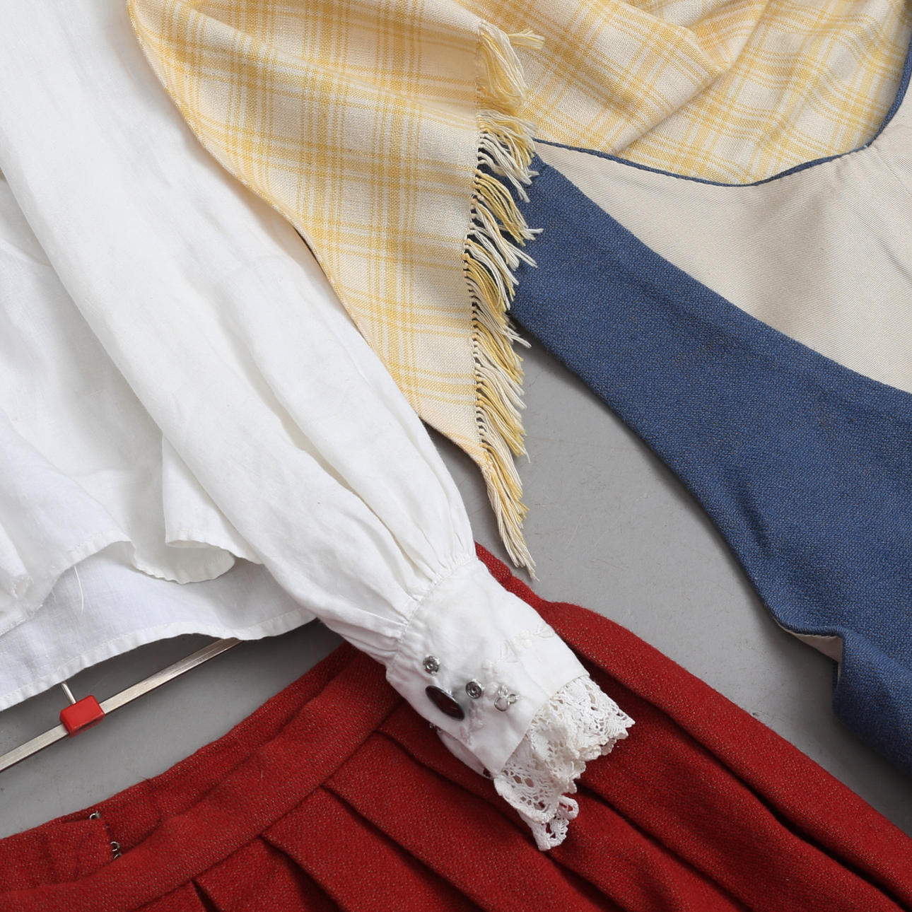6 delar bestående av kjol, förkläde, skjorta, sjal, väst, hätta.
