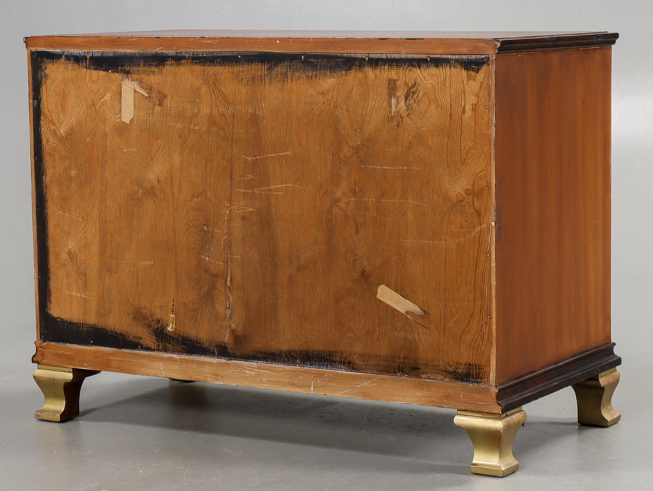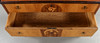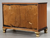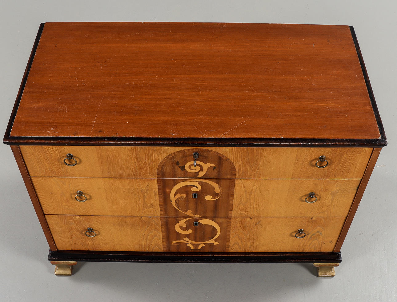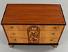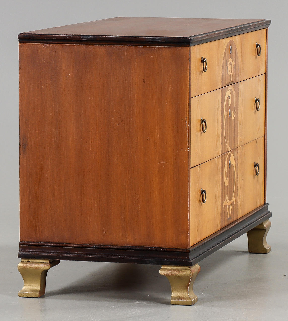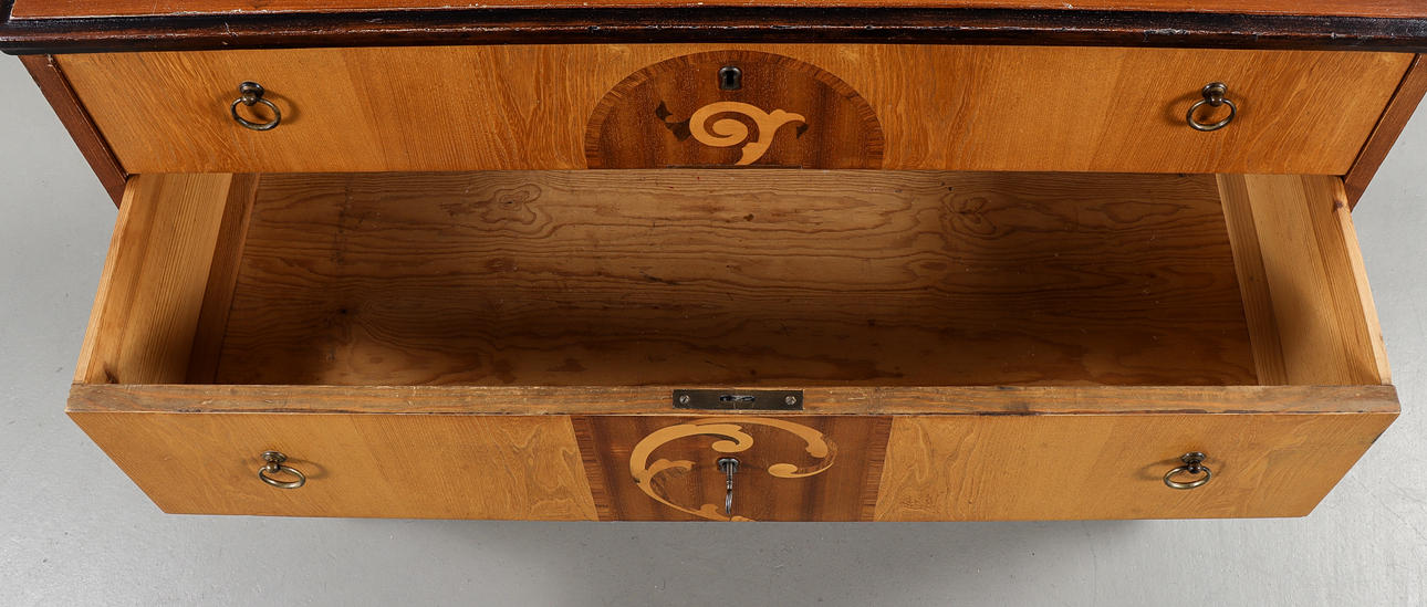 3 lådor. Bemålad stomme, lådor fanerade med bland annat alm & mahogny, intarsiadekor.