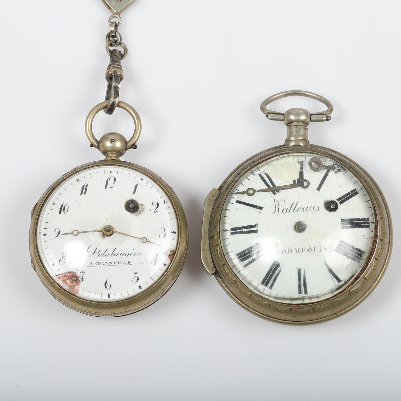 SPINDELUR, 2 stycken, vitmetall, bl. a. Wallerius Norrköping.