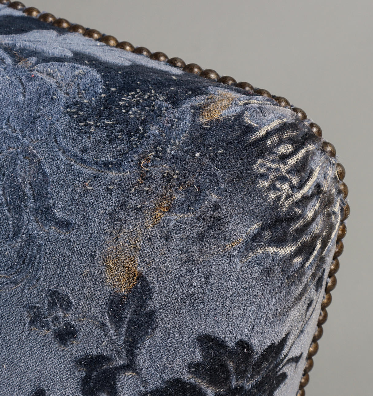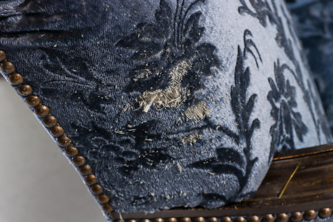 Ytslitage och skavmärken, klädsel med bitvis kraftigt slitage, fläckar.
